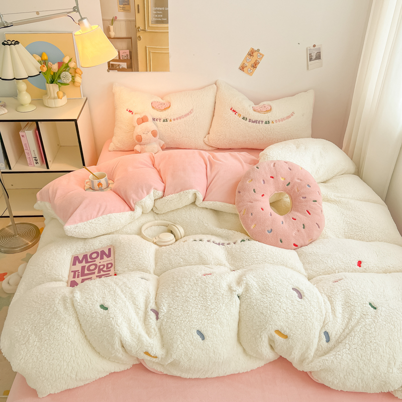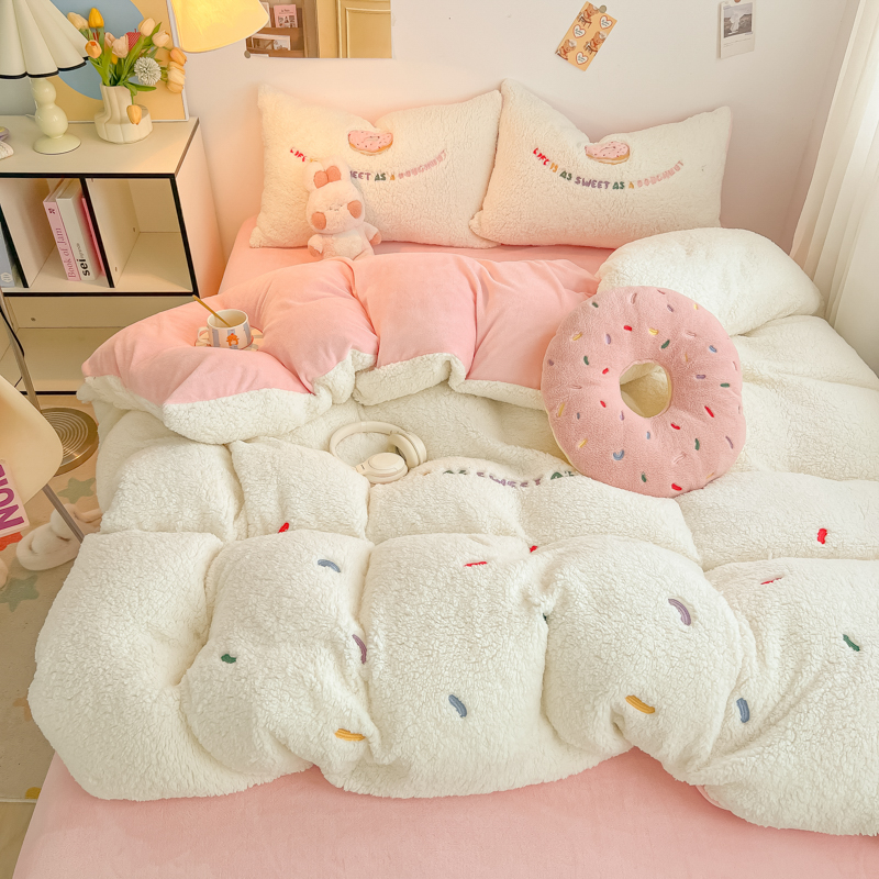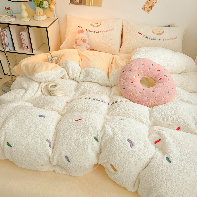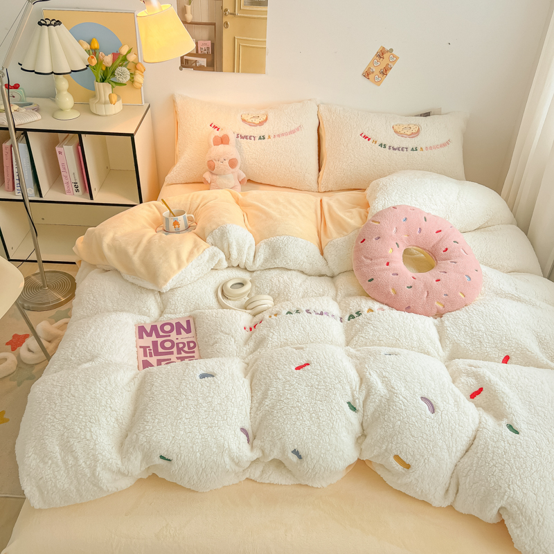 商品名称:盼季家纺 2024新款高克重羊羔绒牛奶绒刺绣四件套-甜甜圈(风格一) 甜甜圈-奶黄