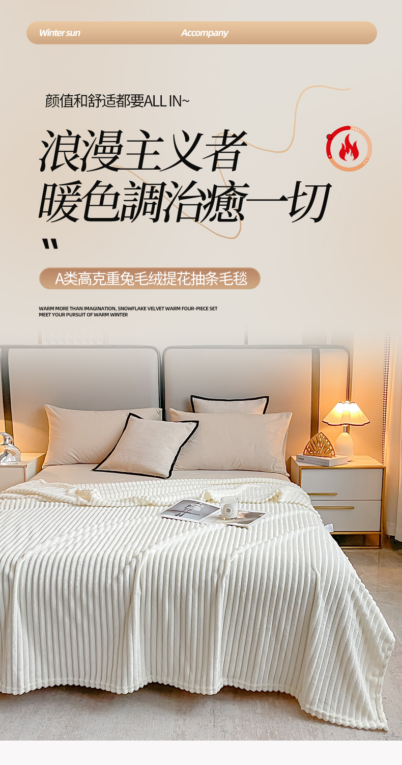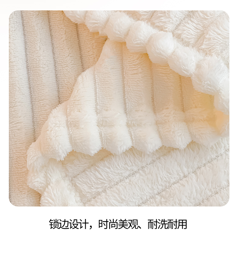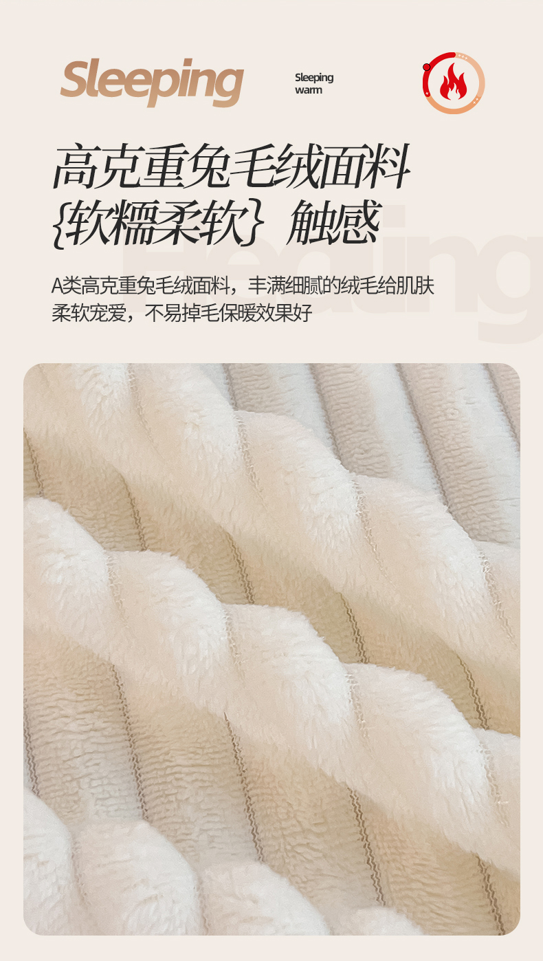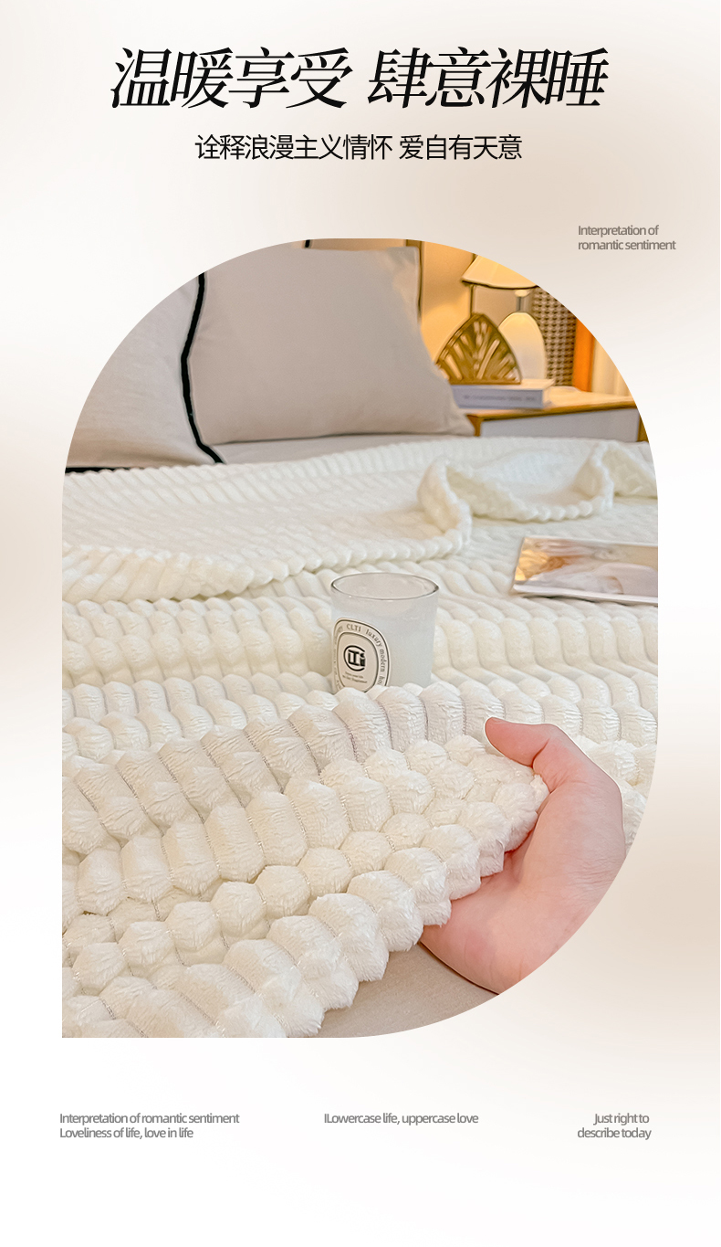商品名称:一帆毯业 2024新款抽条压缩代发抽空跨境外贸260克兔毛珊瑚法兰绒空调毯子抽条毛毯简约牛奶绒盖毯 奶昔白