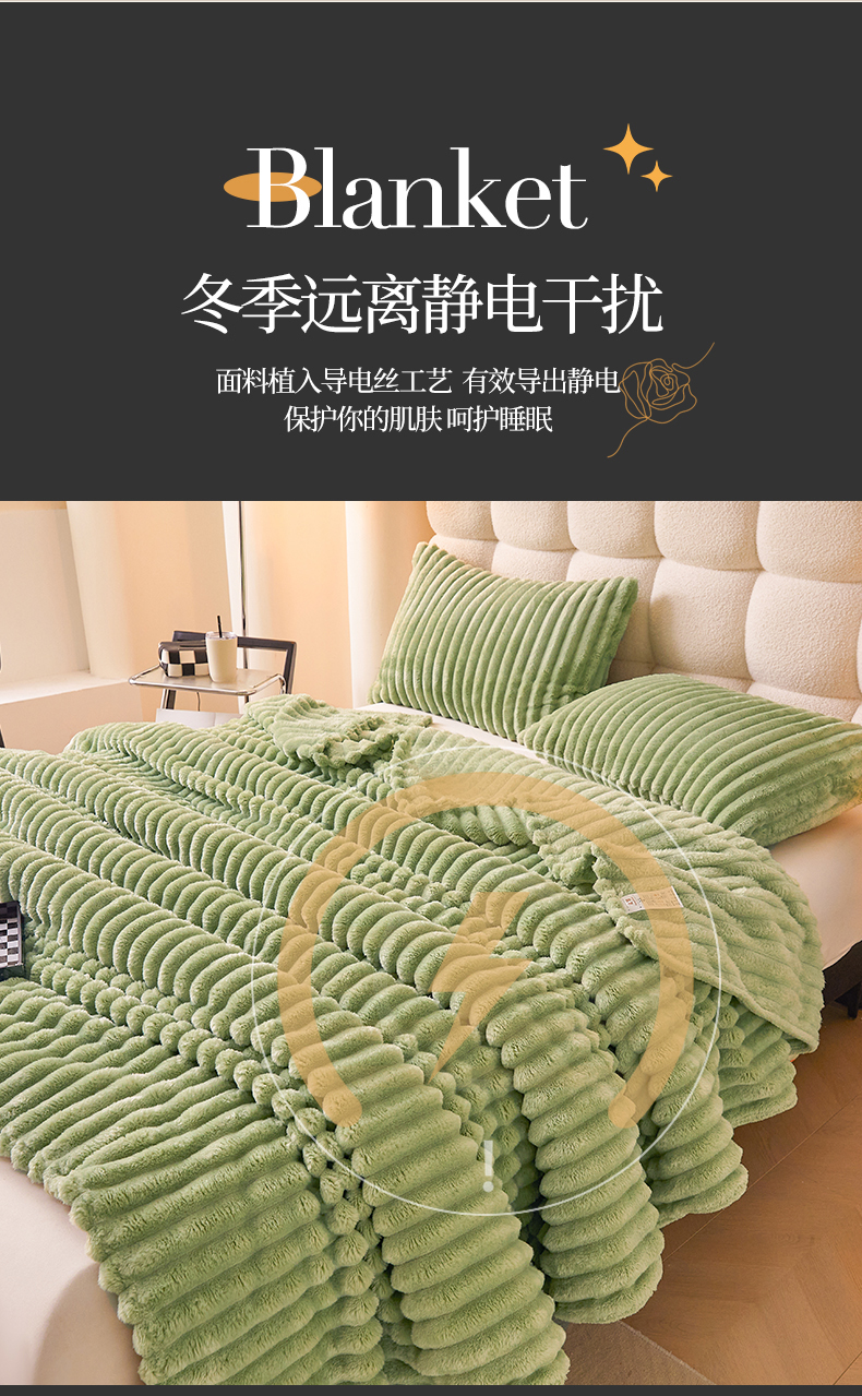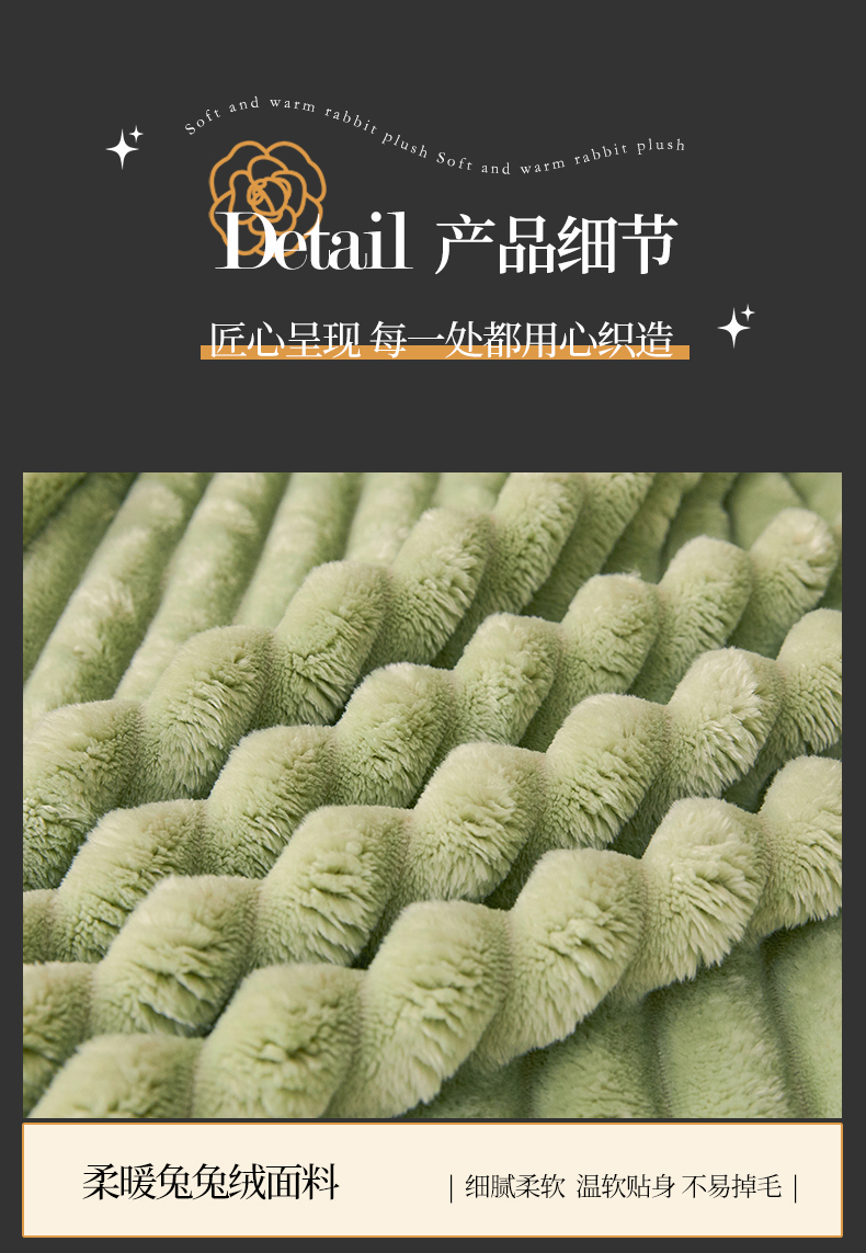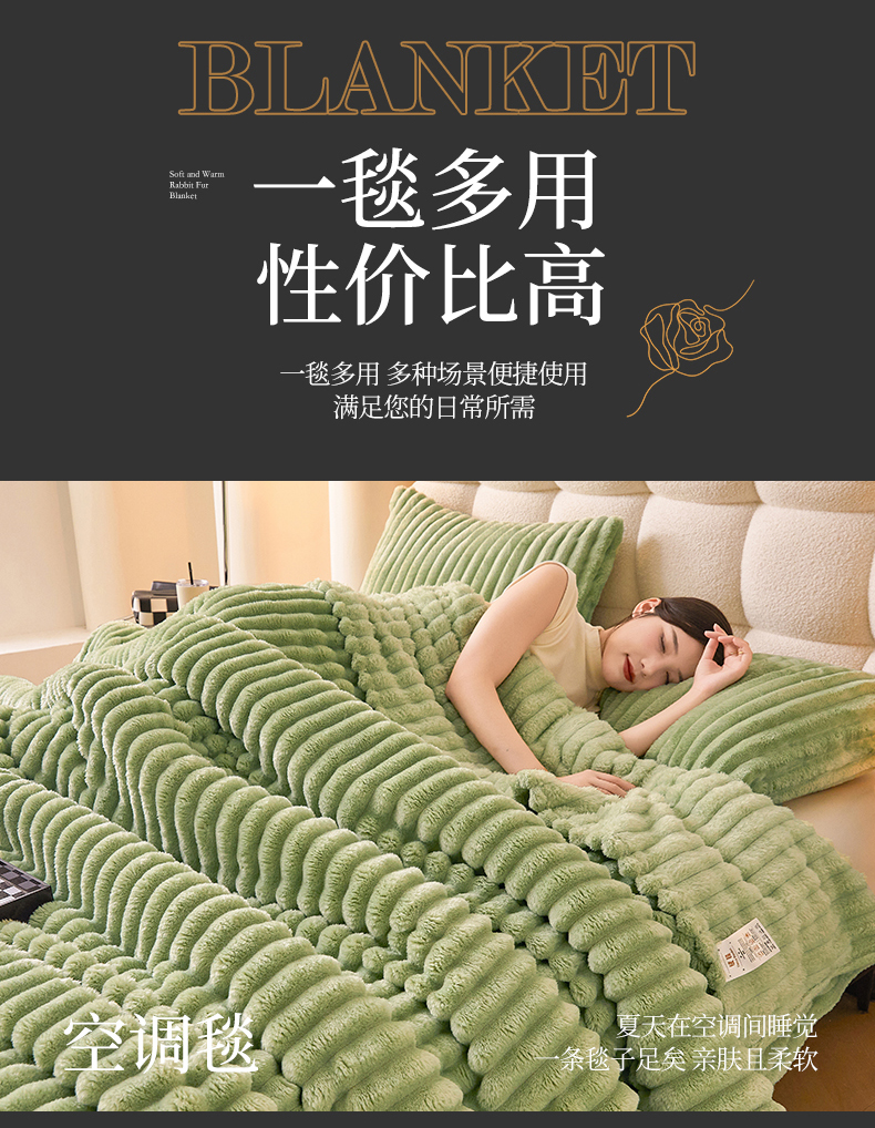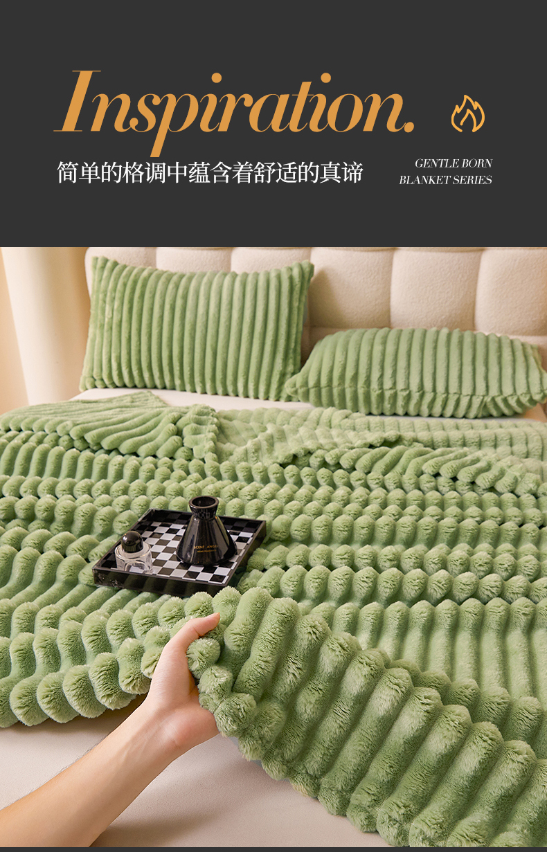 梵心家纺 跨境兔毛绒抽条毛毯高克重法兰绒毛毯跨境外贸直播 橄榄绿