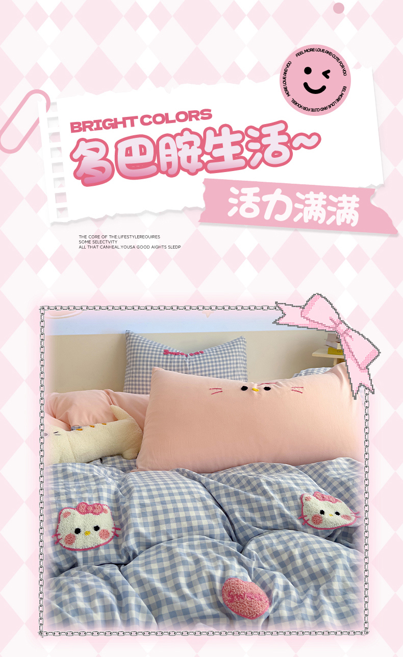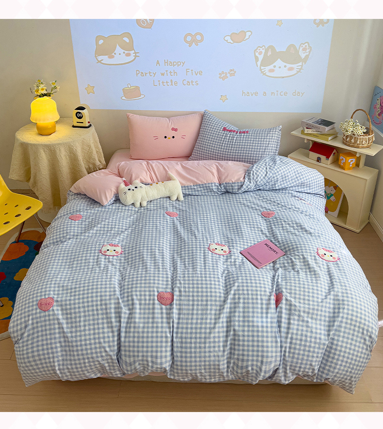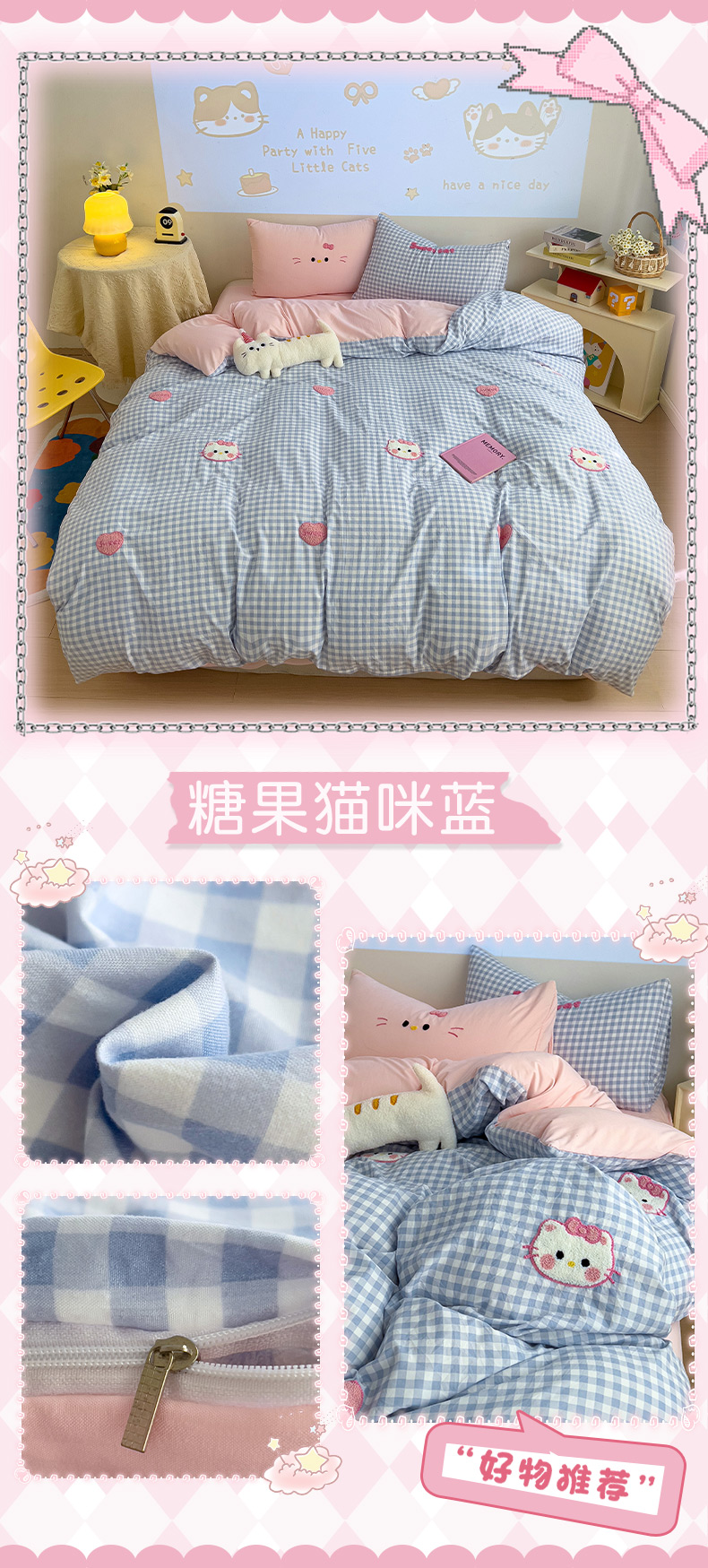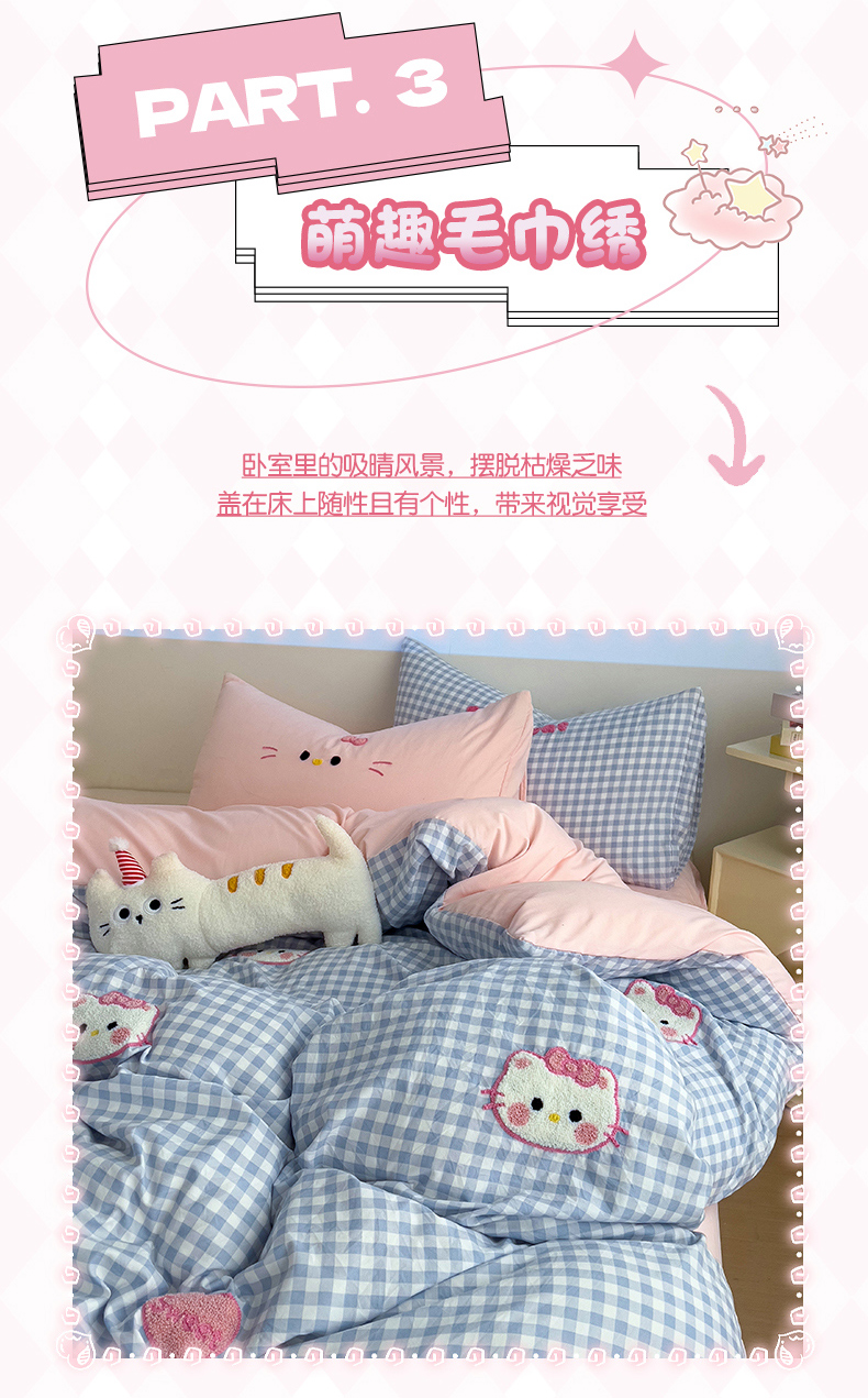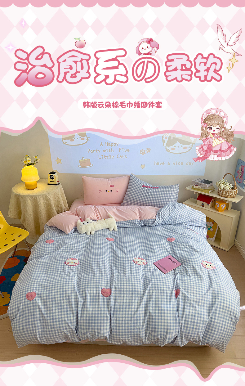 当前位置: 91家纺网 > 商品网购 > 床品套件 > 四件套 > 毛巾绣四件套 > 罗亿家纺 2025新款格子卡通云朵棉毛巾绣四件套场景一(提供买家秀) 糖果猫咪蓝