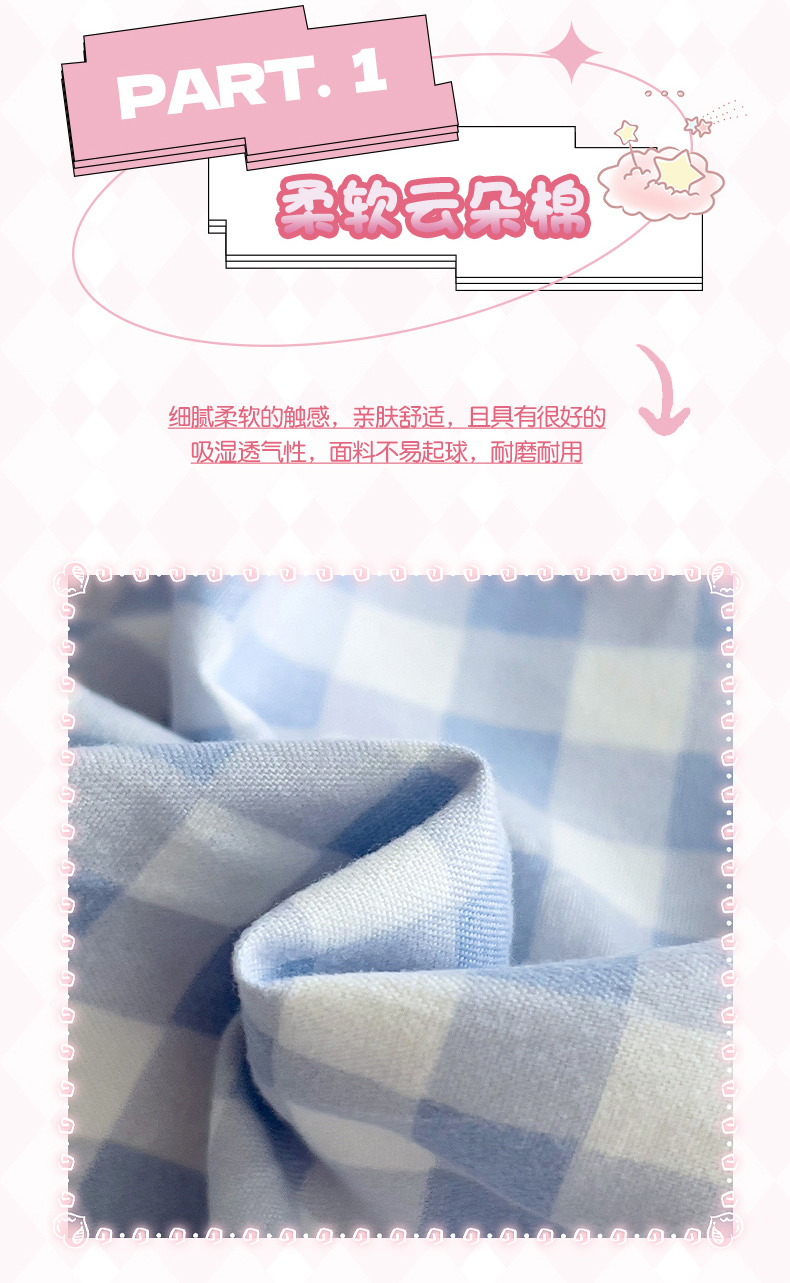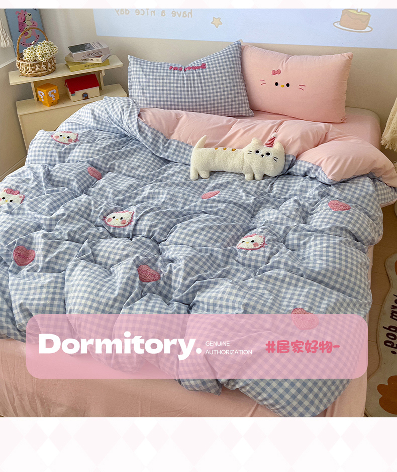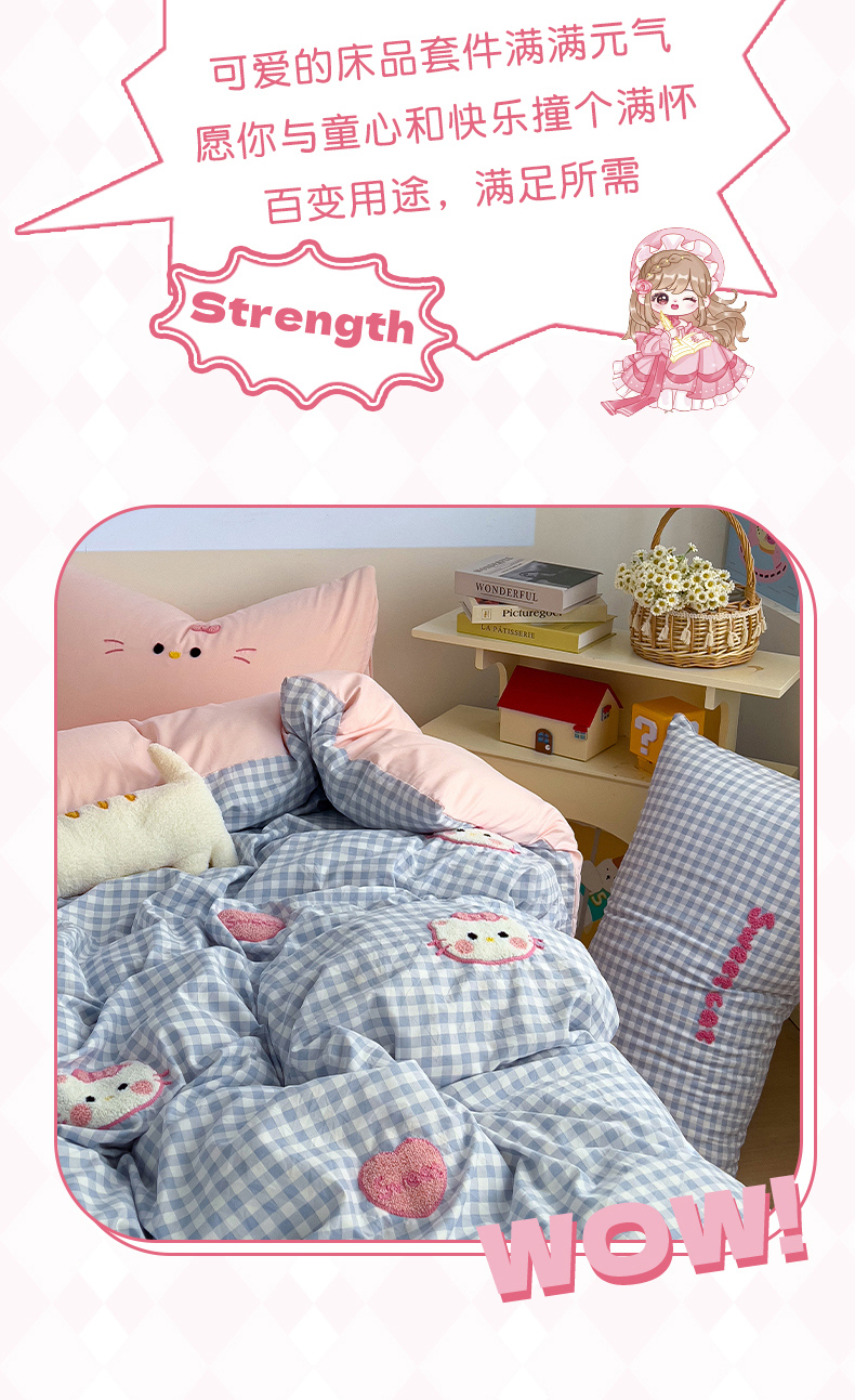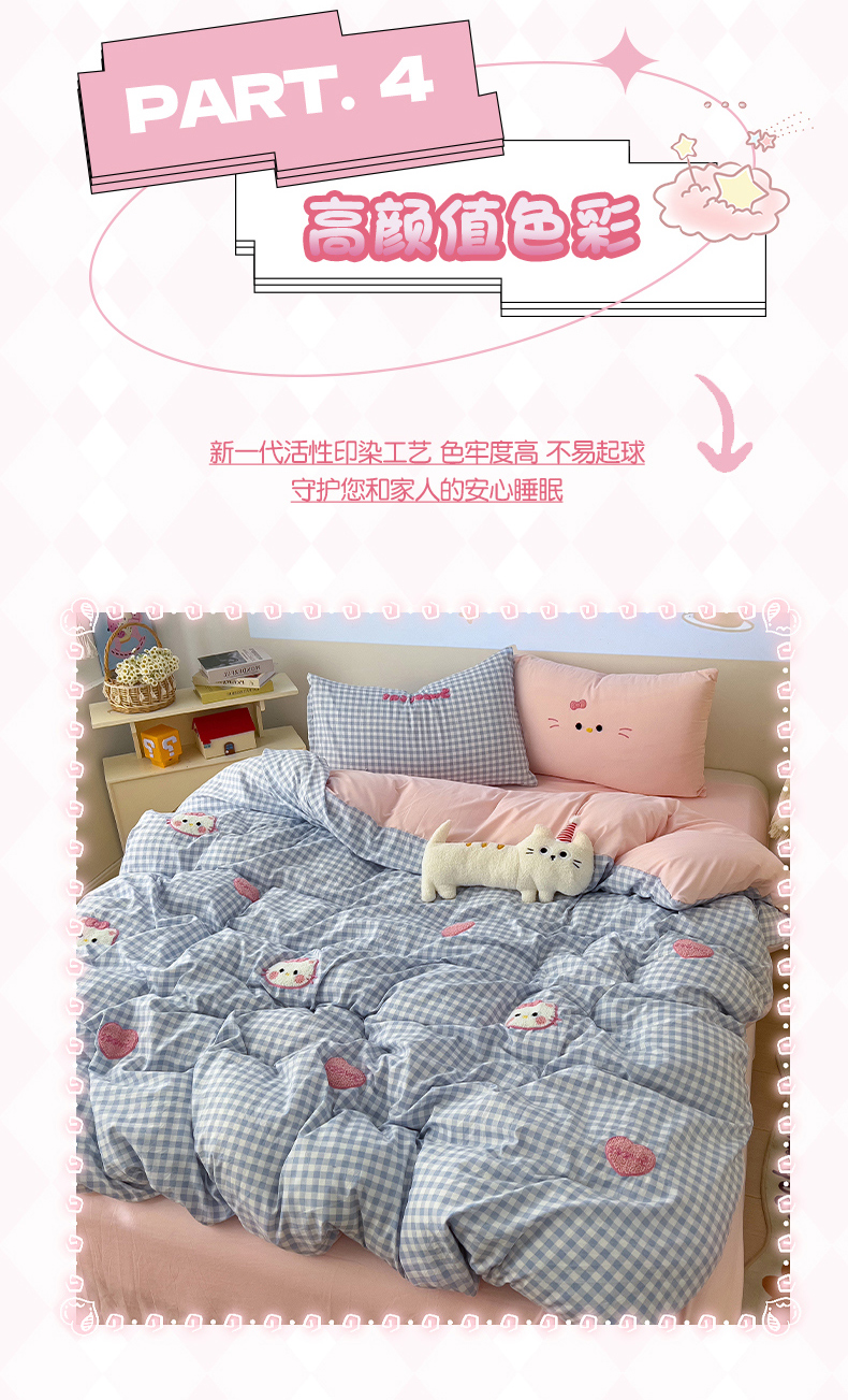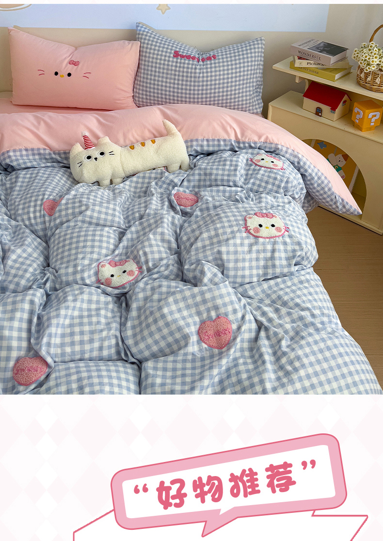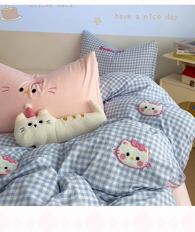 当前位置: 91家纺网 > 商品网购 > 床品套件 > 四件套 > 毛巾绣四件套 > 罗亿家纺 2025新款格子卡通云朵棉毛巾绣四件套场景一(提供买家秀) 糖果猫咪蓝