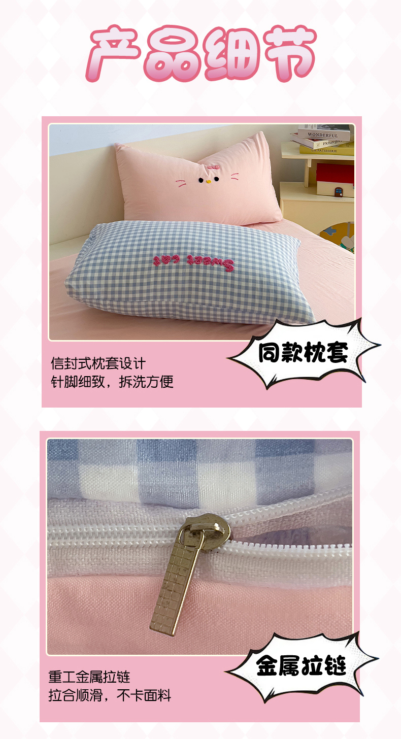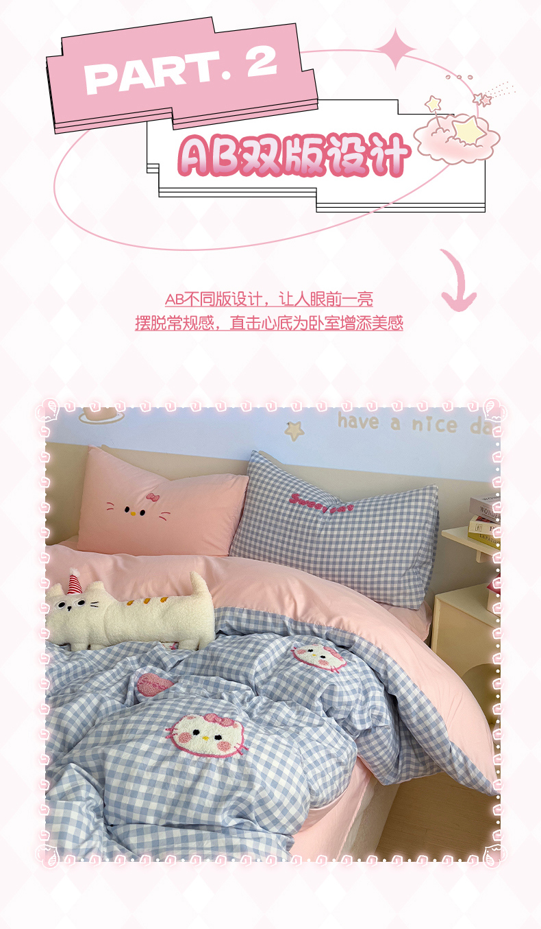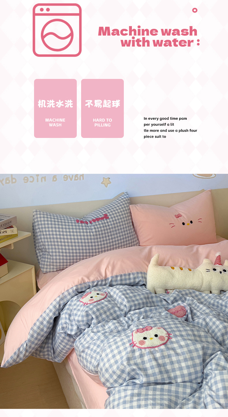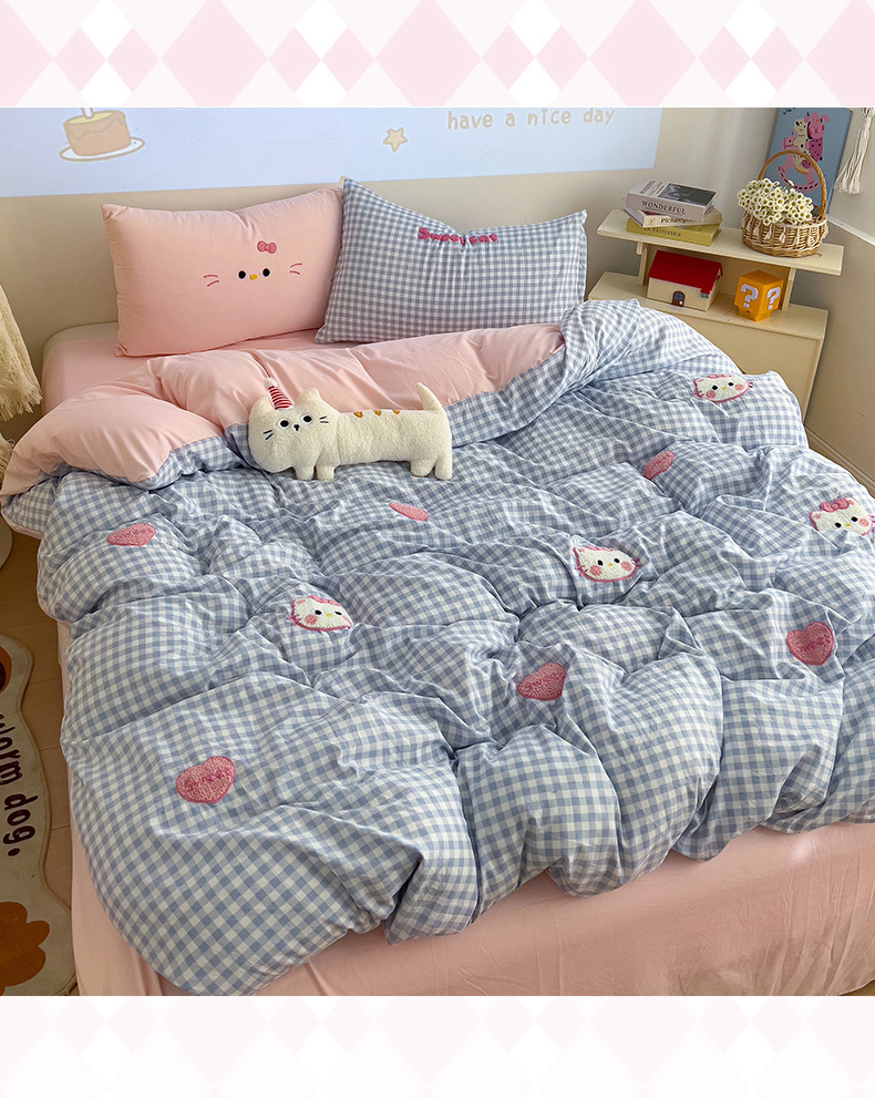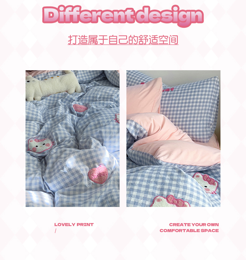 当前位置: 91家纺网 > 商品网购 > 床品套件 > 四件套 > 毛巾绣四件套 > 罗亿家纺 2025新款格子卡通云朵棉毛巾绣四件套场景一(提供买家秀) 糖果猫咪蓝