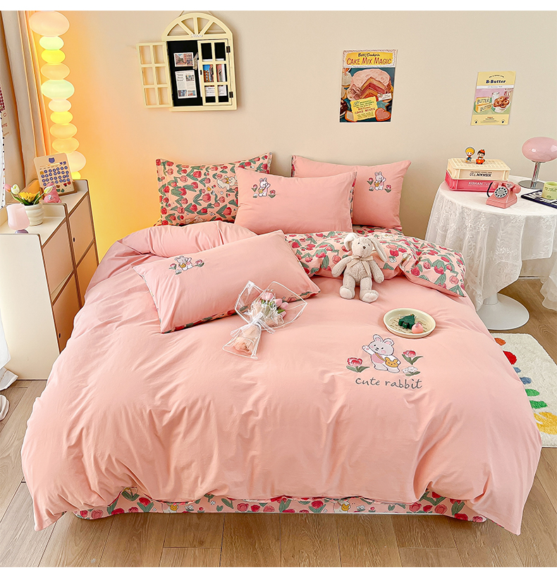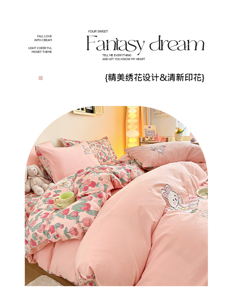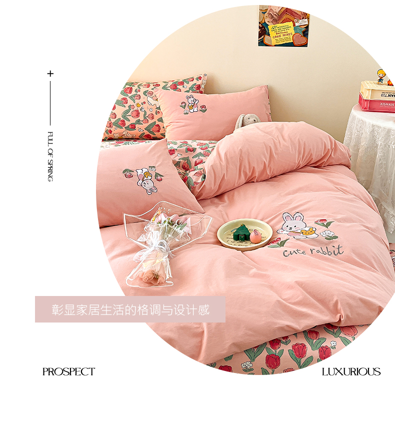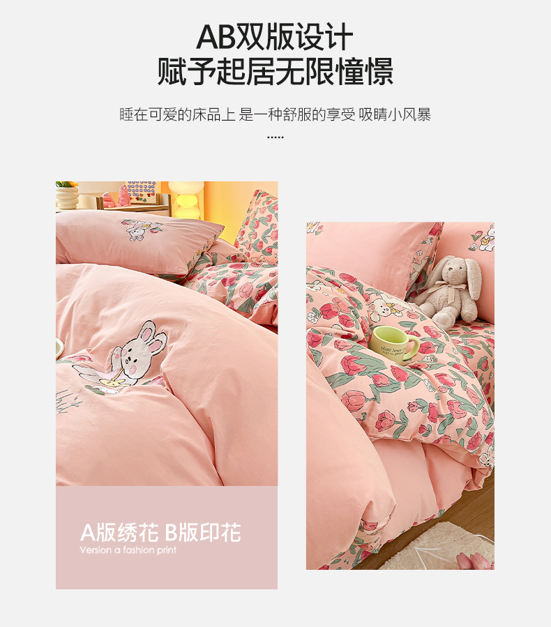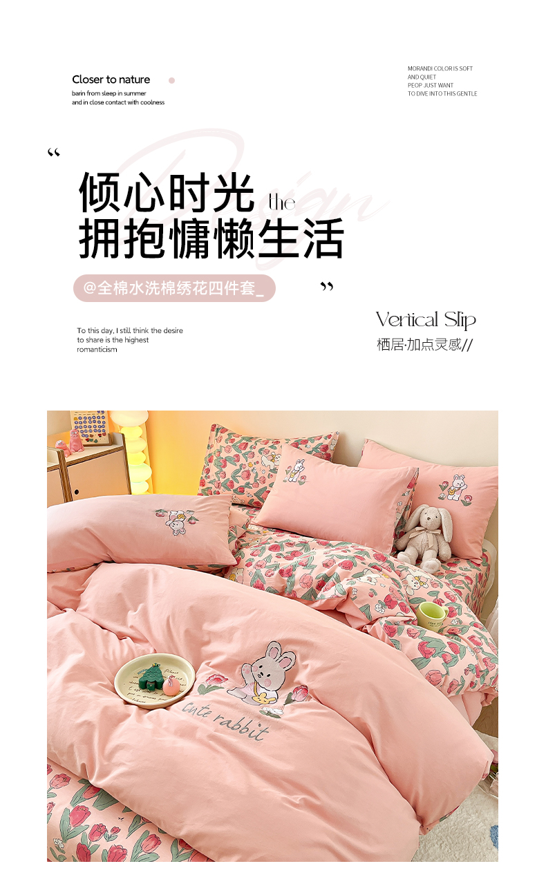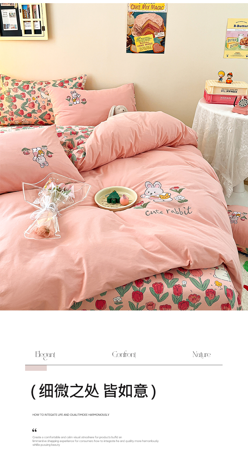 雅居纺家纺 2025新款全棉水洗棉绣花四件套 小兔兔