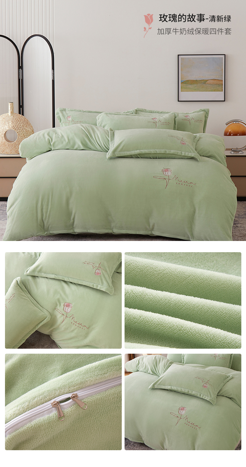 (买家秀 爆款不断货)A类母婴级牛奶绒刺绣四件套珊瑚绒四件套雪花绒四件套刺绣牛奶绒四件套纯色牛奶绒套 玫瑰-清新绿