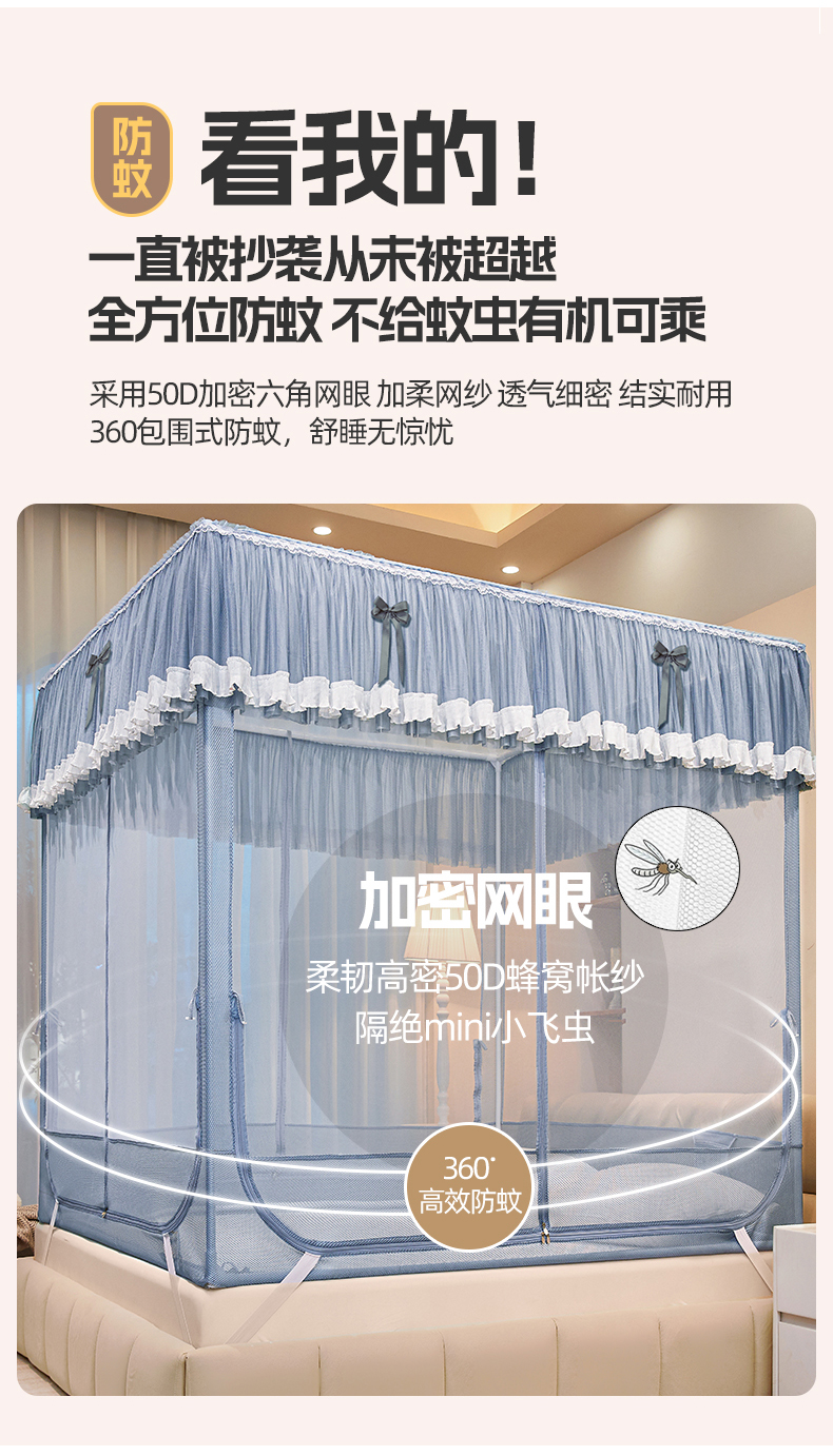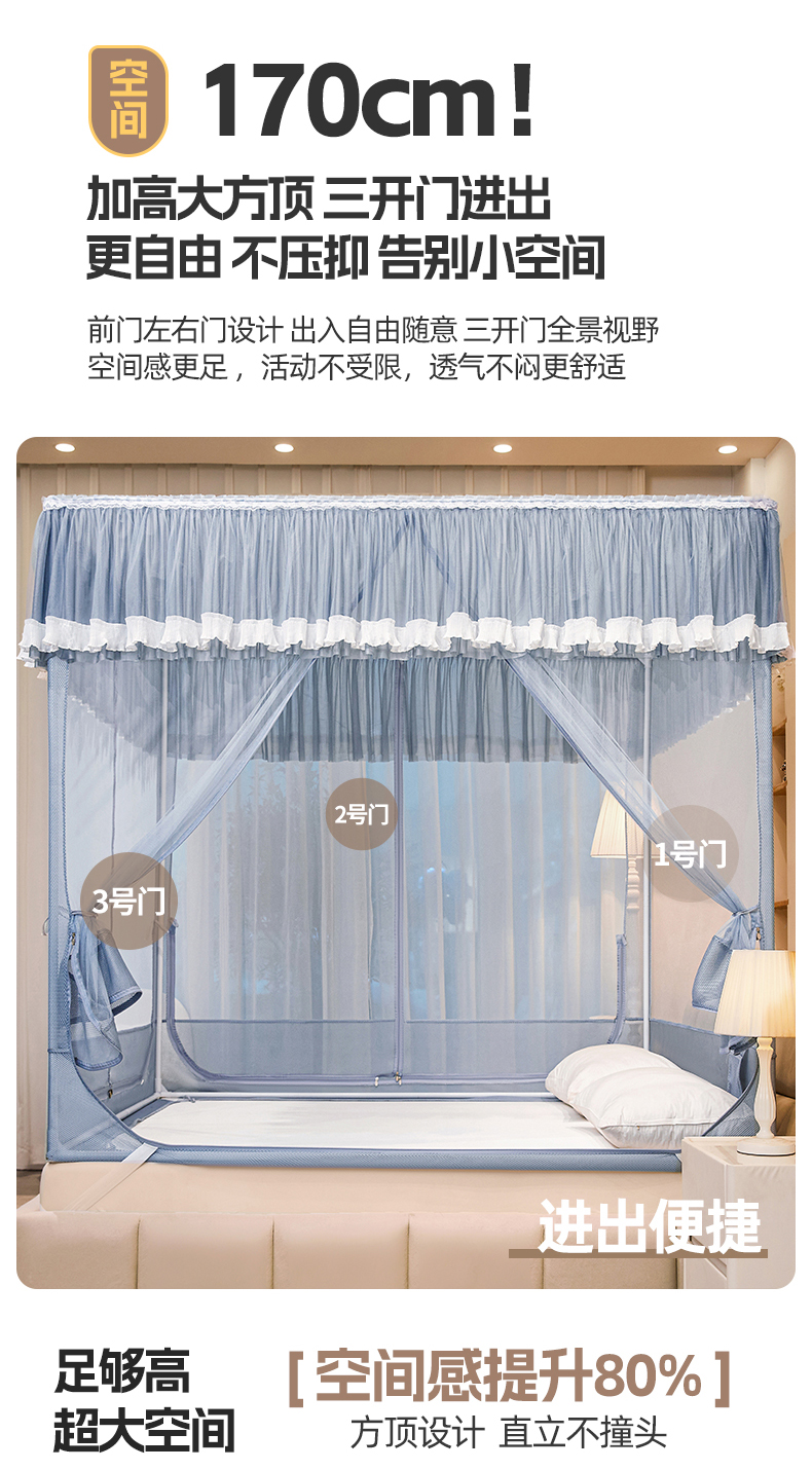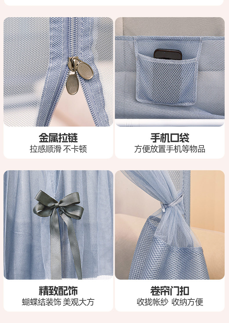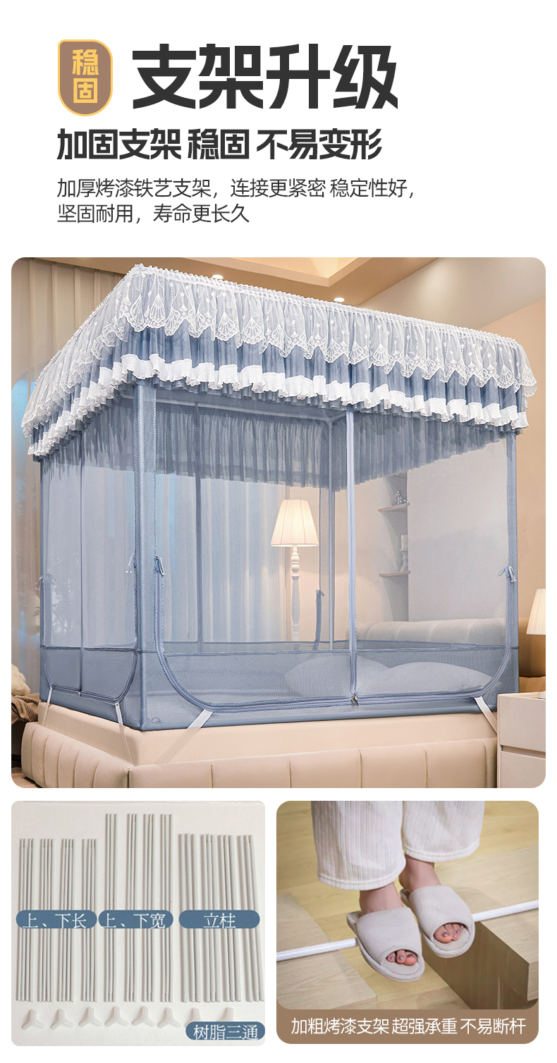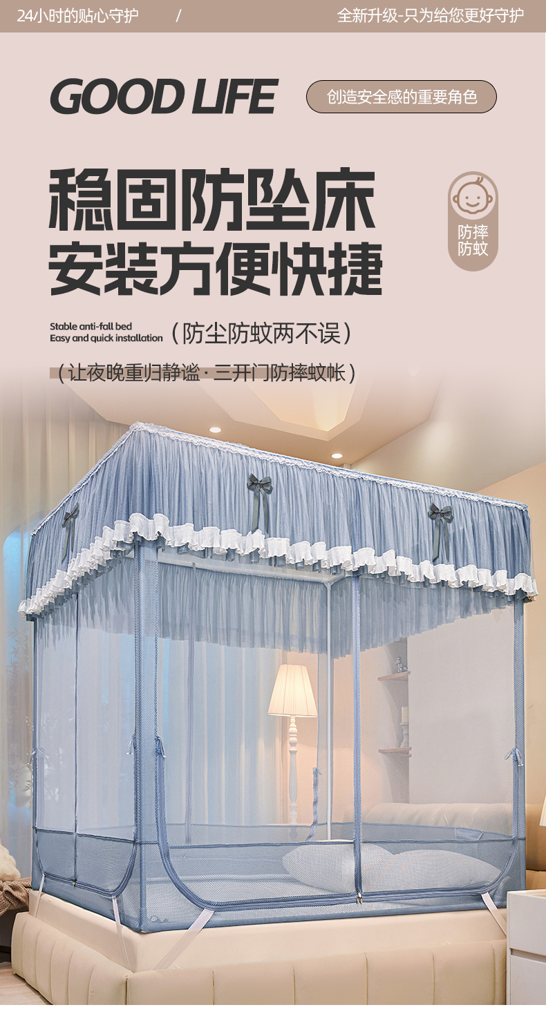 当前位置: 91家纺网 > 商品网购 > 床上用品 > 蚊帐 > 坐床式蚊帐 > 夏彩 2025新款浪漫唯美T+U大空间坐床防摔蚊帐-88608 88608T-蓝灰