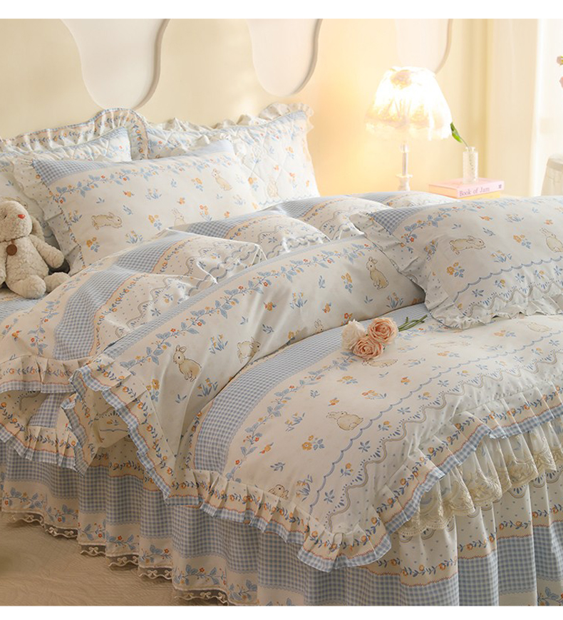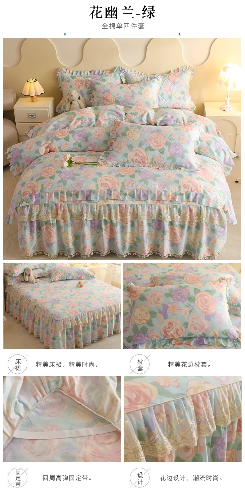 (总)美达家纺 2025新款全棉纯棉AB版蕾丝小花边单层床裙四件套,解语花,南湘,沁雨花叶,悦棠