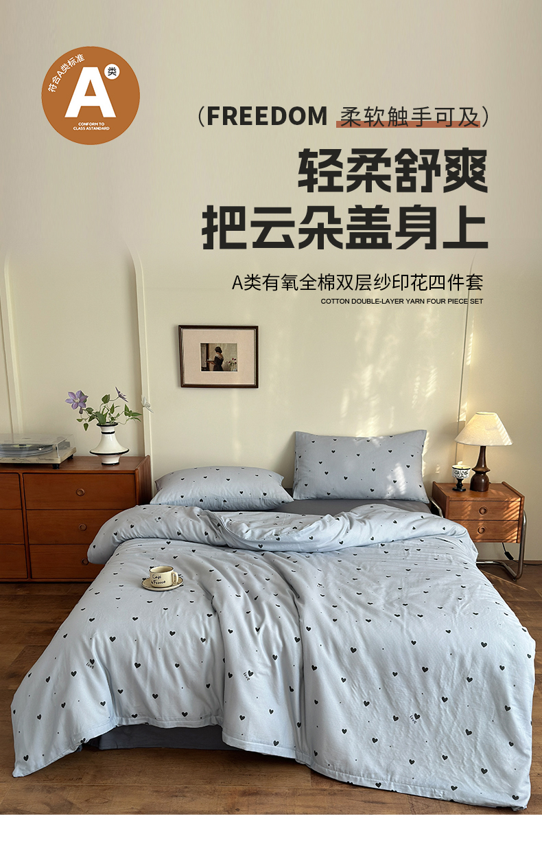 当前位置: 91家纺网 > 商品网购 > 床品套件 > 四件套 > 双层纱四件套 > 亿梵家居 2025新款A类母婴级有氧全棉纯棉双层纱纯棉印花四件套-床拍图 心恋-灰