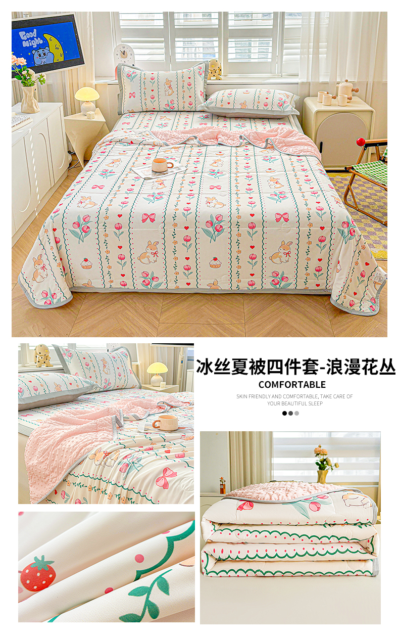 • 91家纺网 家纺一手货源 找家纺 雯豆2025夏季新品冰丝碳光凉席+凉感丝印花夏被四件套卡通小清新绑带席子四件套 冰丝夏被四件套-浪漫花丛
