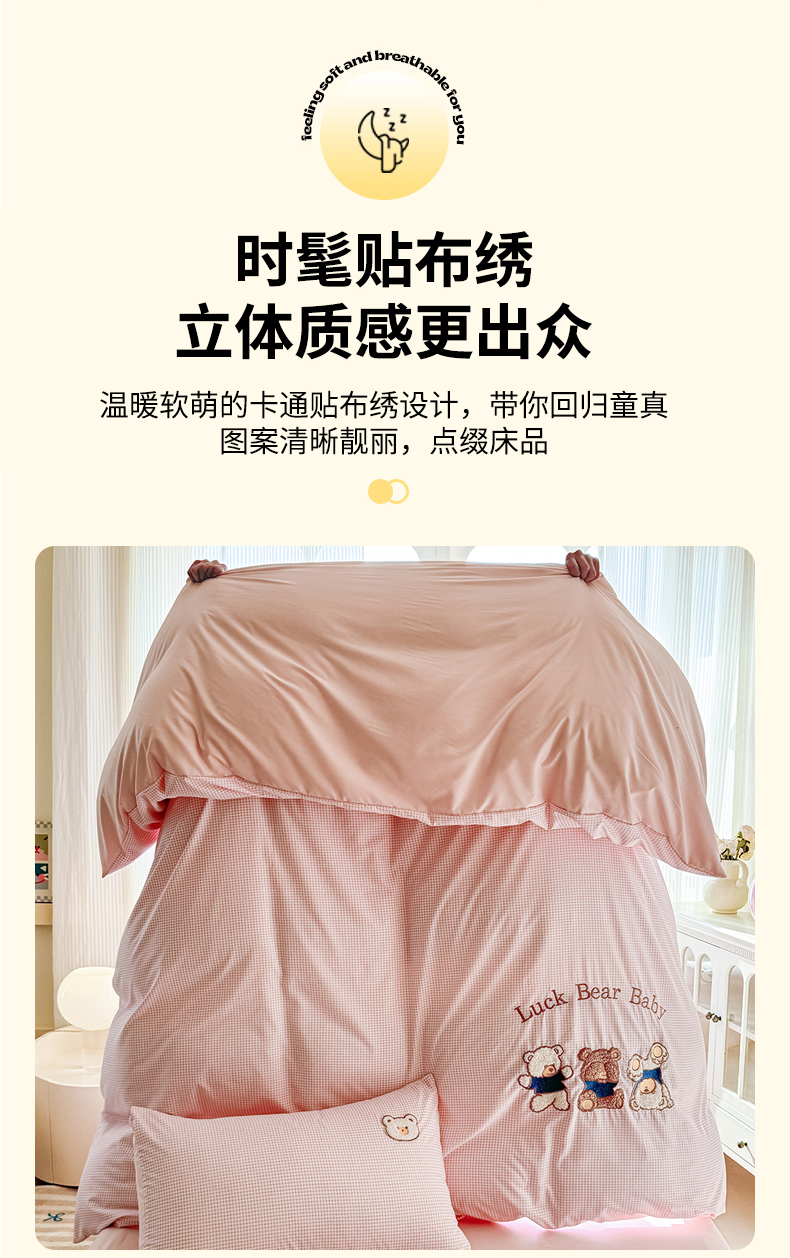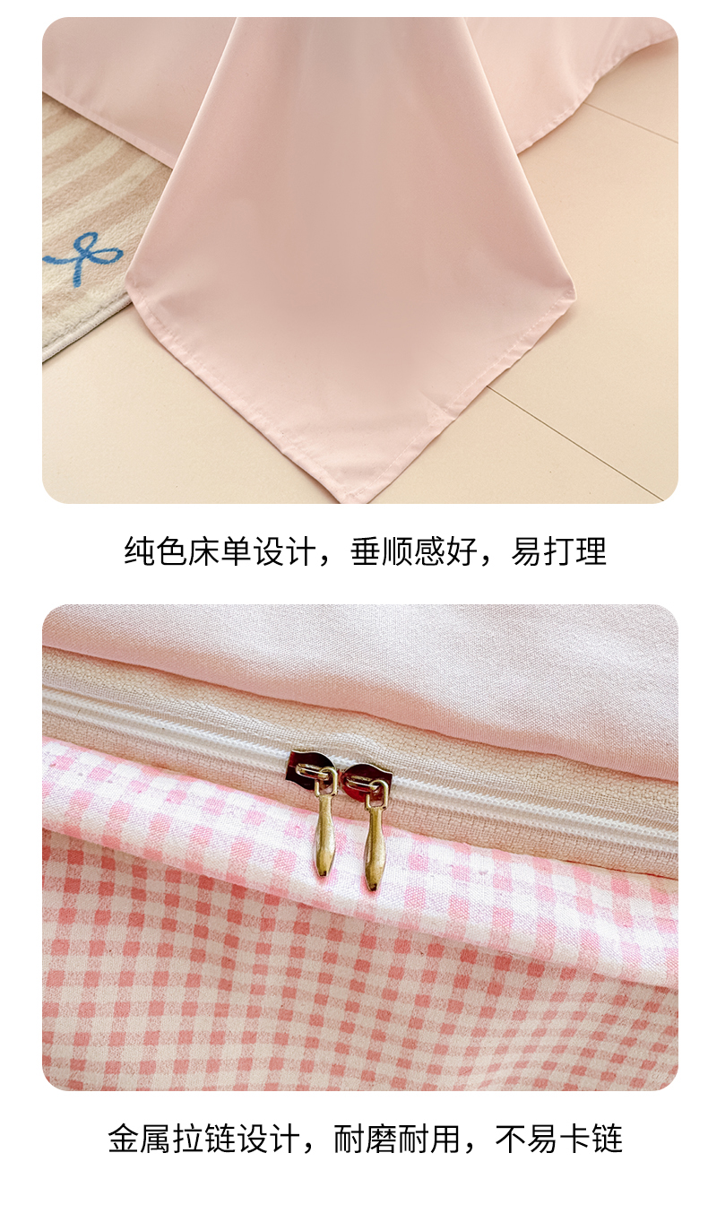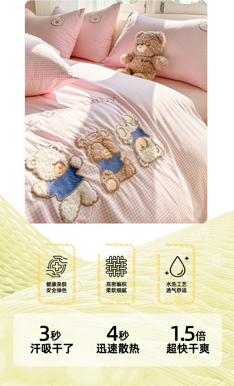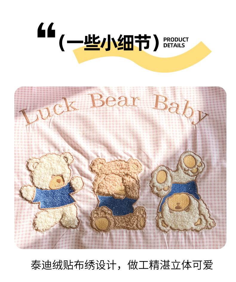 商品名称:2025春夏新款水洗棉刺绣四件套-三只小熊 粉格三只小熊