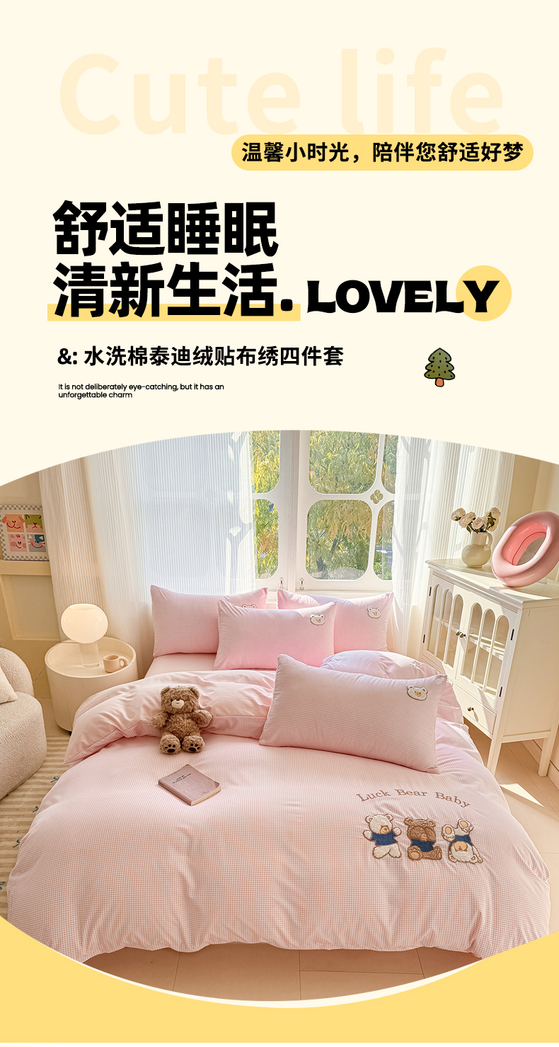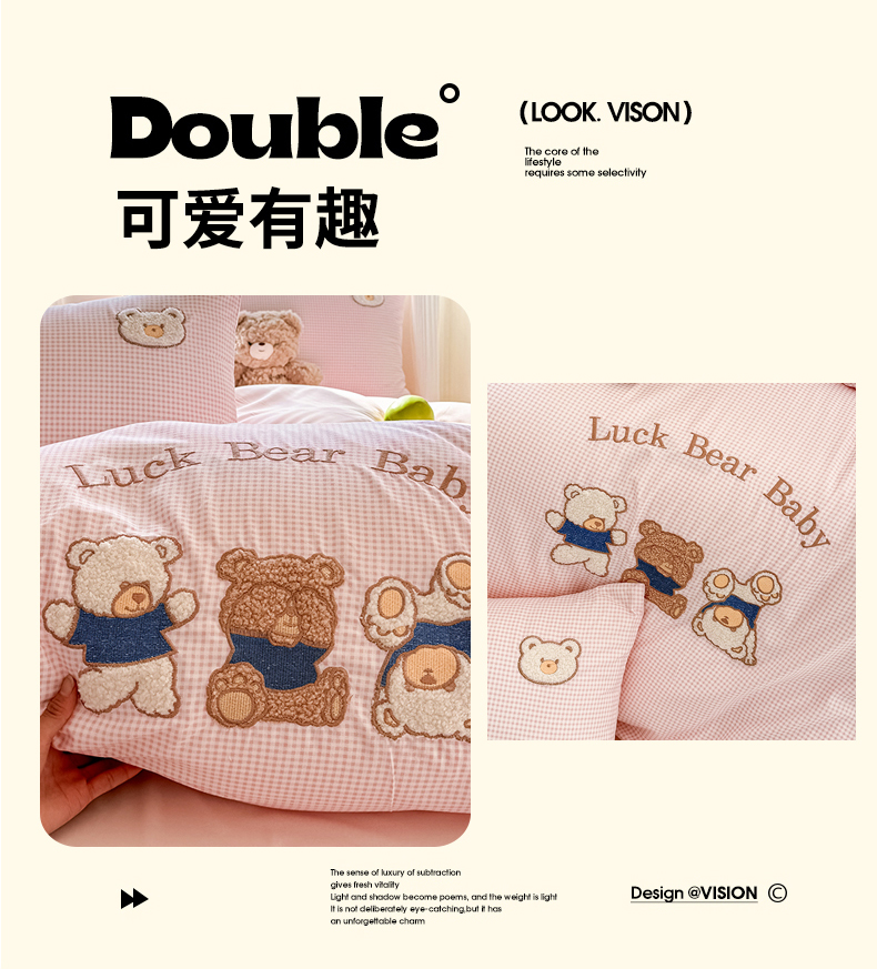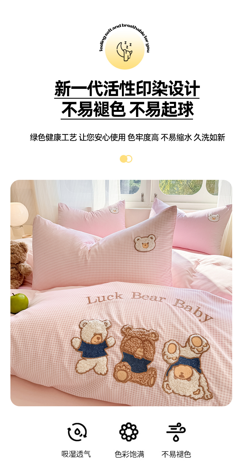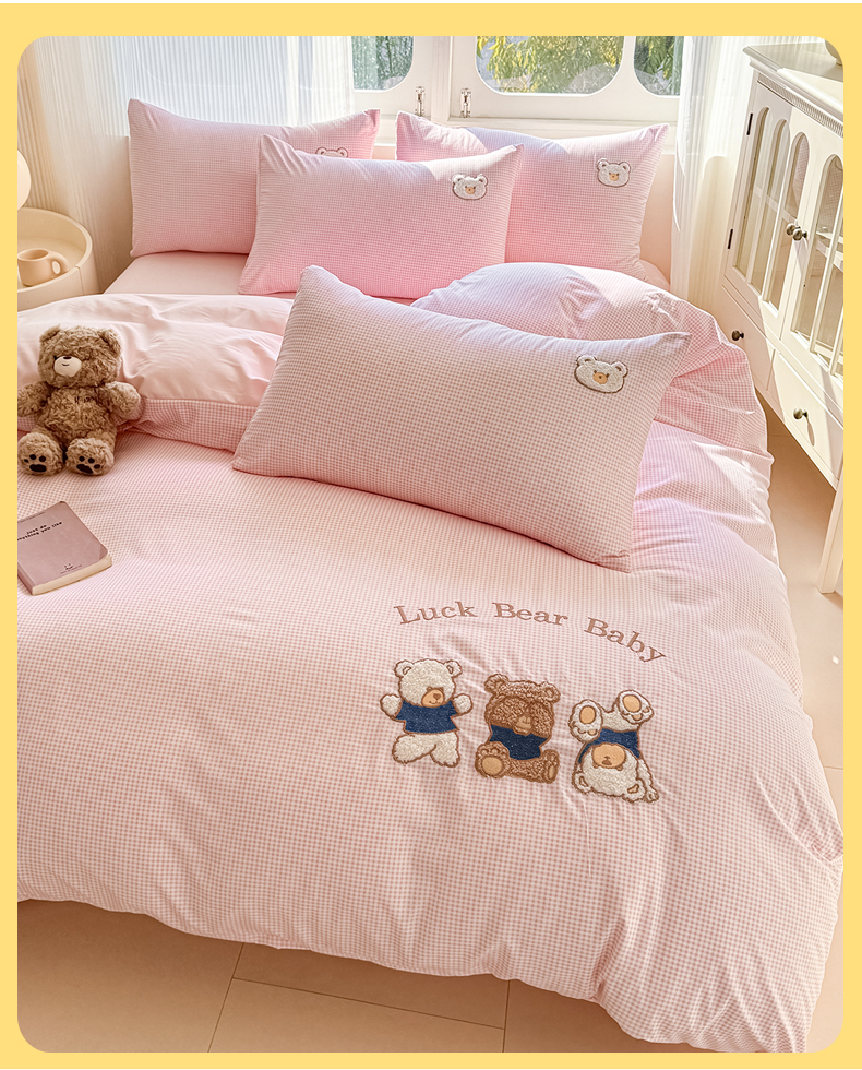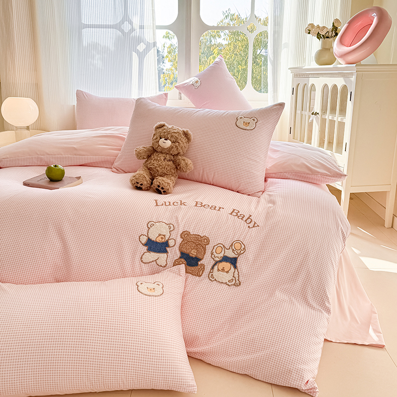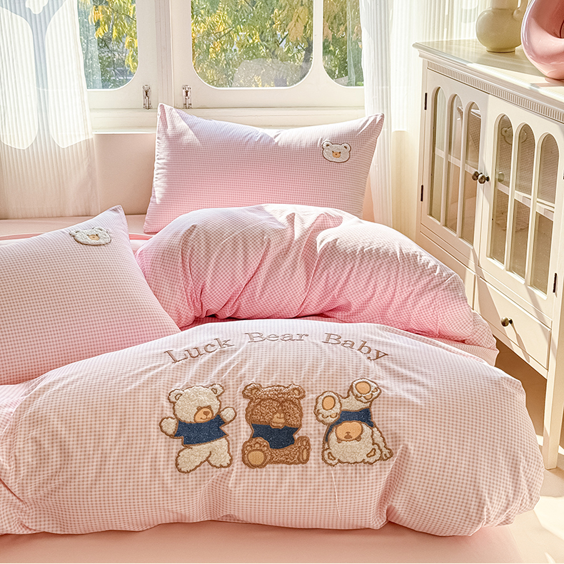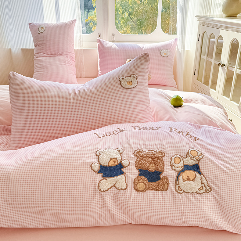 2025春夏新款水洗棉刺绣四件套-三只小熊 粉格三只小熊