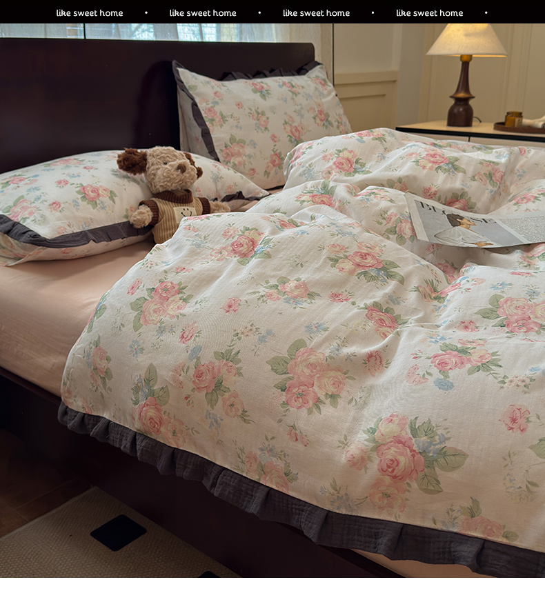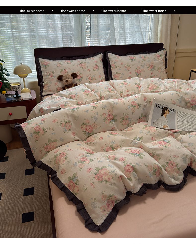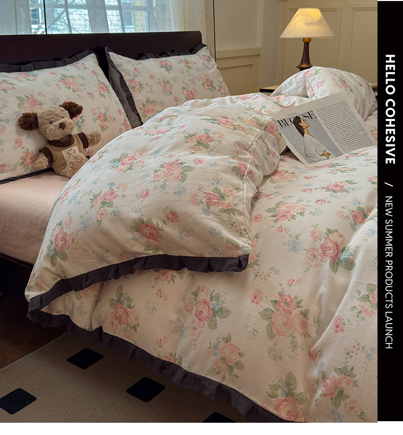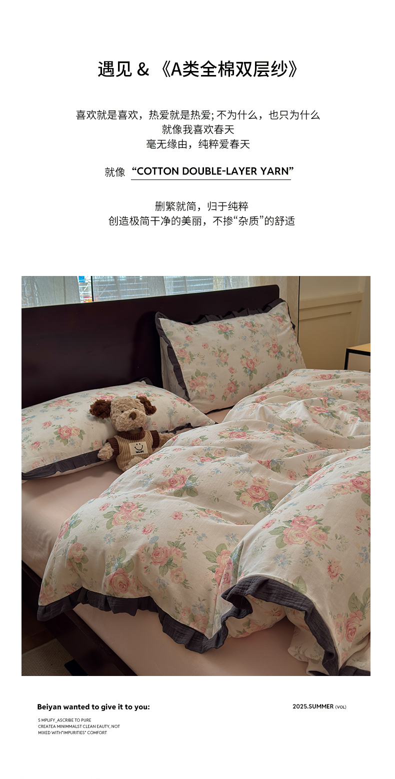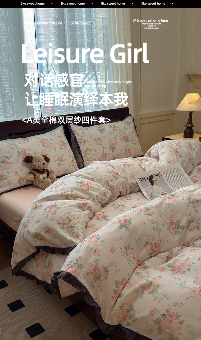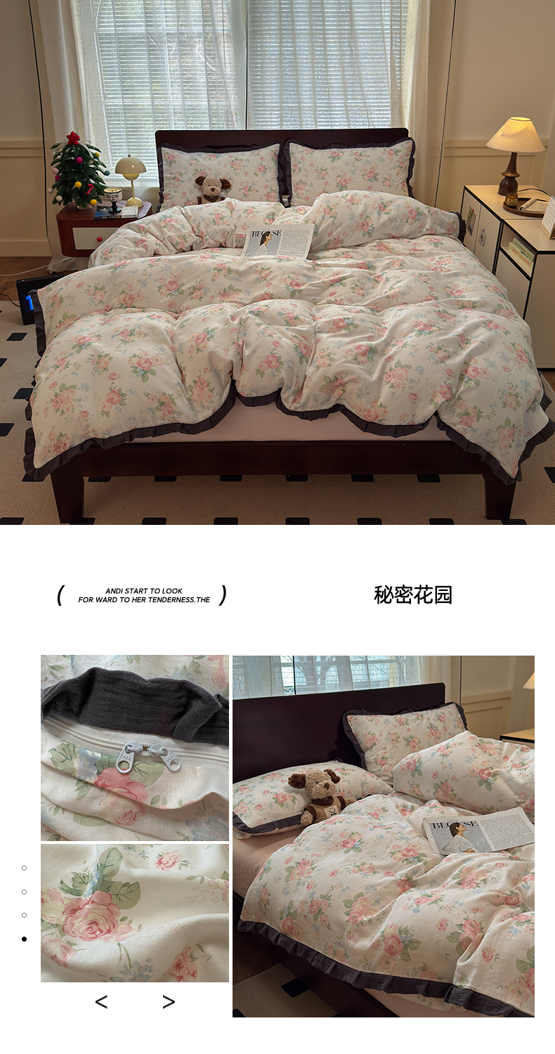 曼之夏 2025春夏新款A类全棉纯棉邹邹纱花边款四件套 秘密花园