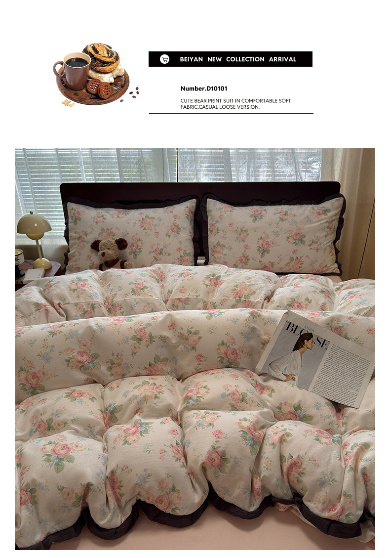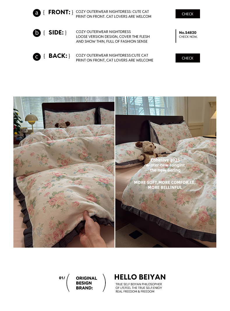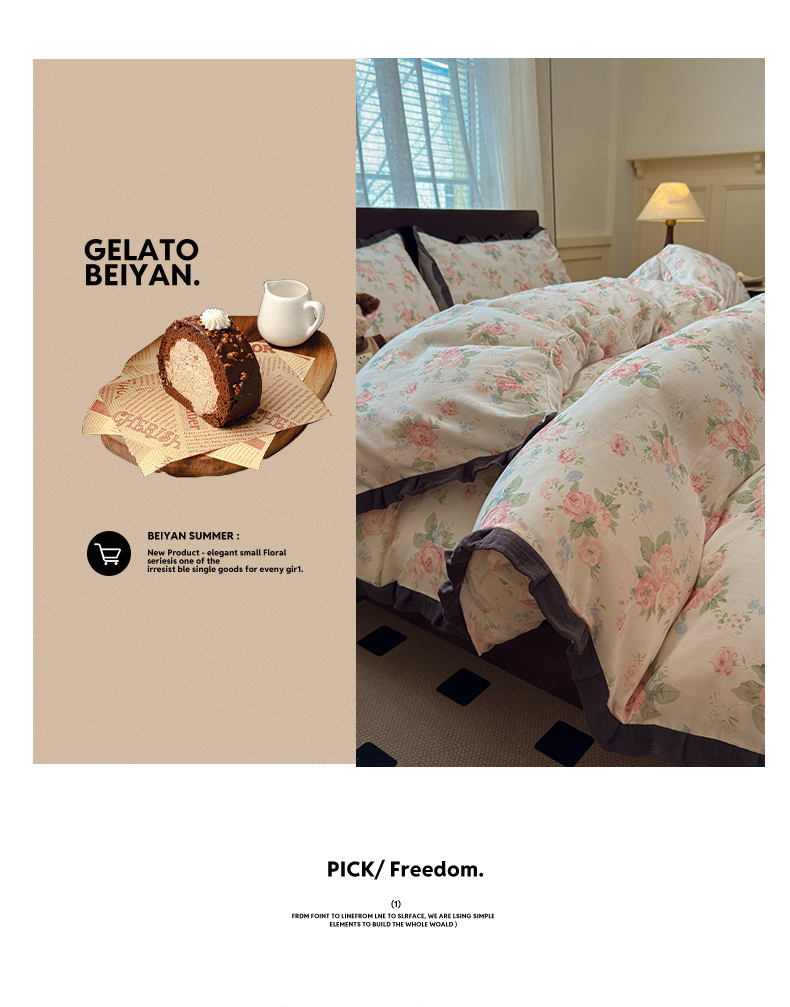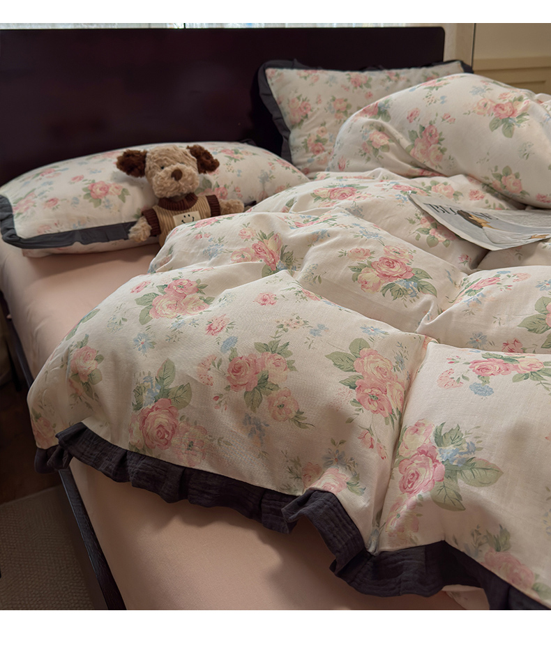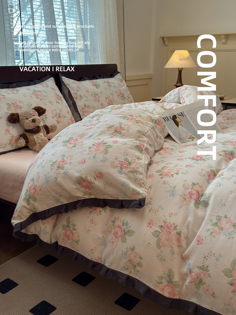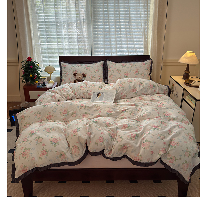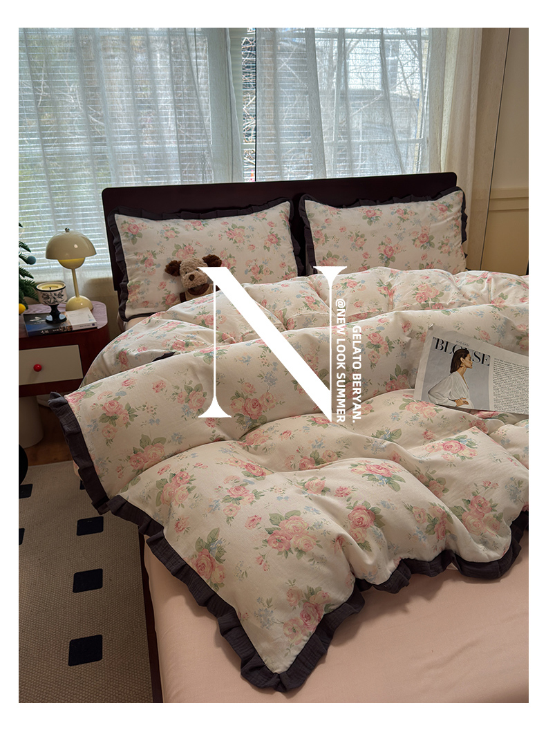 曼之夏 2025春夏新款A类全棉纯棉邹邹纱花边款四件套 秘密花园