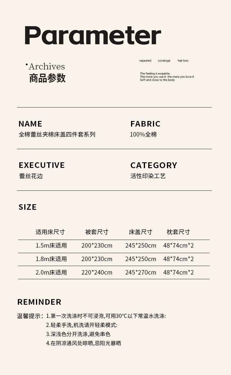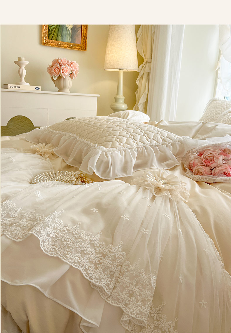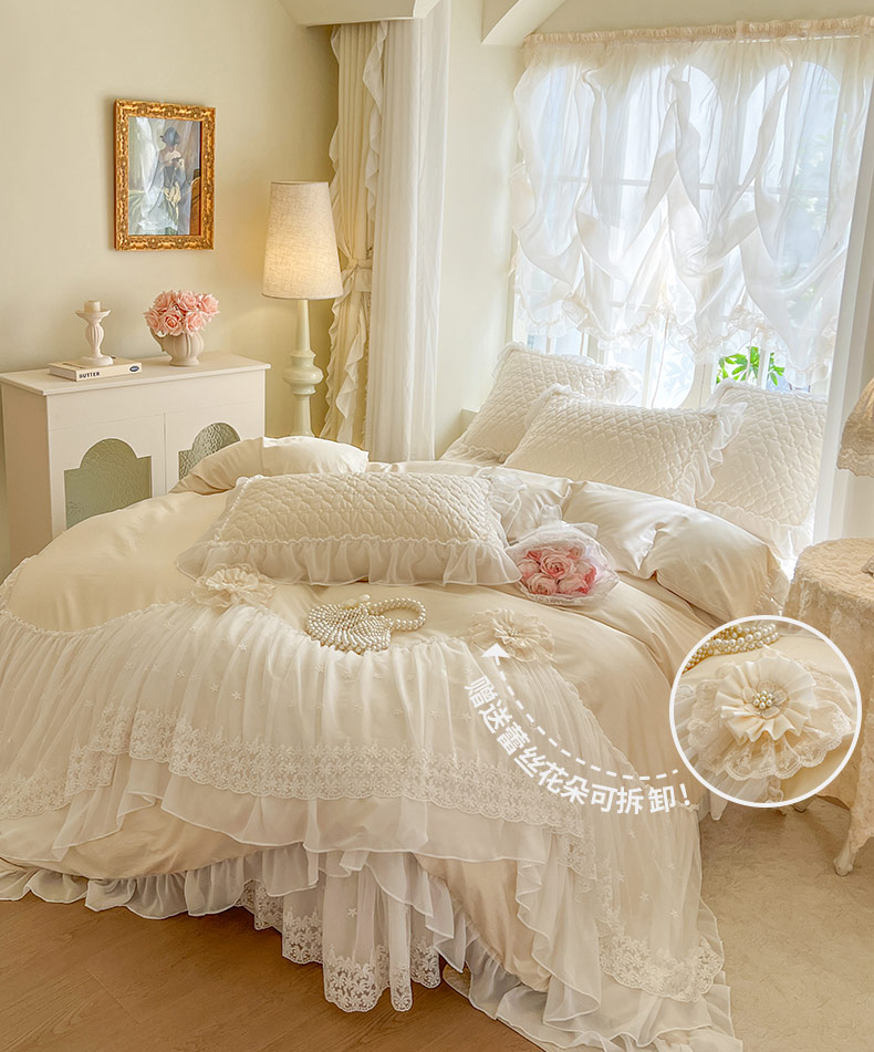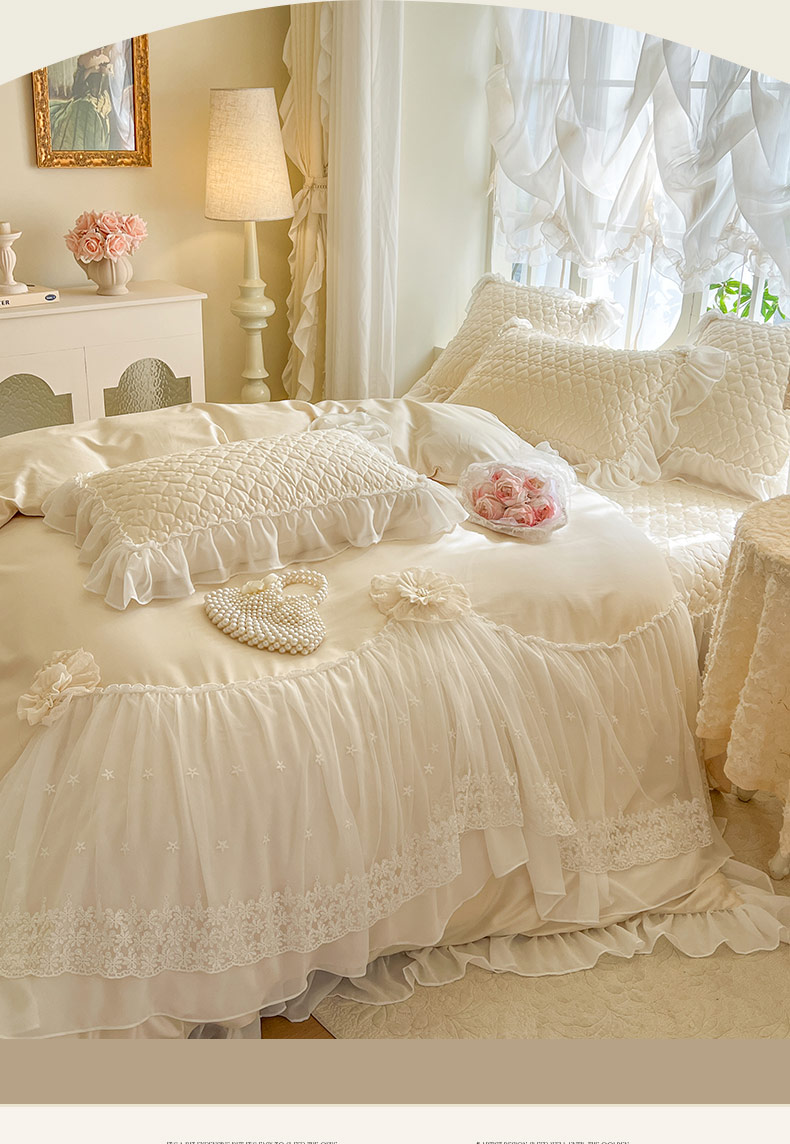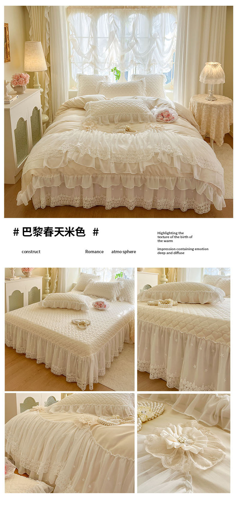 商品名称:亲亲公主家纺2025新款100支长绒棉全棉蕾丝夹棉床盖四件套-巴黎春天 巴黎春天-米色
