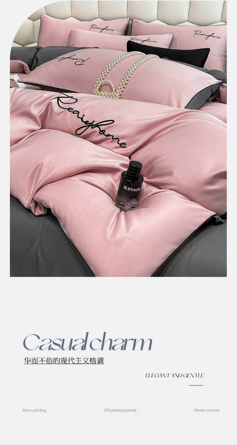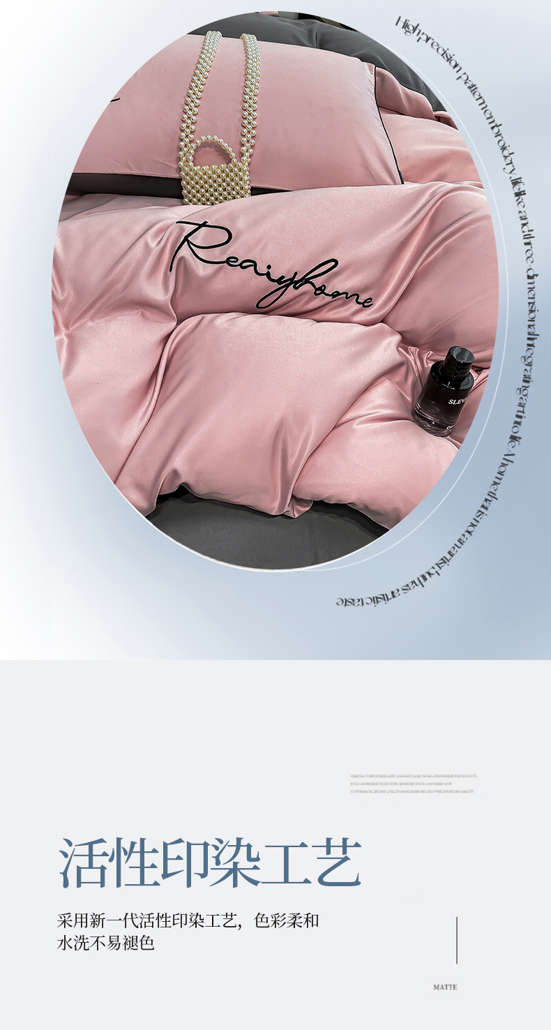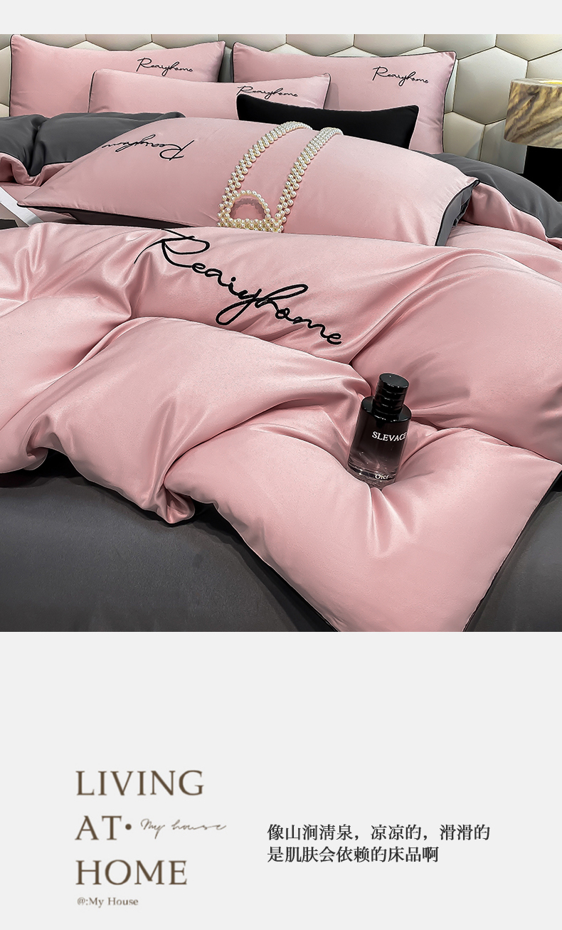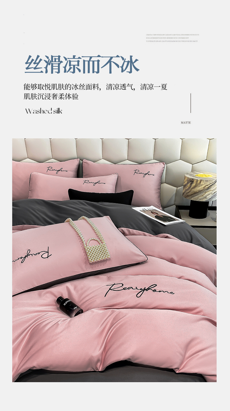 商品名称:富宁2025新款水洗真丝时光字母冰丝刺绣四件套 豆沙+高级灰