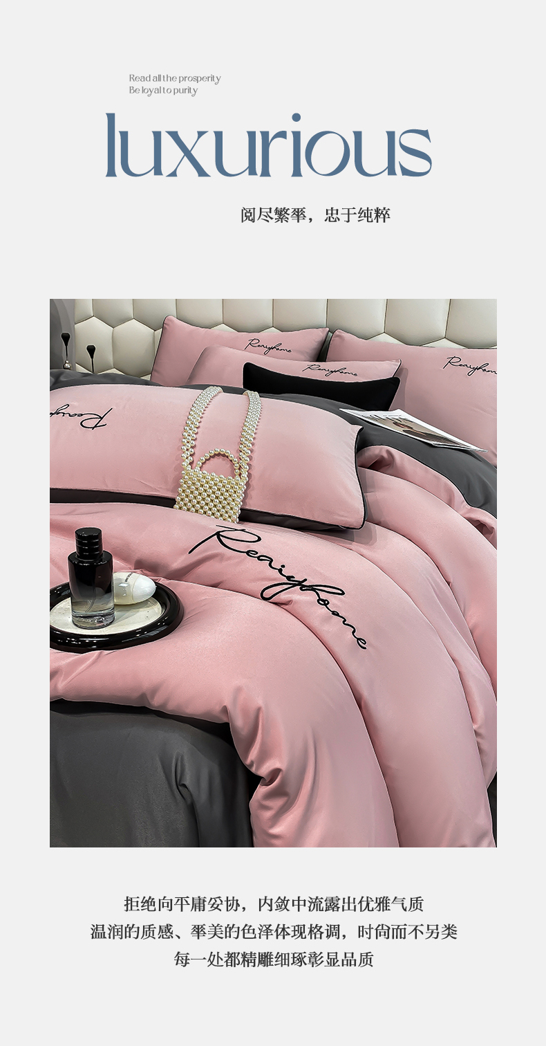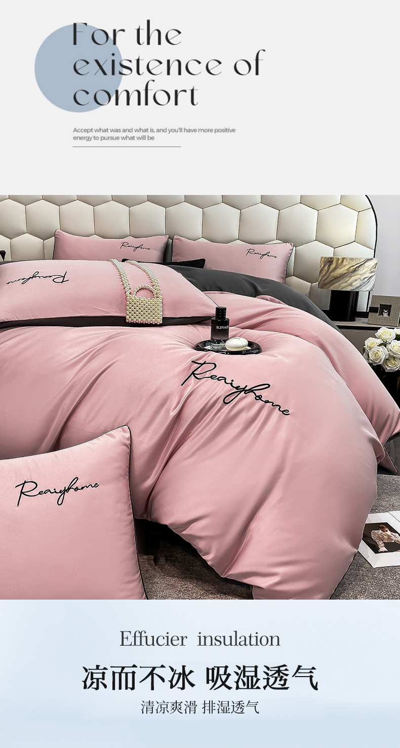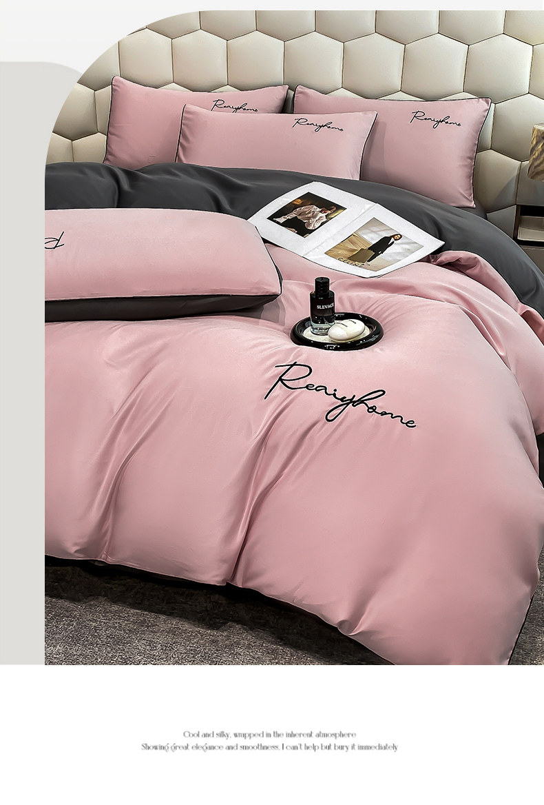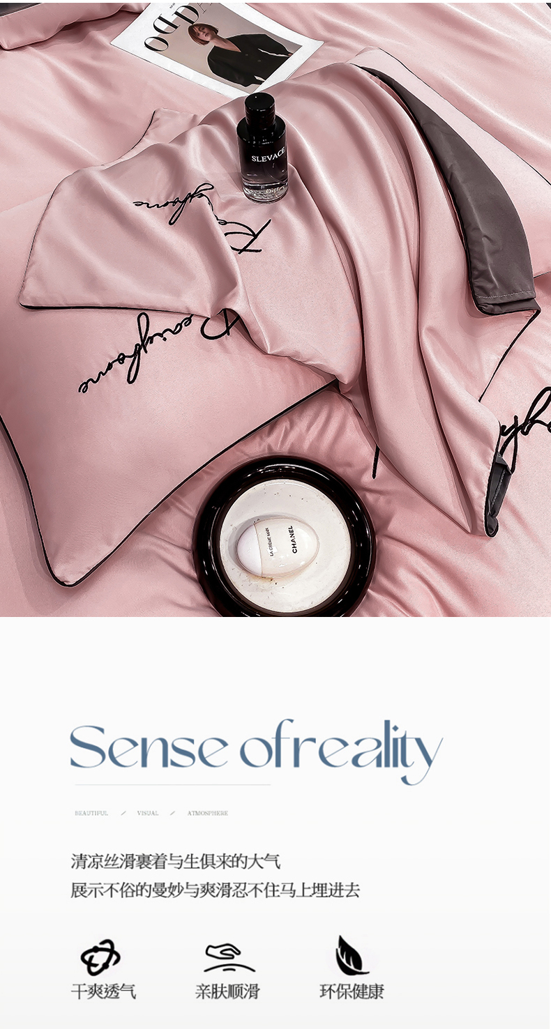 商品名称:富宁2025新款水洗真丝时光字母冰丝刺绣四件套 豆沙+高级灰
