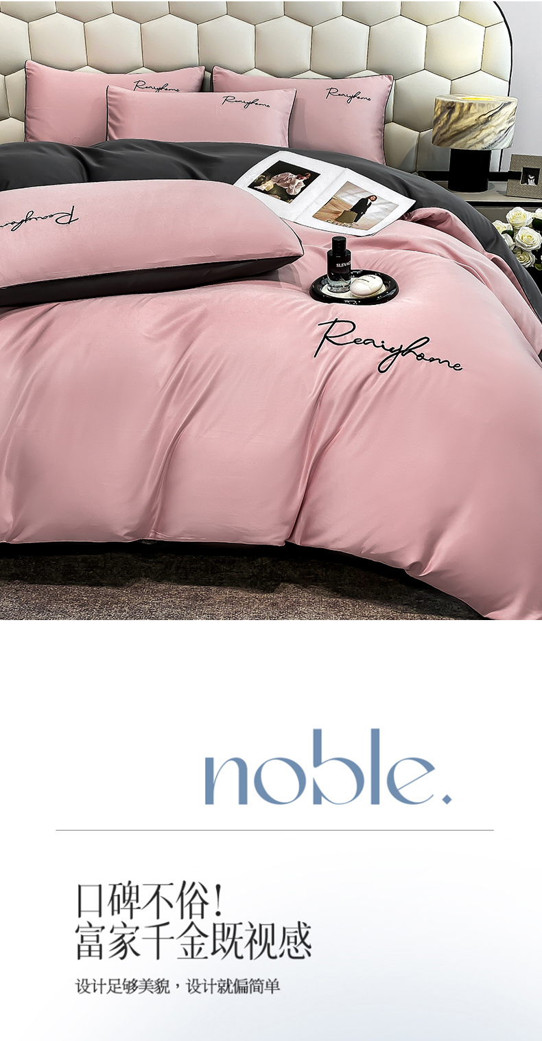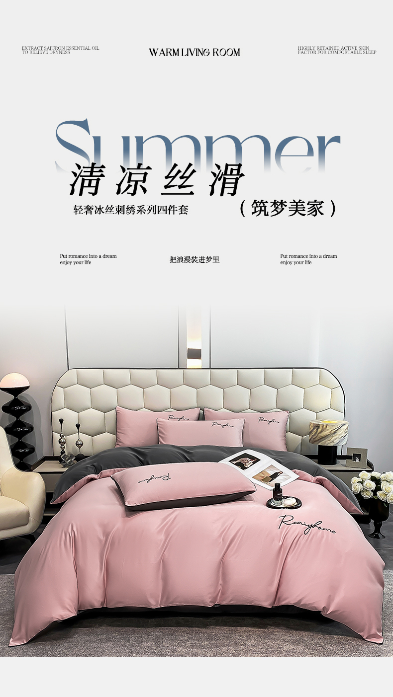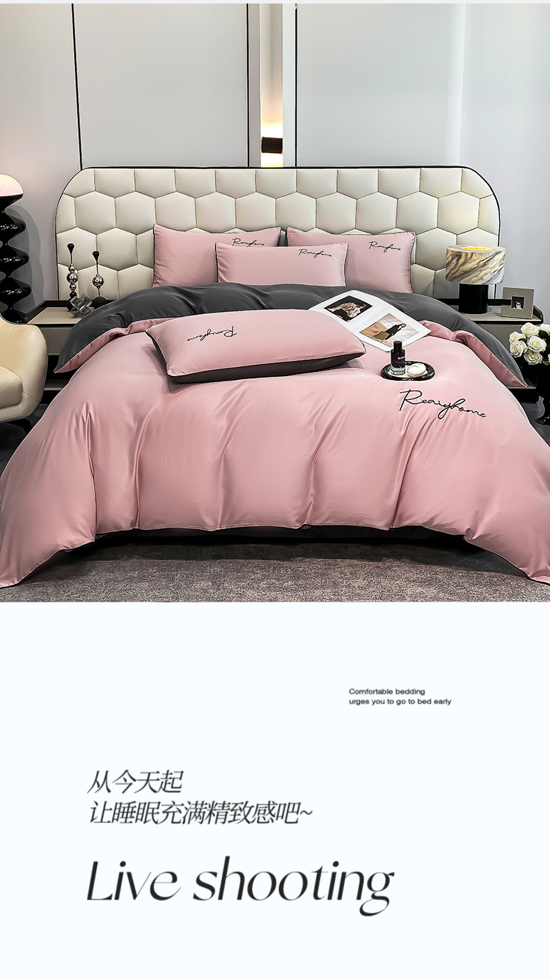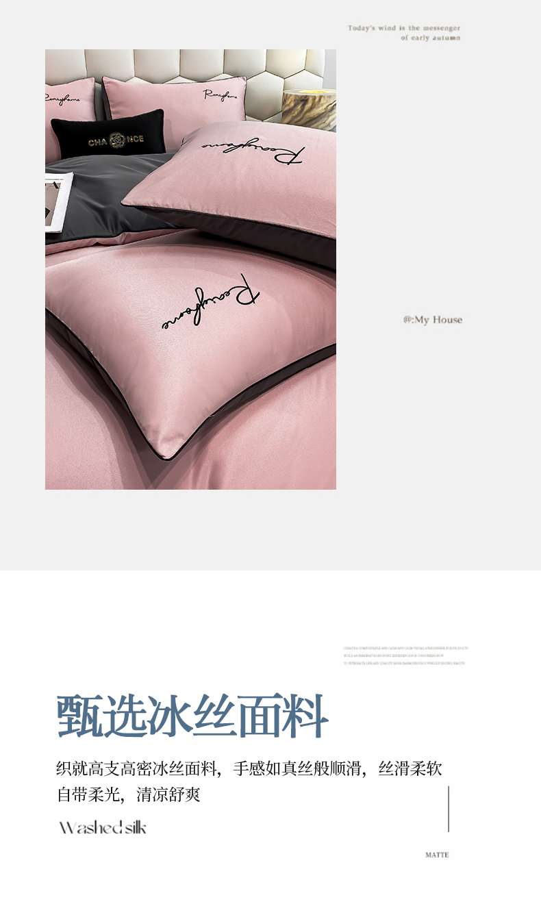 商品名称:富宁2025新款水洗真丝时光字母冰丝刺绣四件套 豆沙+高级灰