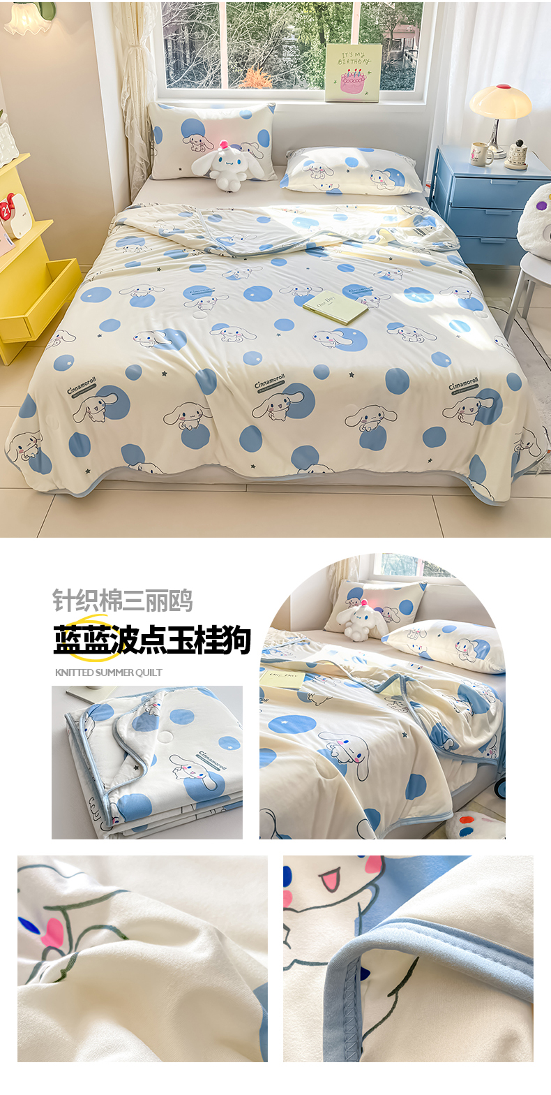 金爱家2025新款A类三丽鸥正版授权高品质牛奶丝软糯针织棉大豆夏被系列详情 针织棉三丽鸥-蓝蓝波点玉桂狗