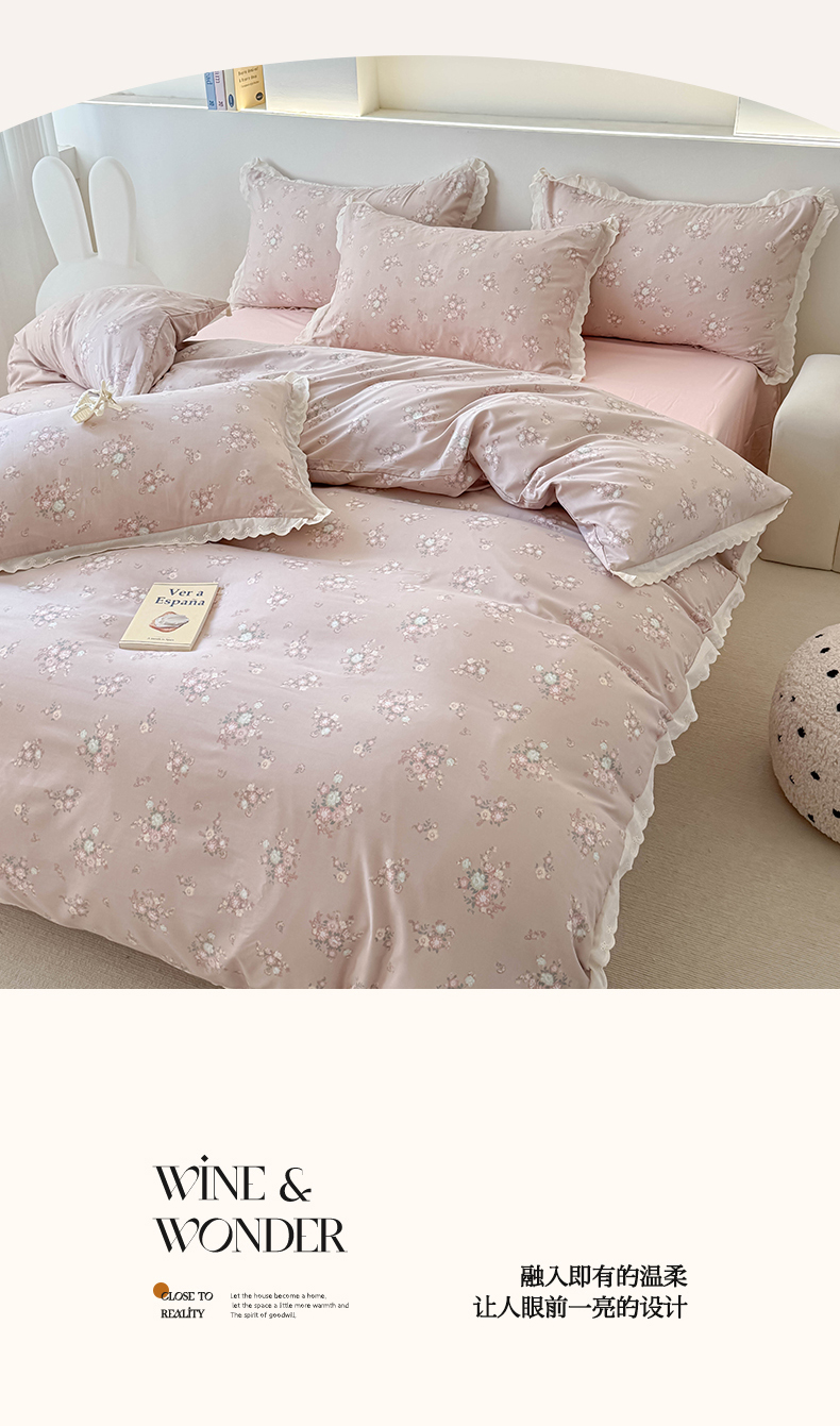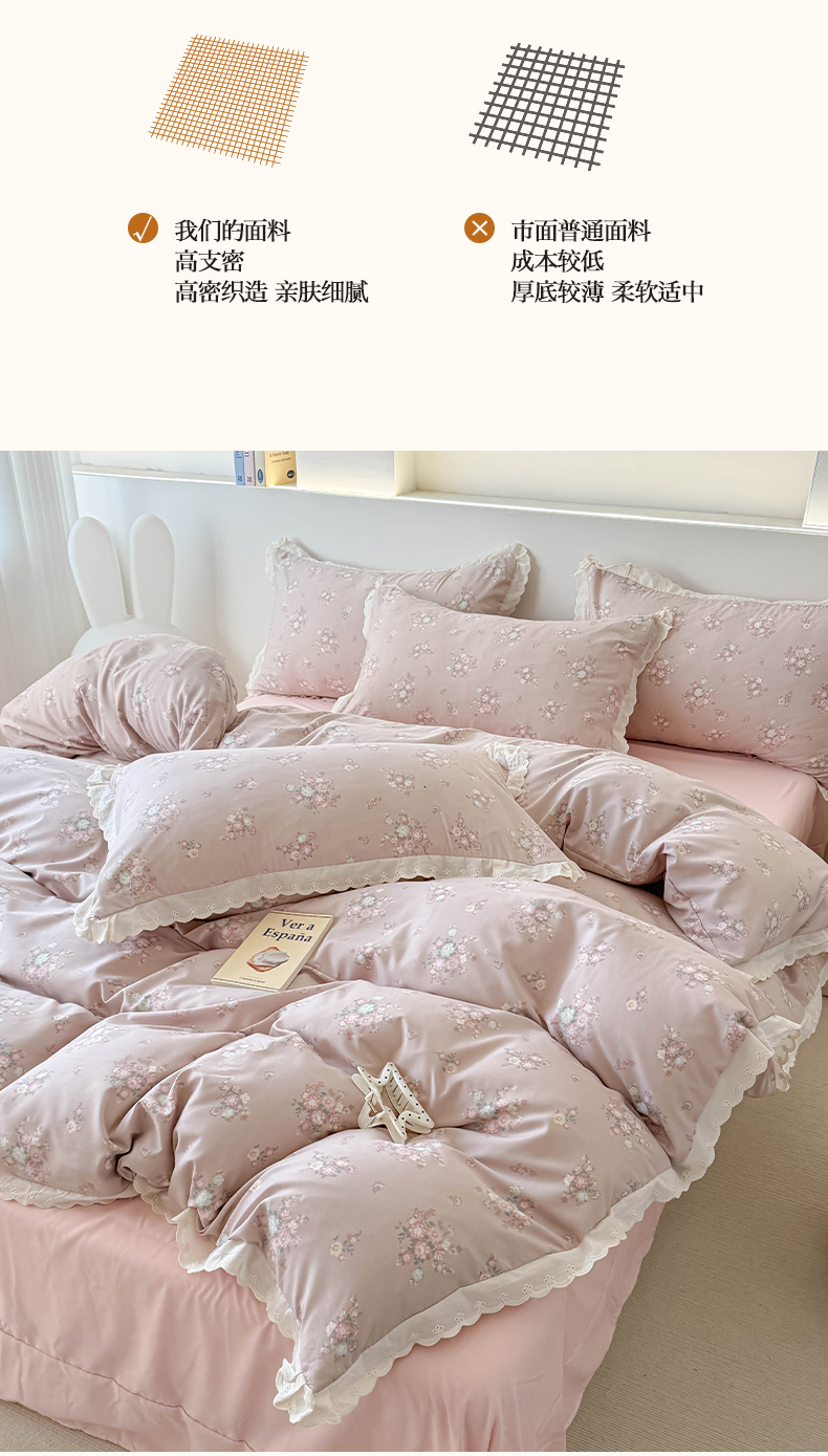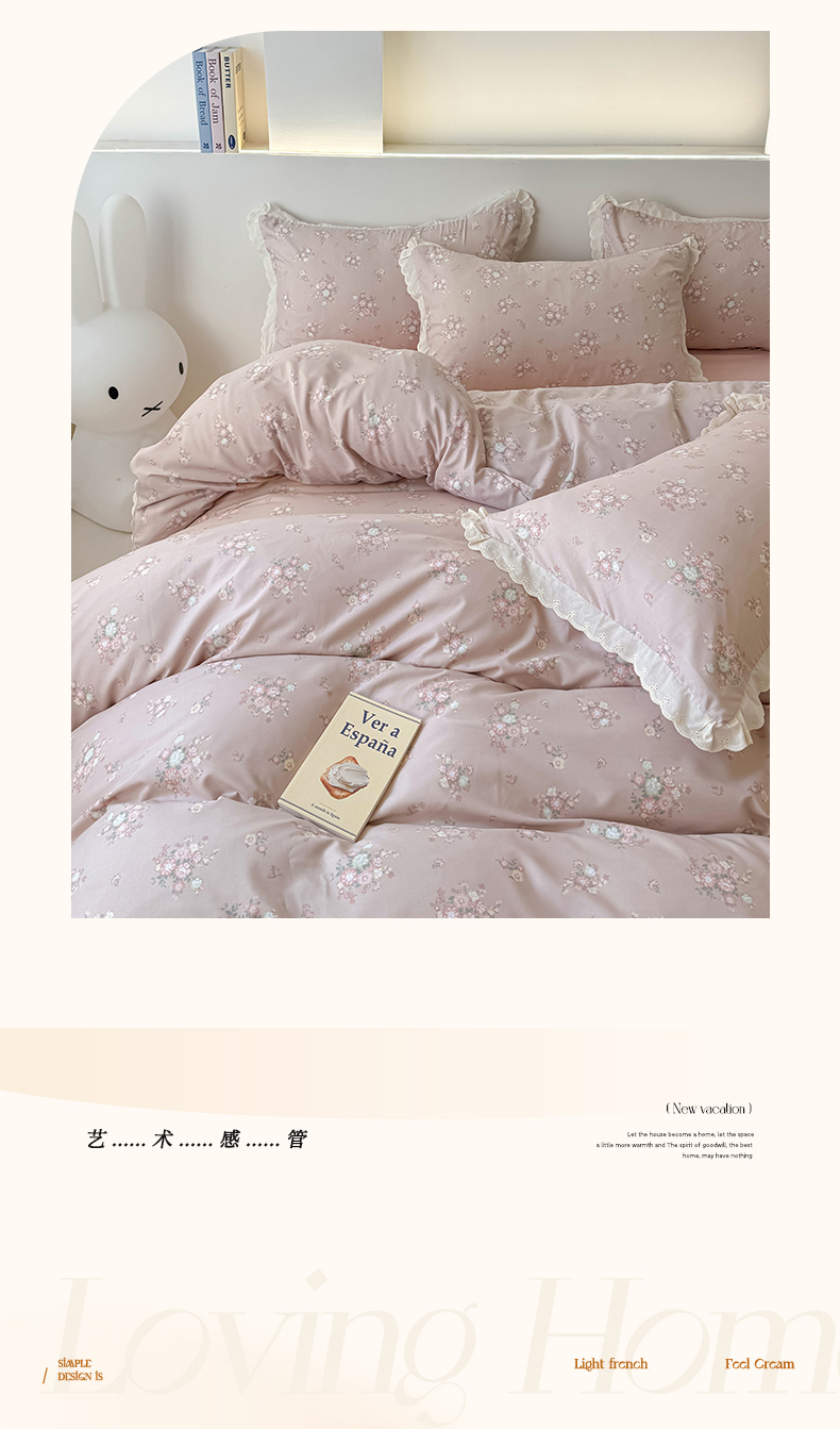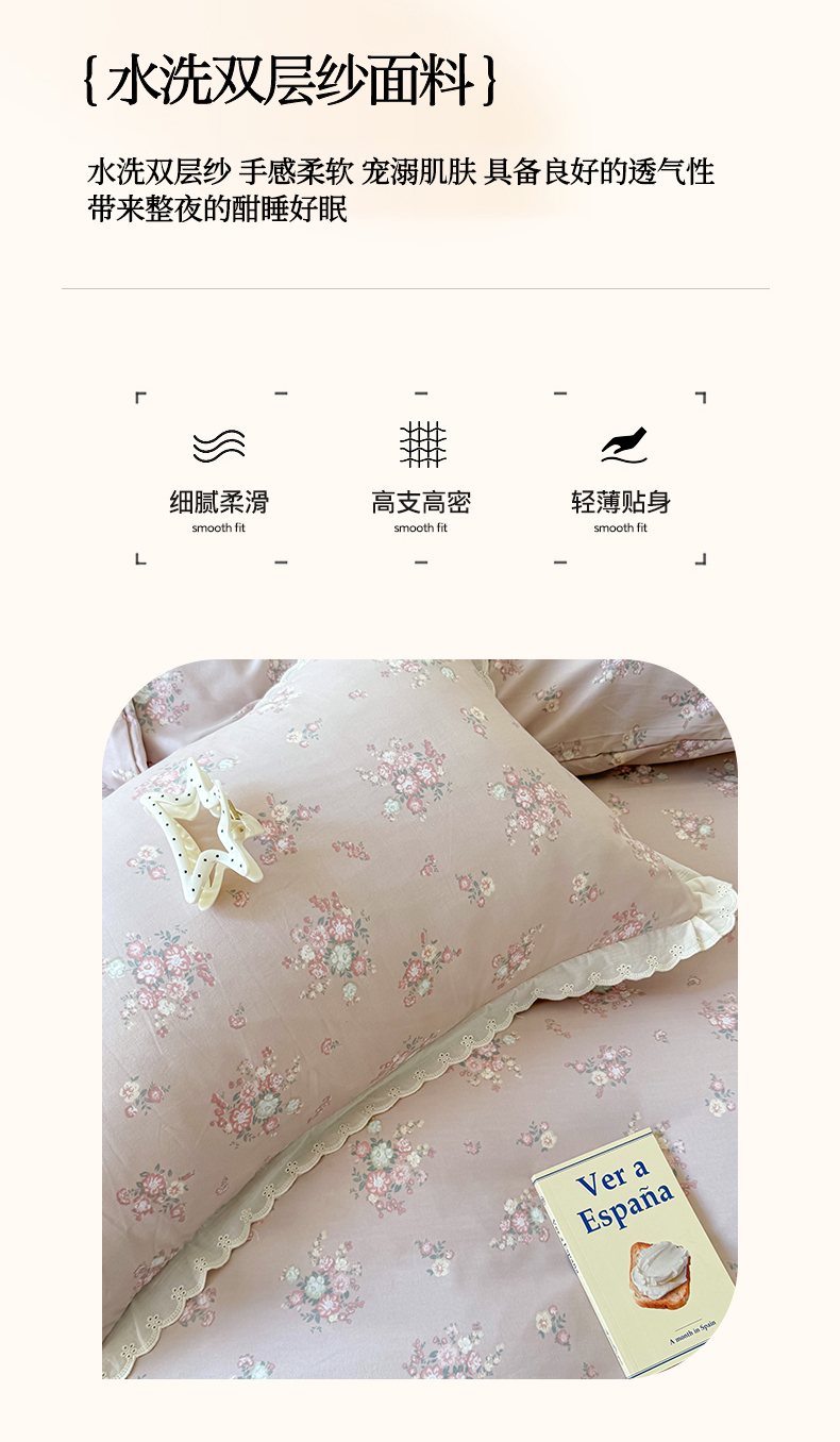 商品名称:吾欢心 2025新款韩版花边水洗双层纱四件套夏被四件套(棚拍图) 海棠花开