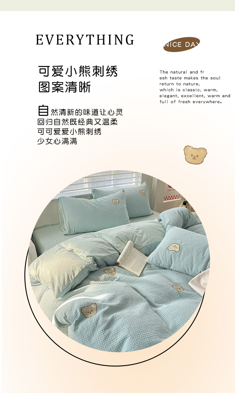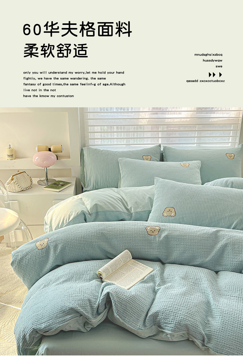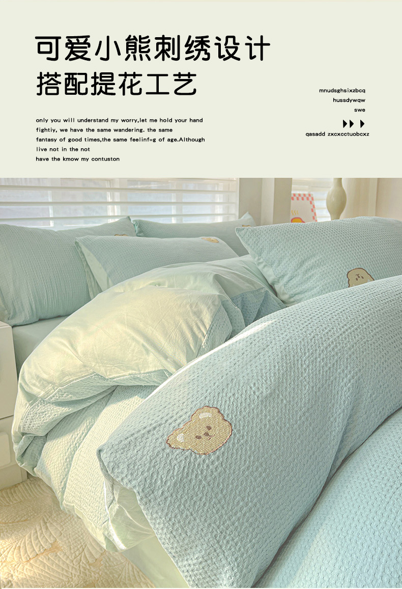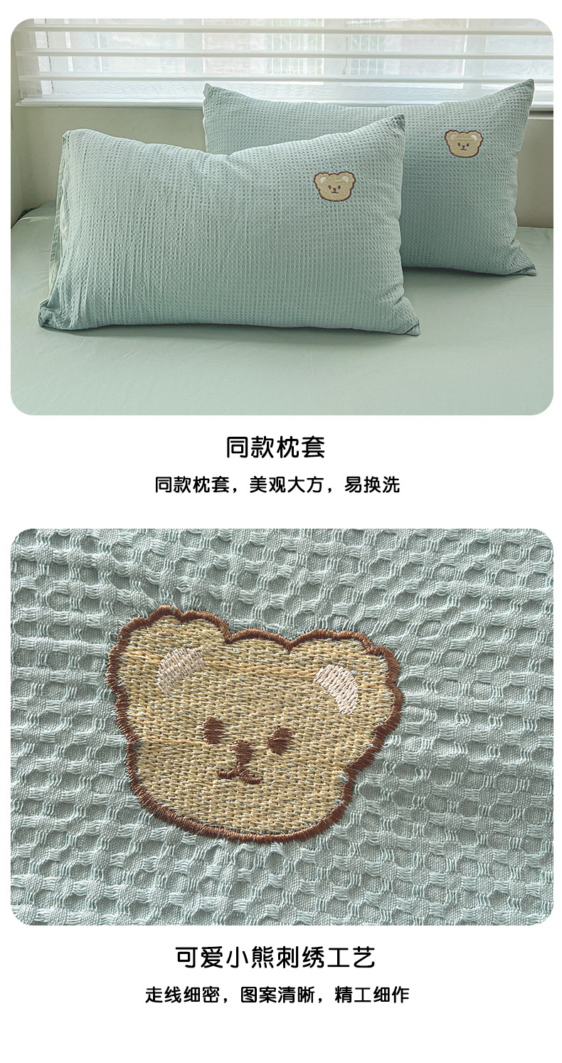 当前位置: 91家纺网 > 商品网购 > 床品套件 > 四件套 > 全棉普通四件套 > 静家居 2025新款全棉纯棉华夫格北欧小熊刺绣四件套系列-风格一 北欧小熊-露草