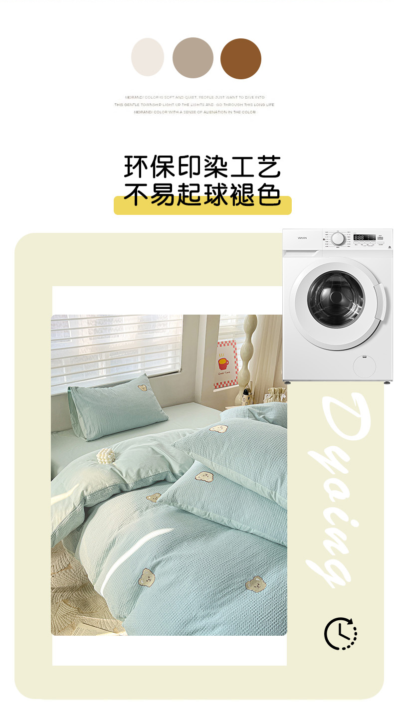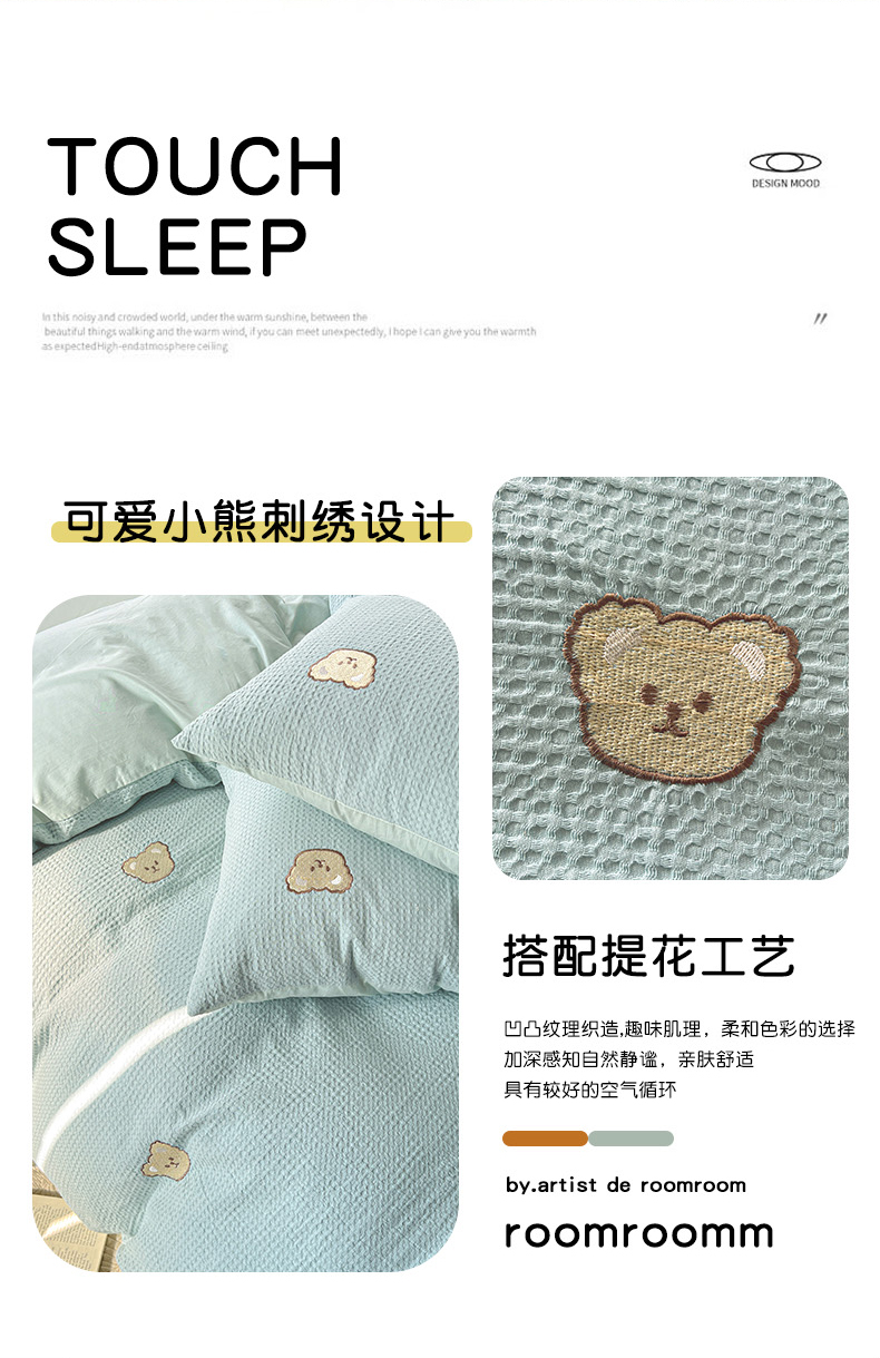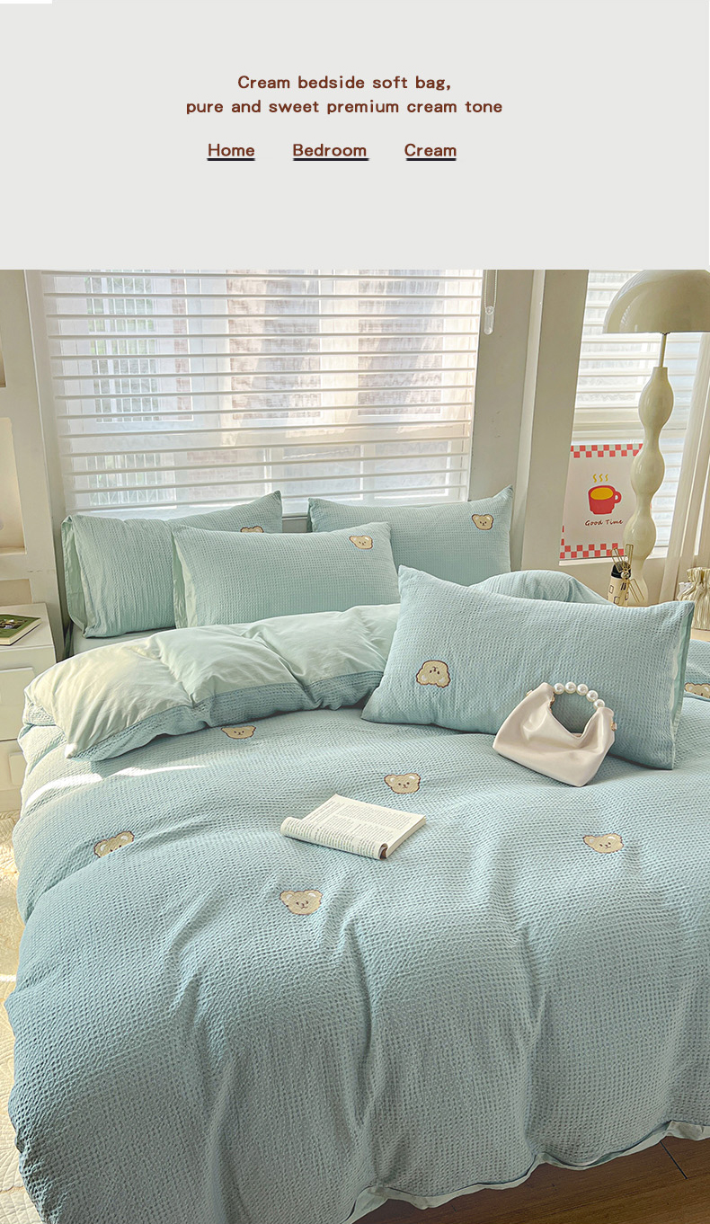 当前位置: 91家纺网 > 商品网购 > 床品套件 > 四件套 > 全棉普通四件套 > 静家居 2025新款全棉纯棉华夫格北欧小熊刺绣四件套系列-风格一 北欧小熊-露草