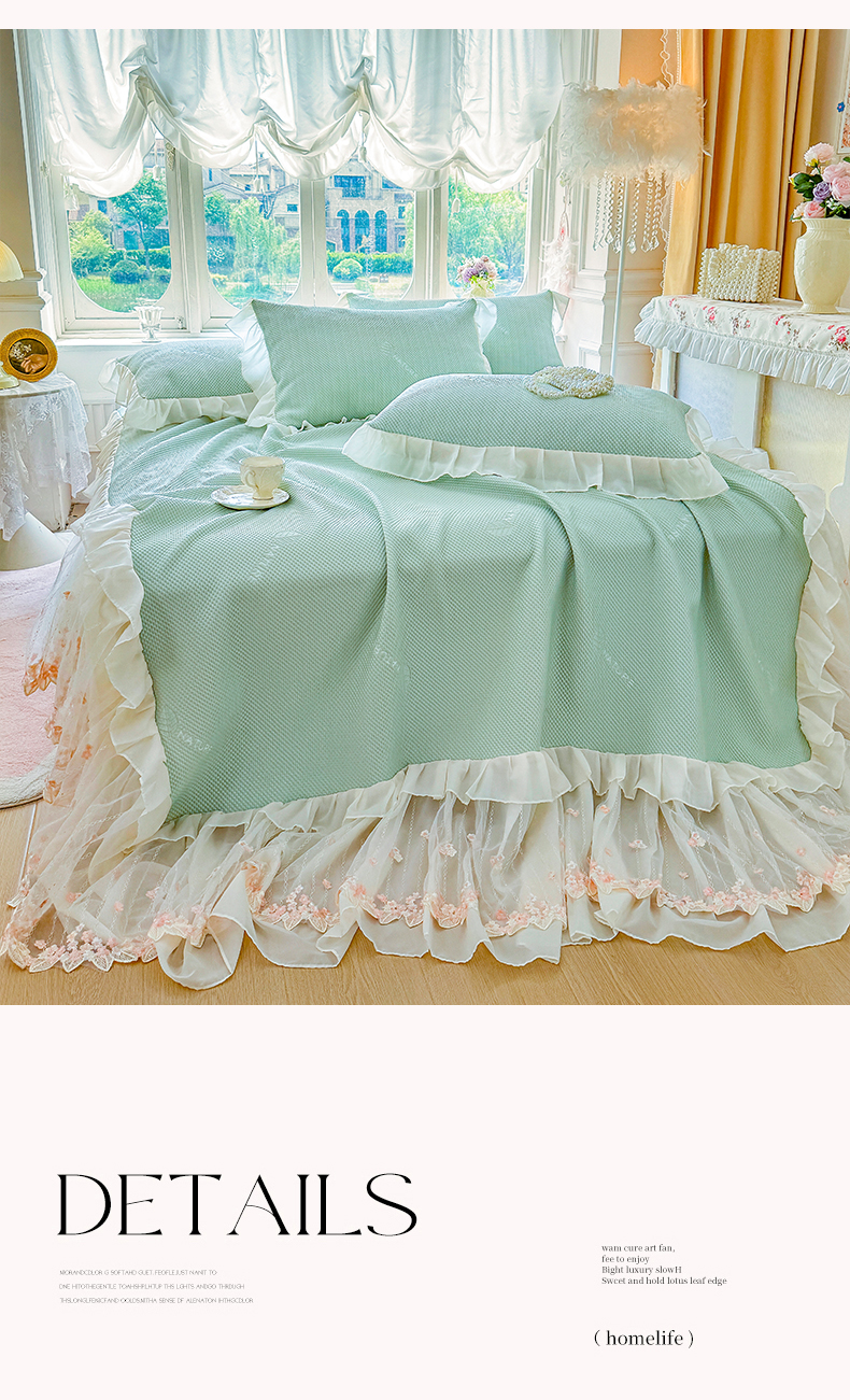 商品名称:虹星家纺 2025新款A类冰感凉豆豆床裙席三件套-素夏 素夏-青果绿
