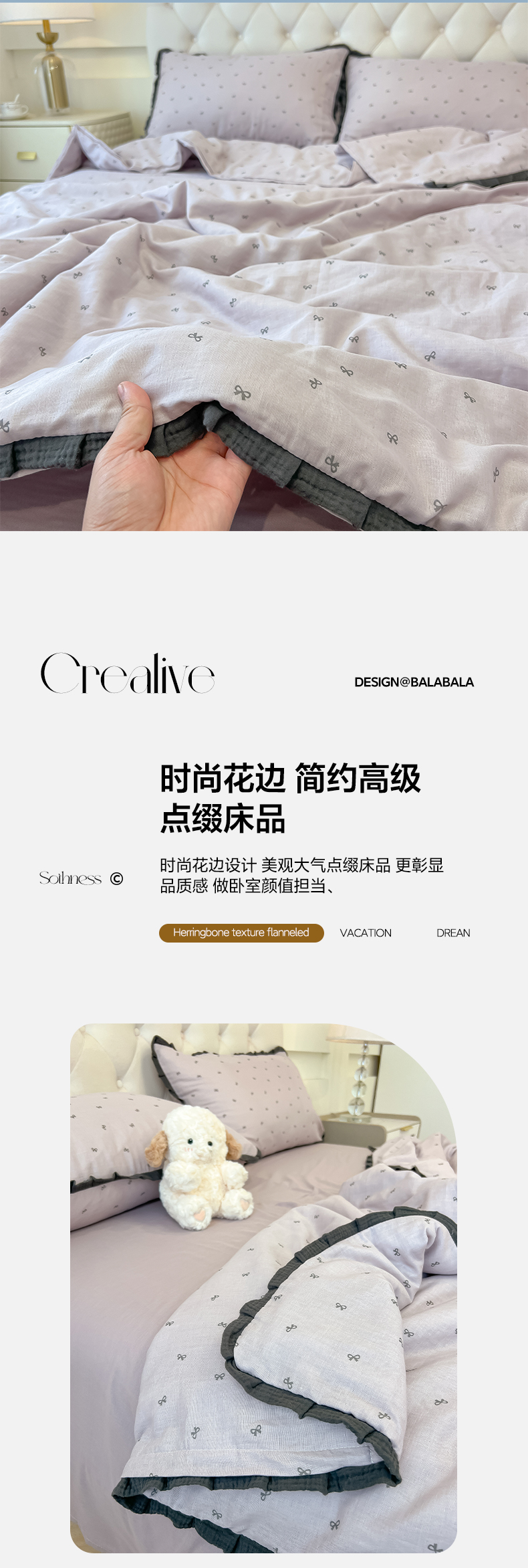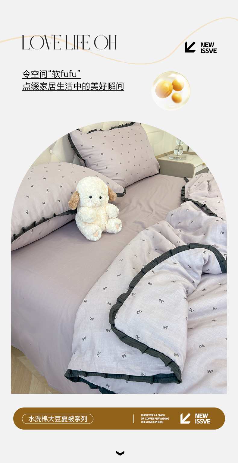 • 91家纺网 家纺一手货源 找家纺 盼季家纺 2025新款水洗棉大豆花边夏被四件套 皱皱纱花边夏被-蓝波点