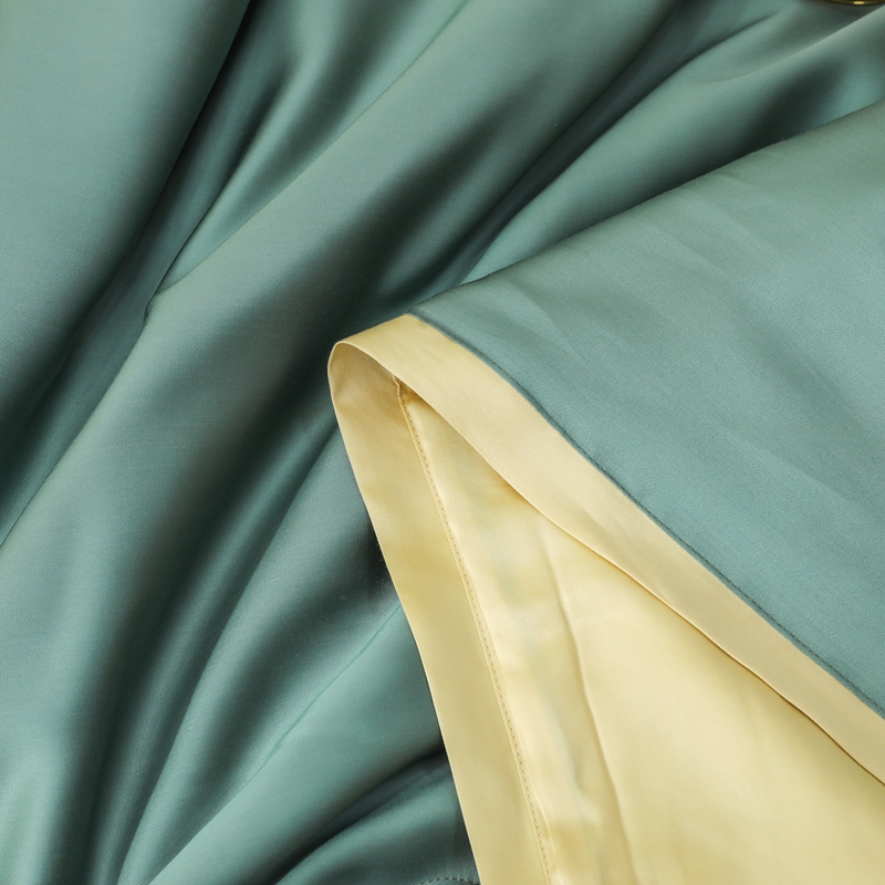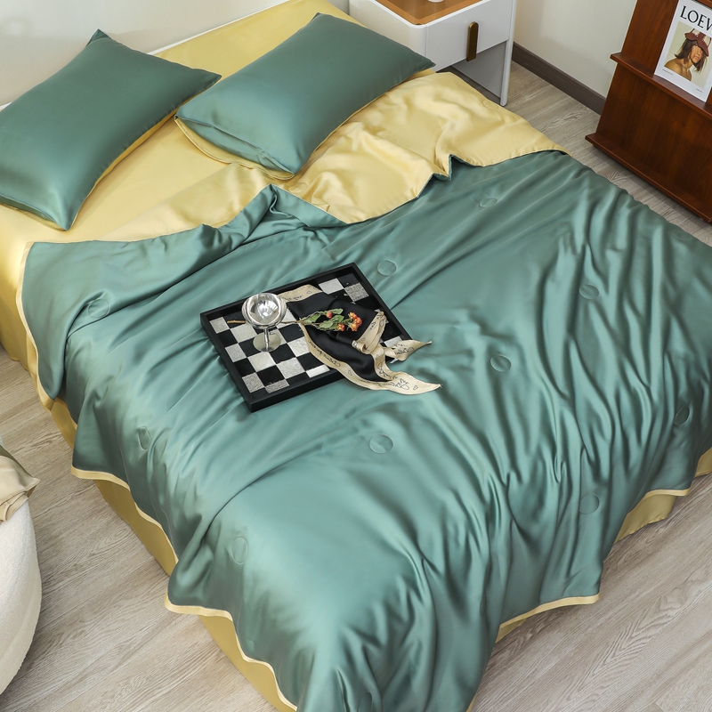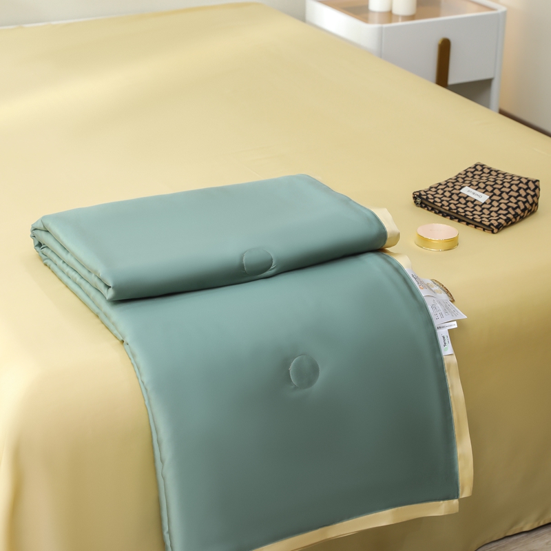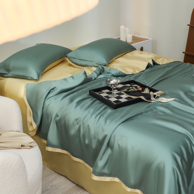 当前位置: 91家纺网 > 商品网购 > 床品套件 > 四件套 > 夏被四件套 > 眷恋家纺 2025春夏新款双拼纯色60天丝夏被四件套 天青色-香槟金