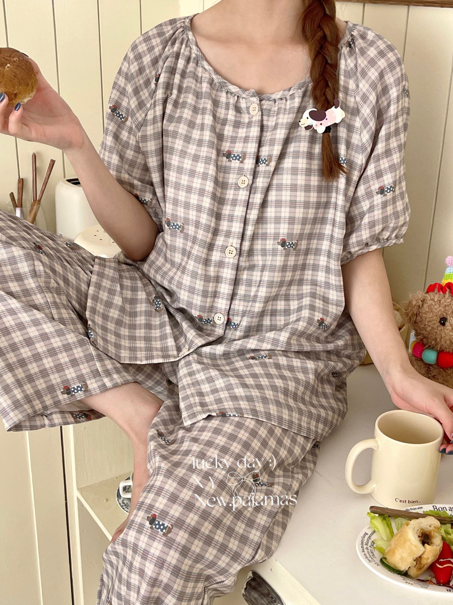 (总)纽约生活 有氧纱韩系家居服圆领短袖长裤自带胸垫套装