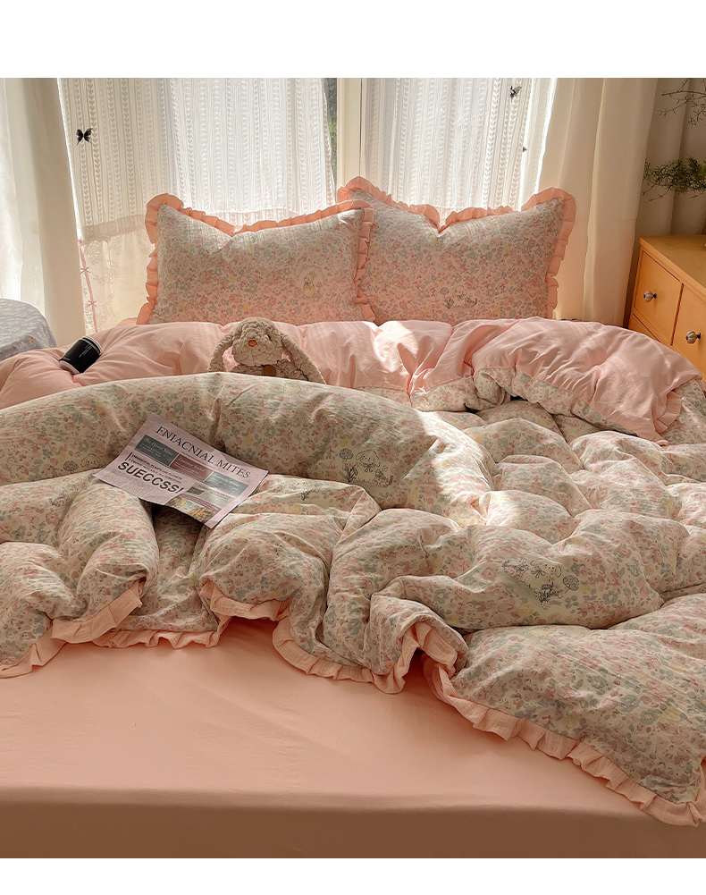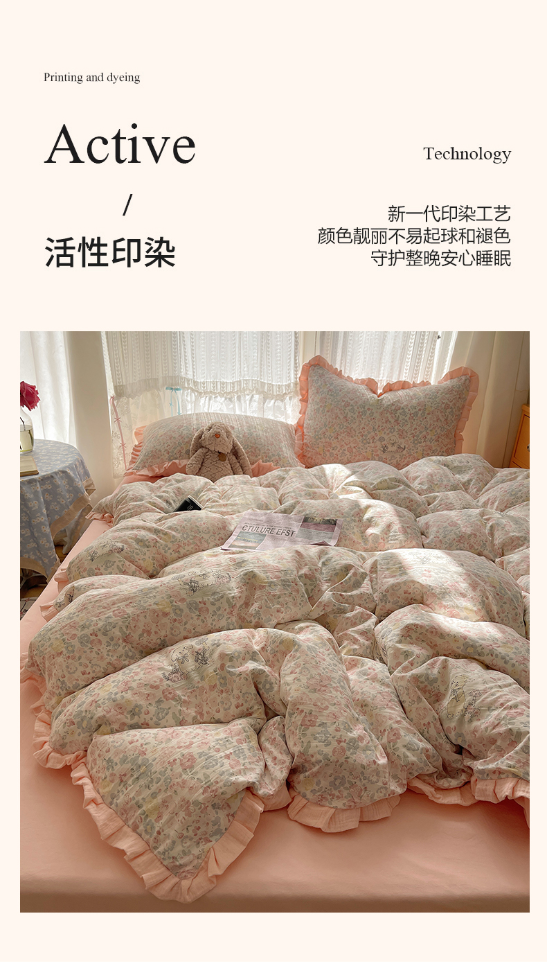 当前位置: 91家纺网 > 商品网购 > 床品套件 > 四件套 > 水洗棉四件套 > 繁花家居 2025新款木耳边水洗棉双层纱针织棉韩式花边四件套 幸运小兔