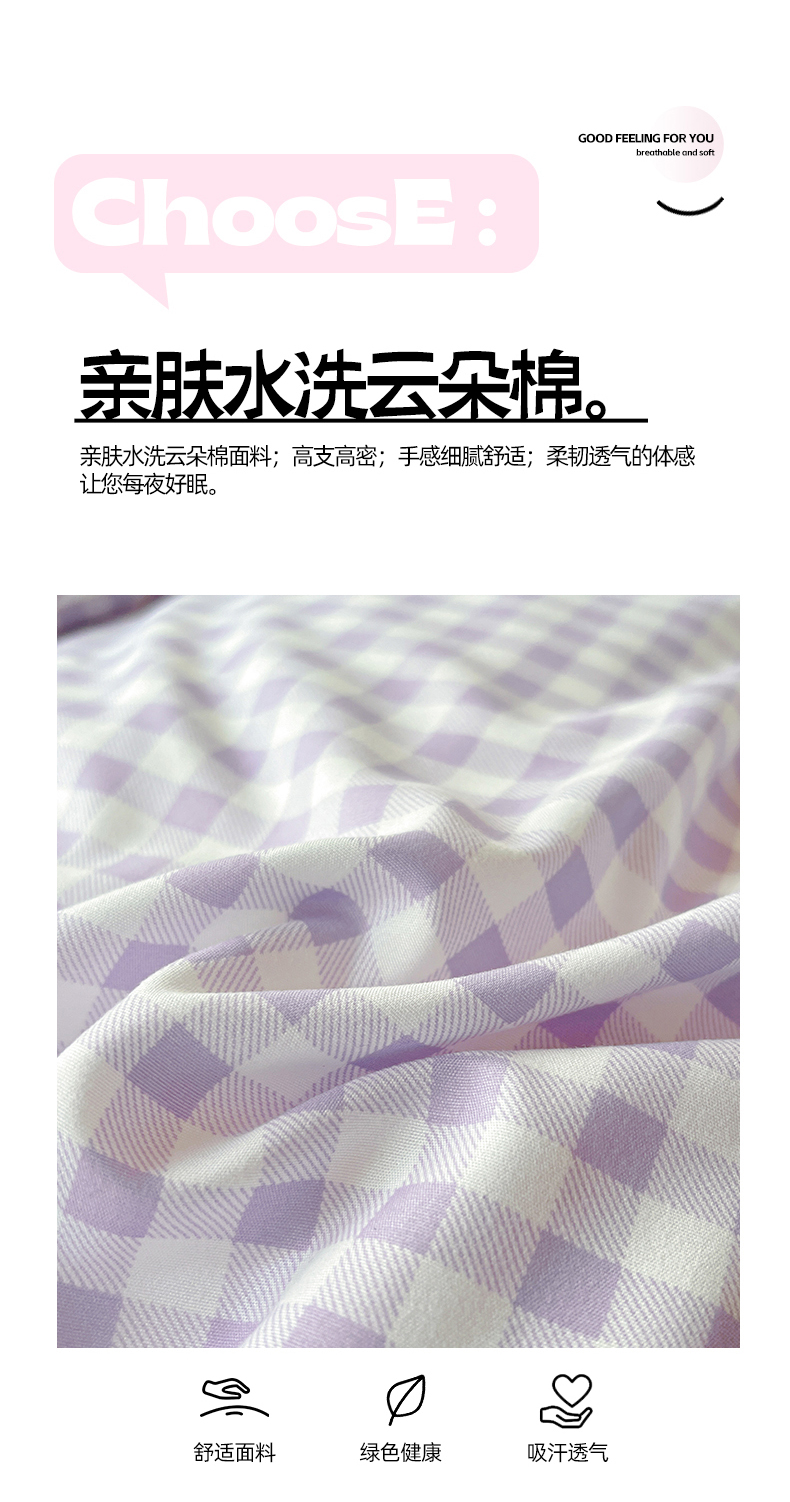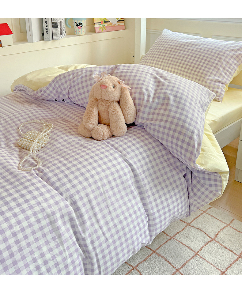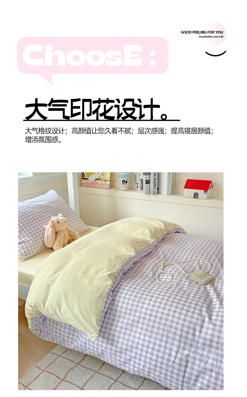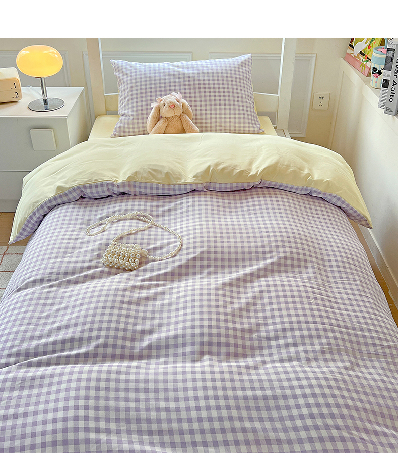 妖妖家纺 2025新款软糯水洗棉格子学生三件套 奶黄芋泥