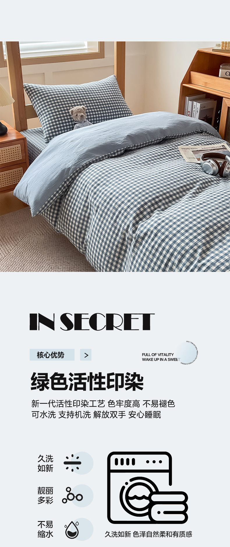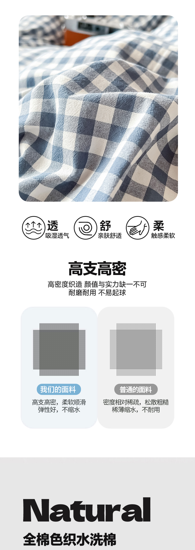 商品名称:鸣升家纺 2025新款全棉纯棉色织水洗棉学生三件套 浅蓝小格