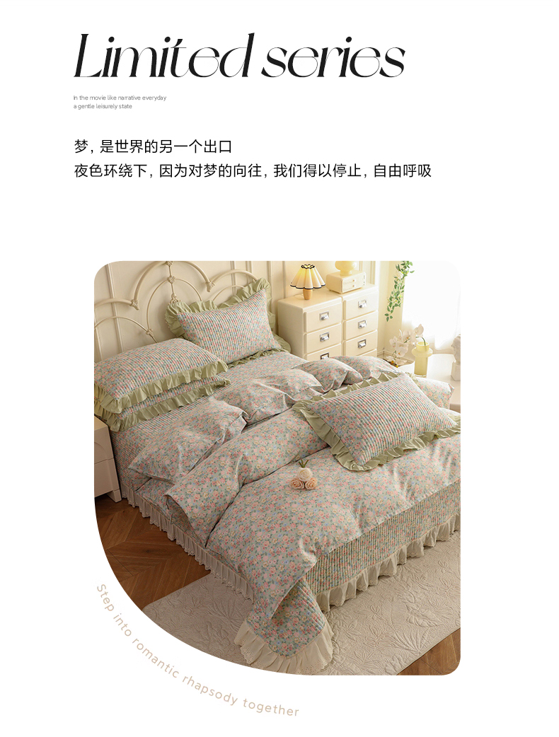 (总)美达家纺 2025新款全棉纯棉AB版蕾丝小花边单层床裙四件套,解语花,南湘,沁雨花叶,悦棠