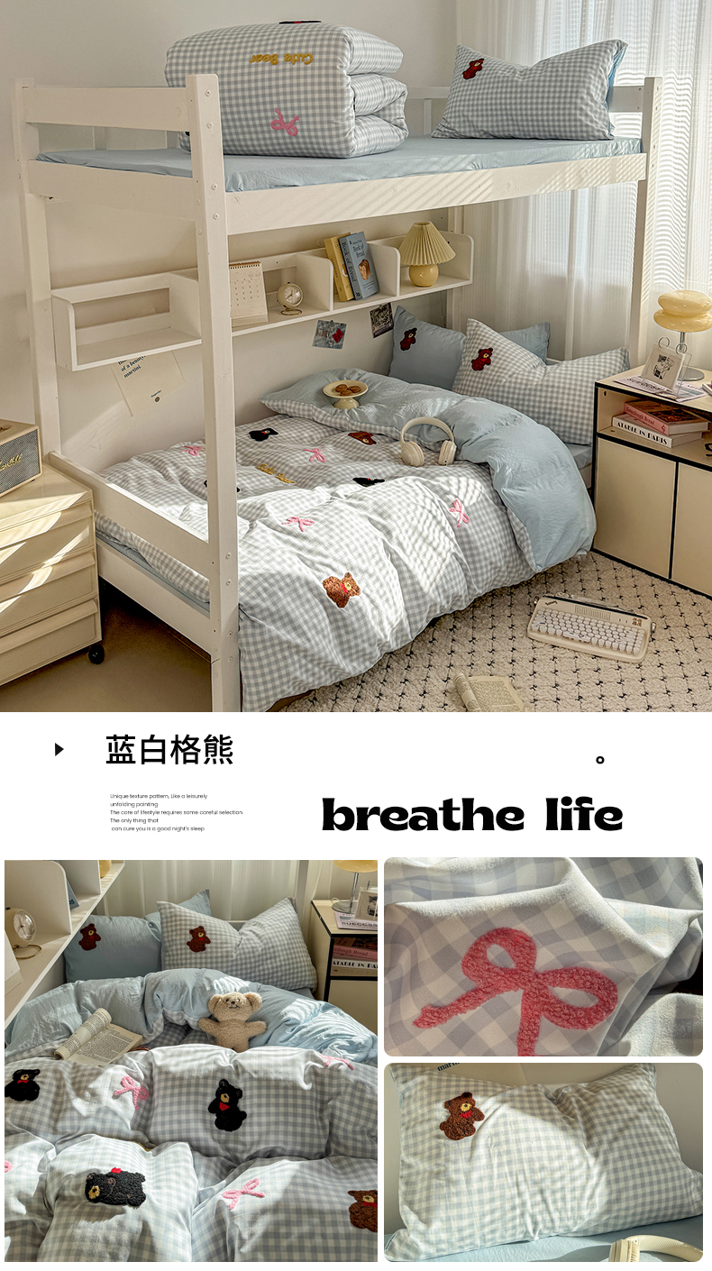 当前位置: 91家纺网 > 商品网购 > 床品套件 > 四件套 > 磨毛活性四件套 > 2025新款 985学姐推荐新款学生季宿舍可爱水洗棉毛巾绣四件套 蓝白格熊