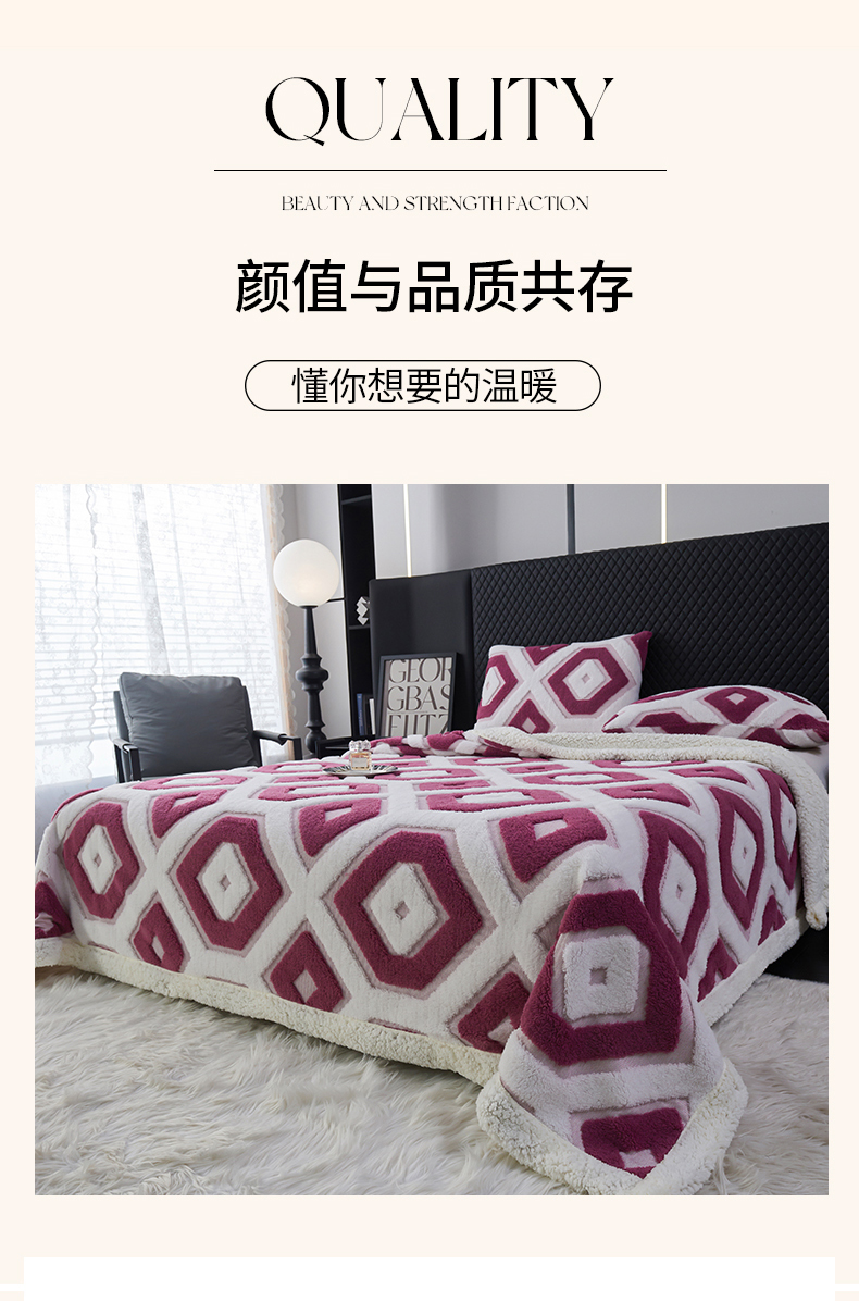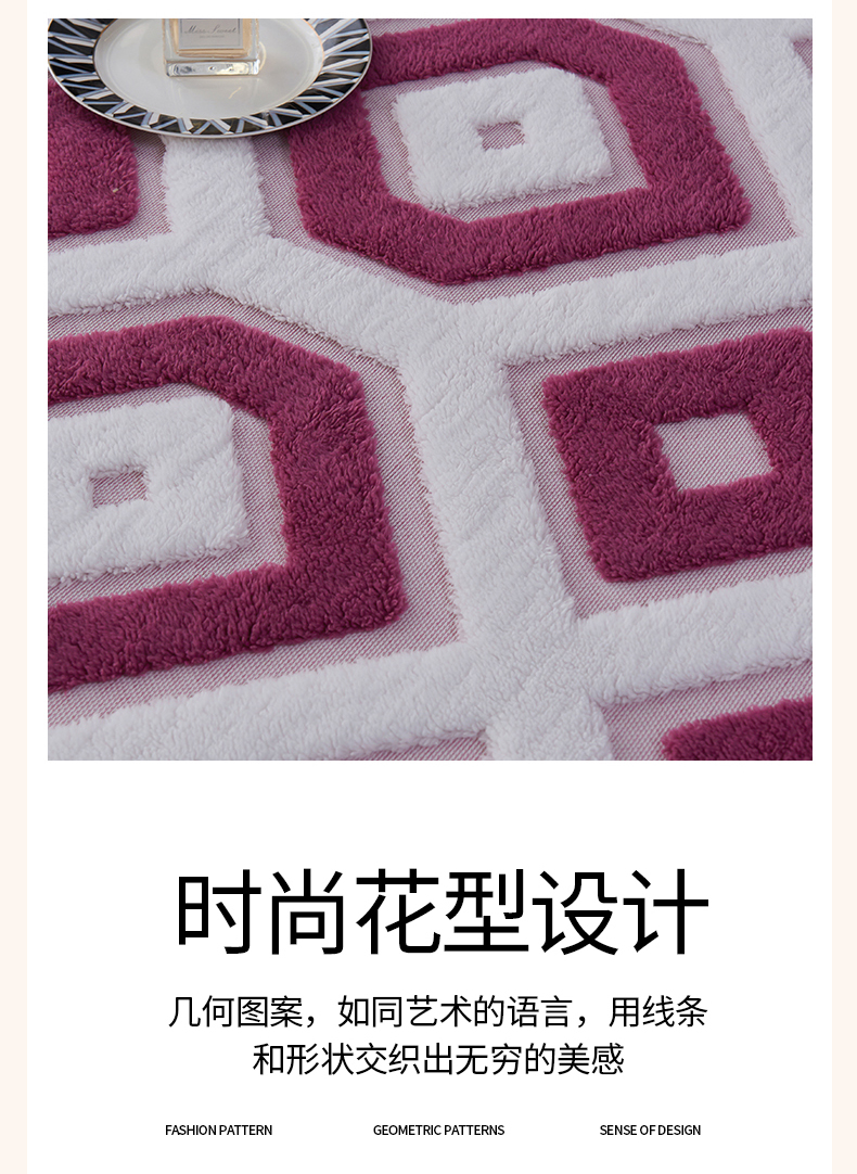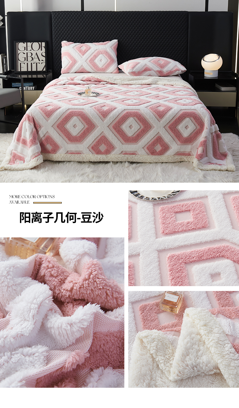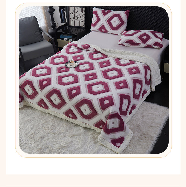 商品名称:枋梢家纺 2025新款几何空间阳离子提花镂空塔芙绒羊羔绒保暖午睡双层毛毯办公室盖毯 几何-玫红