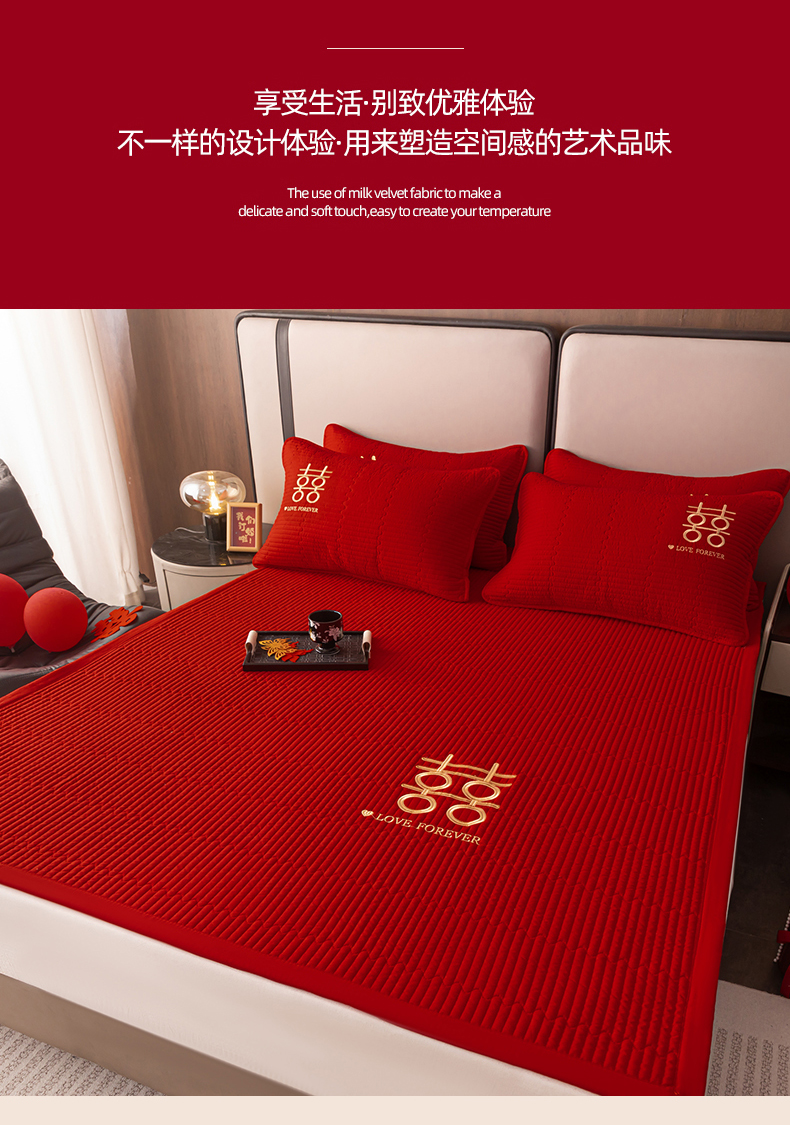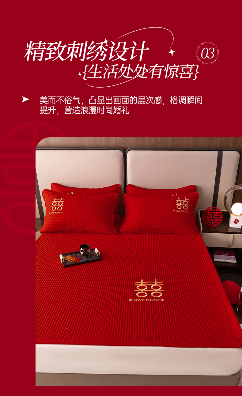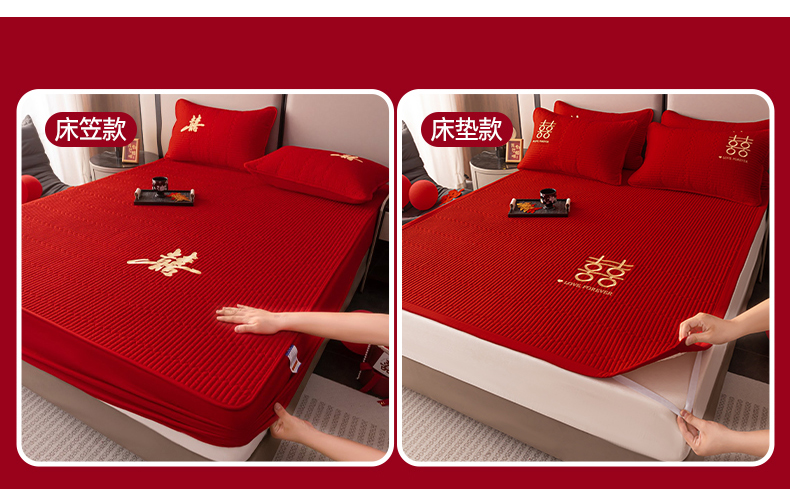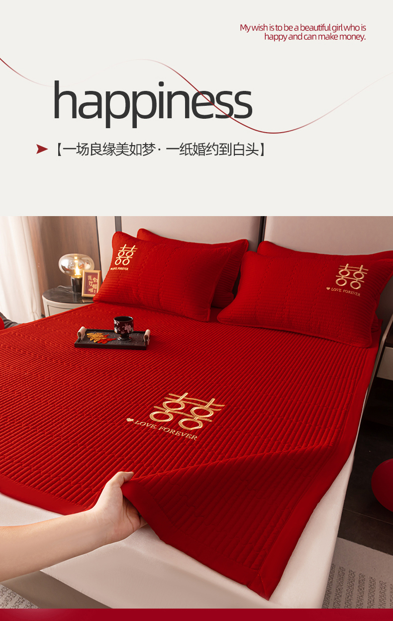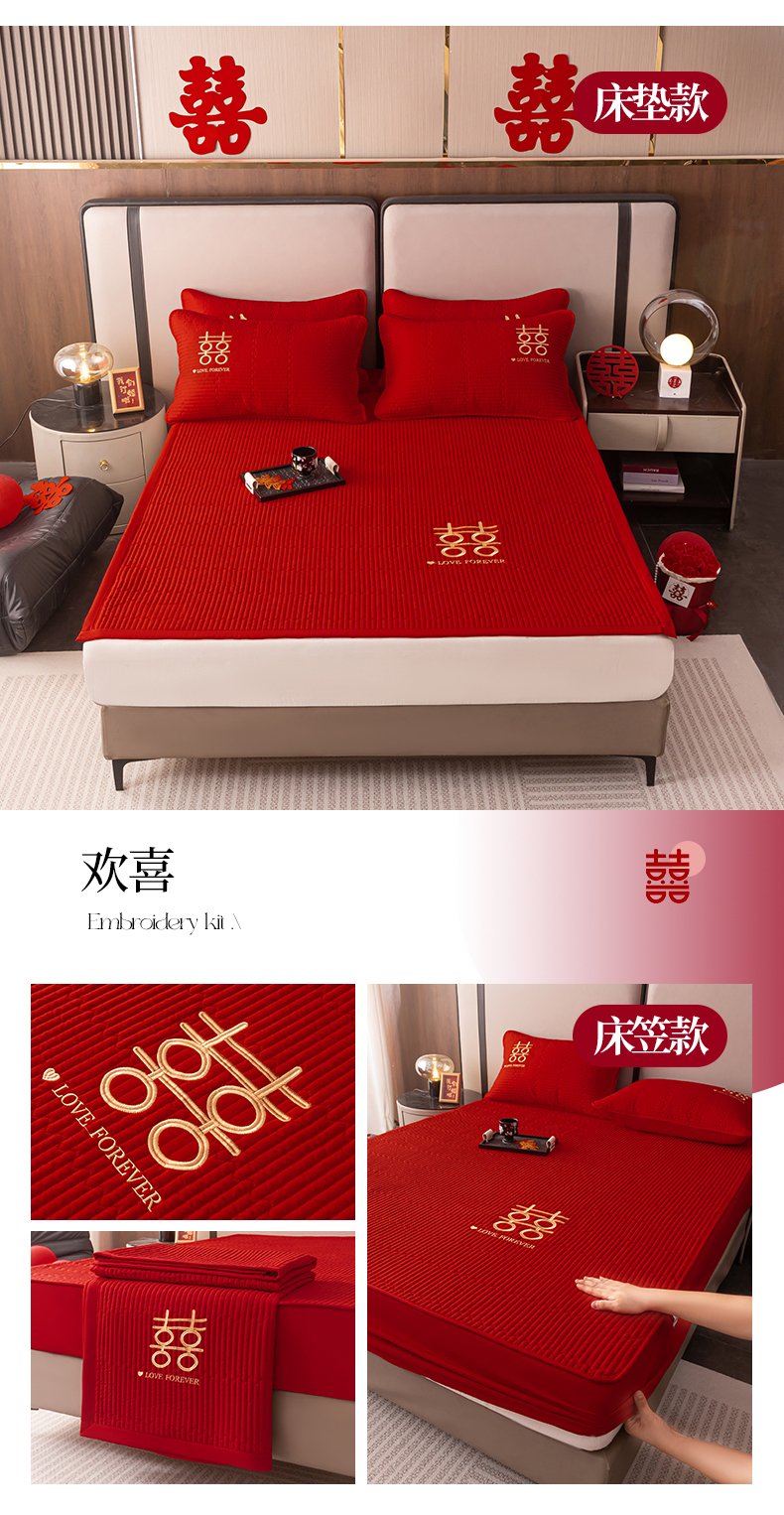 卓缦家纺 2025新款婚庆加厚软床垫软床笠三件套婚庆床单床盖 欢喜-床笠