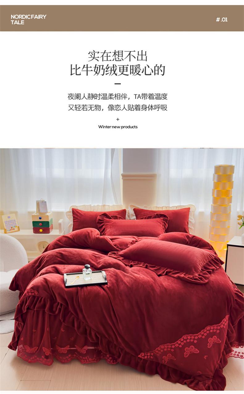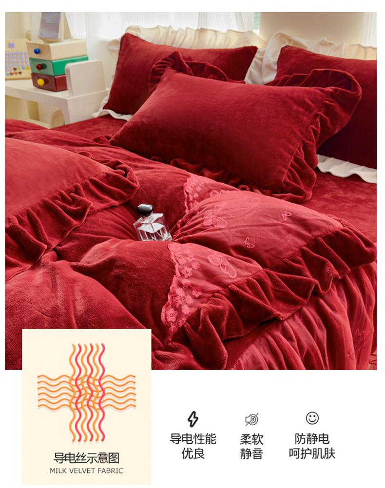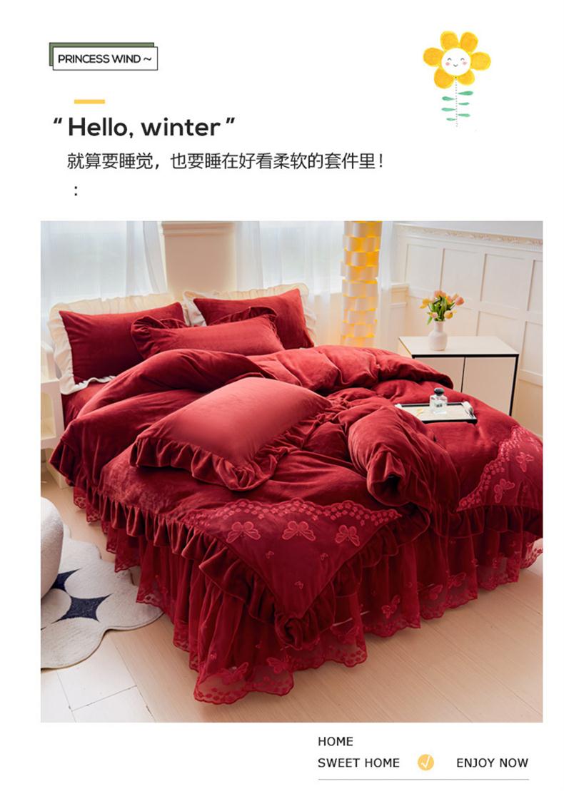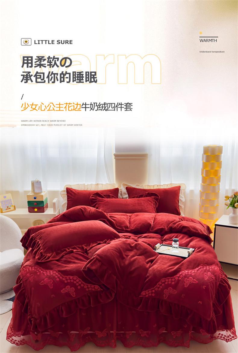 当前位置: 91家纺网 > 商品网购 > 床品套件 > 四件套 > 牛奶绒四件套 > 睡美人 2025韩版蕾丝牛奶绒套件公主风床裙床单款四件套 花蝴蝶-车厘子红拼红蕾丝