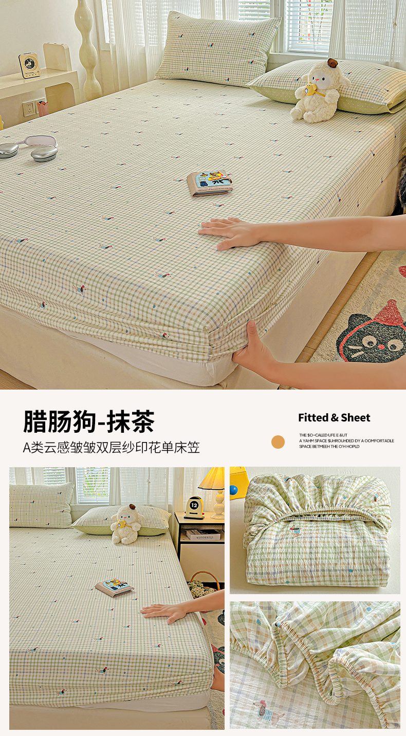 格真 2025秋冬新款110克高克重提花加厚皱皱纱双层纱印花单床笠 腊肠狗-抹茶