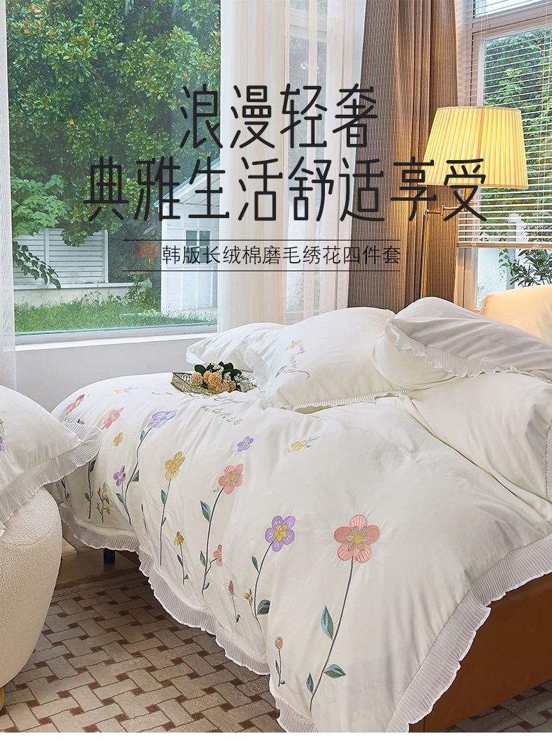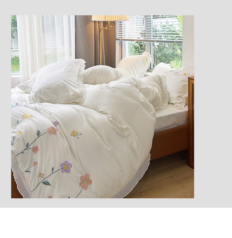 青泽家纺 2025新款母婴级ins风韩版绣花荷叶边水洗棉磨毛四件套 缤纷花园白