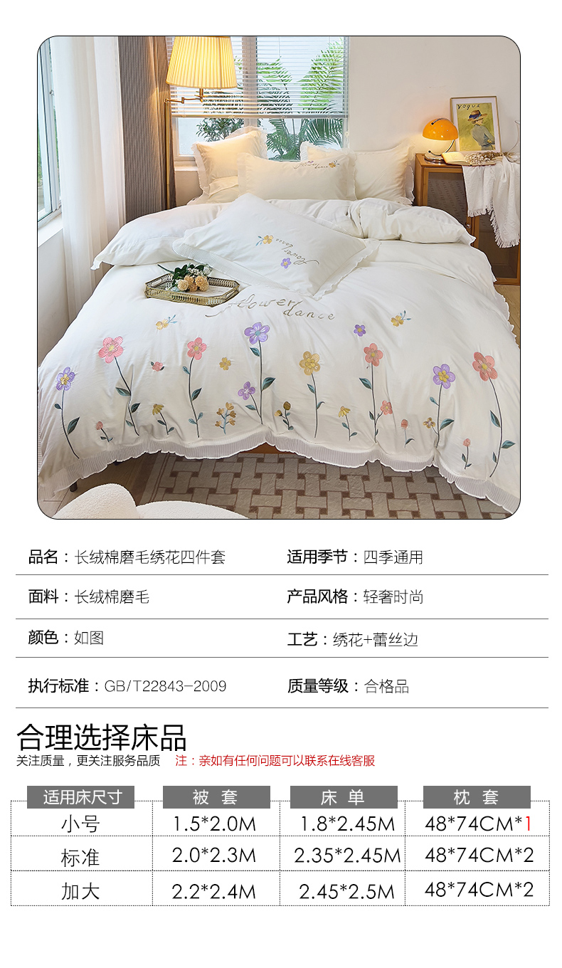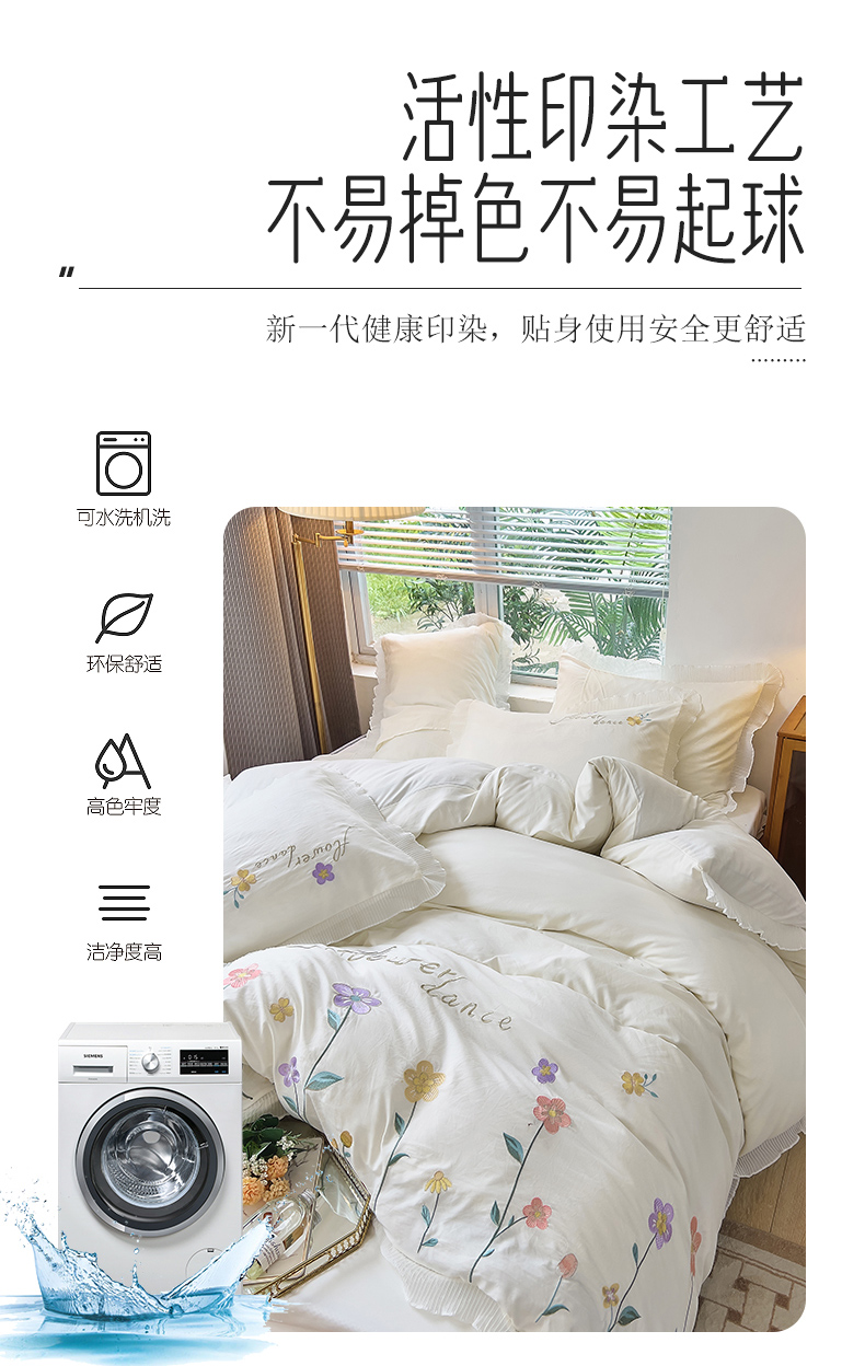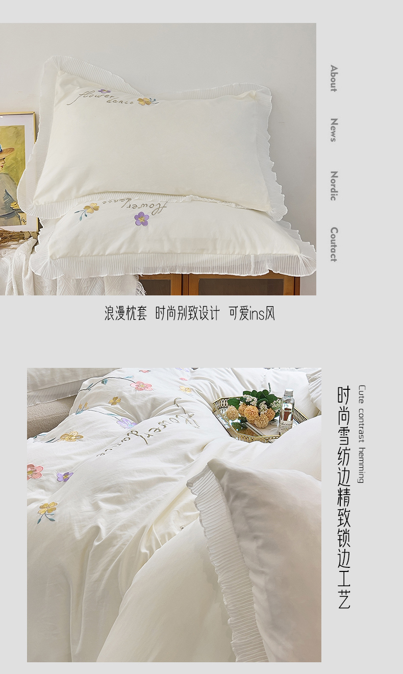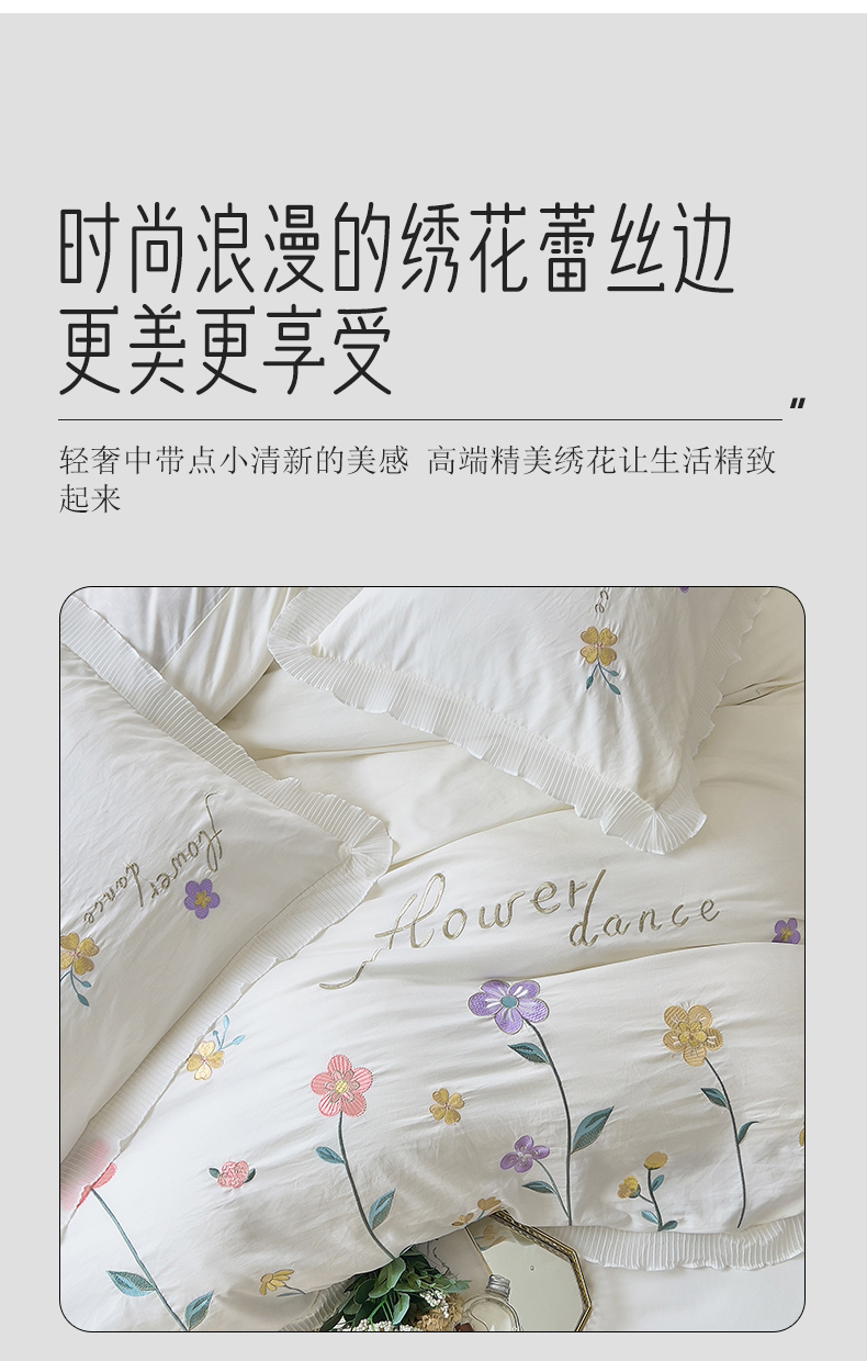 商品名称:青泽家纺 2025新款母婴级ins风韩版绣花荷叶边水洗棉磨毛四件套 缤纷花园白