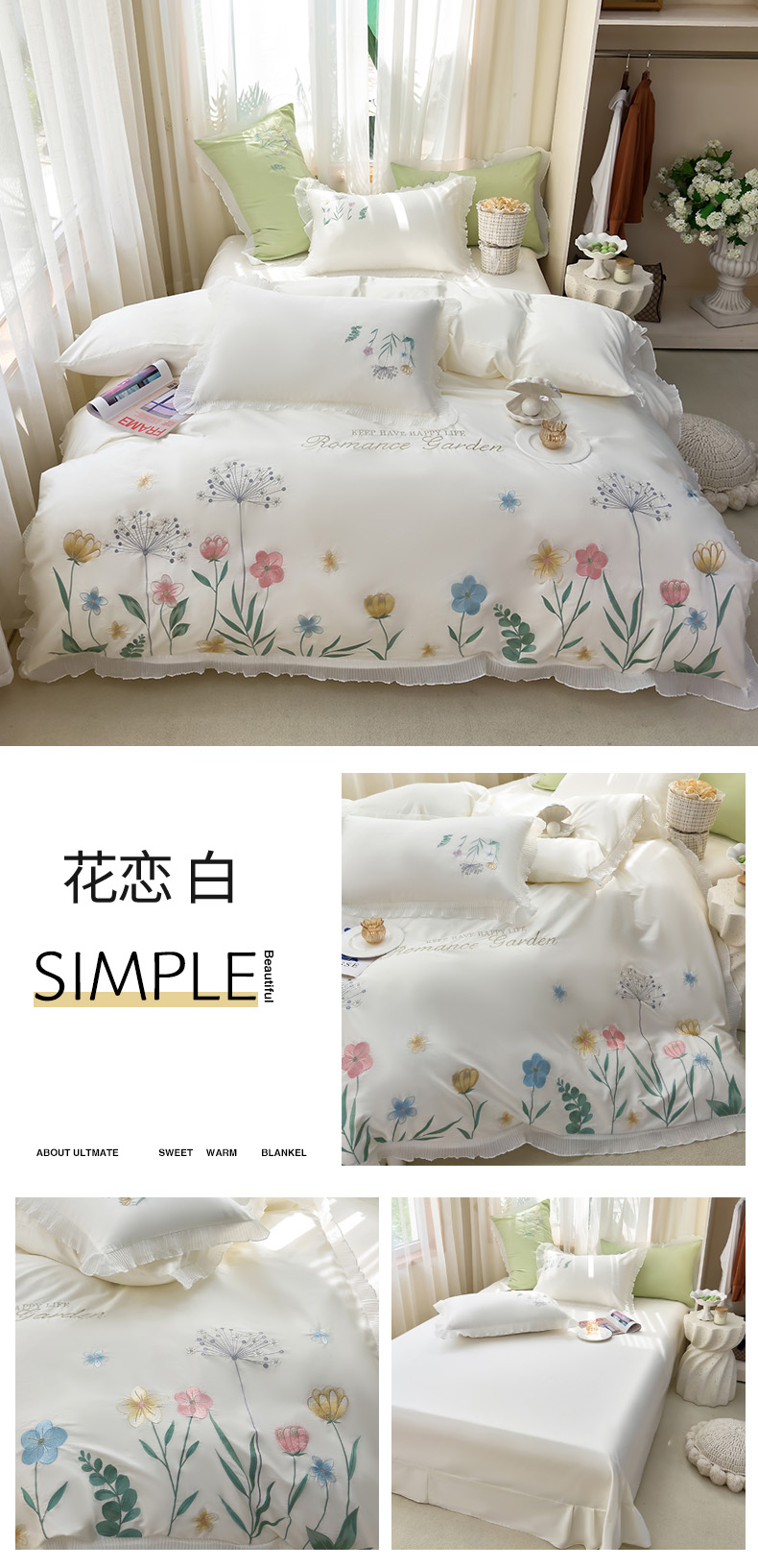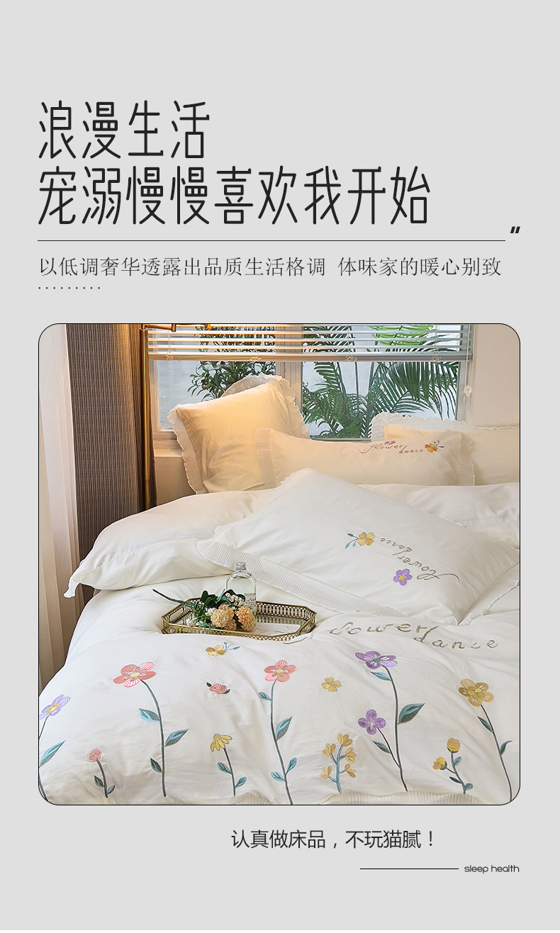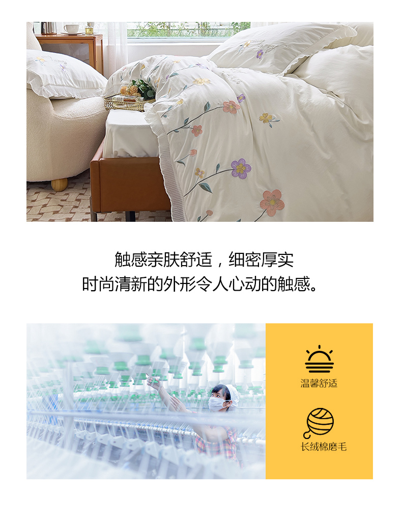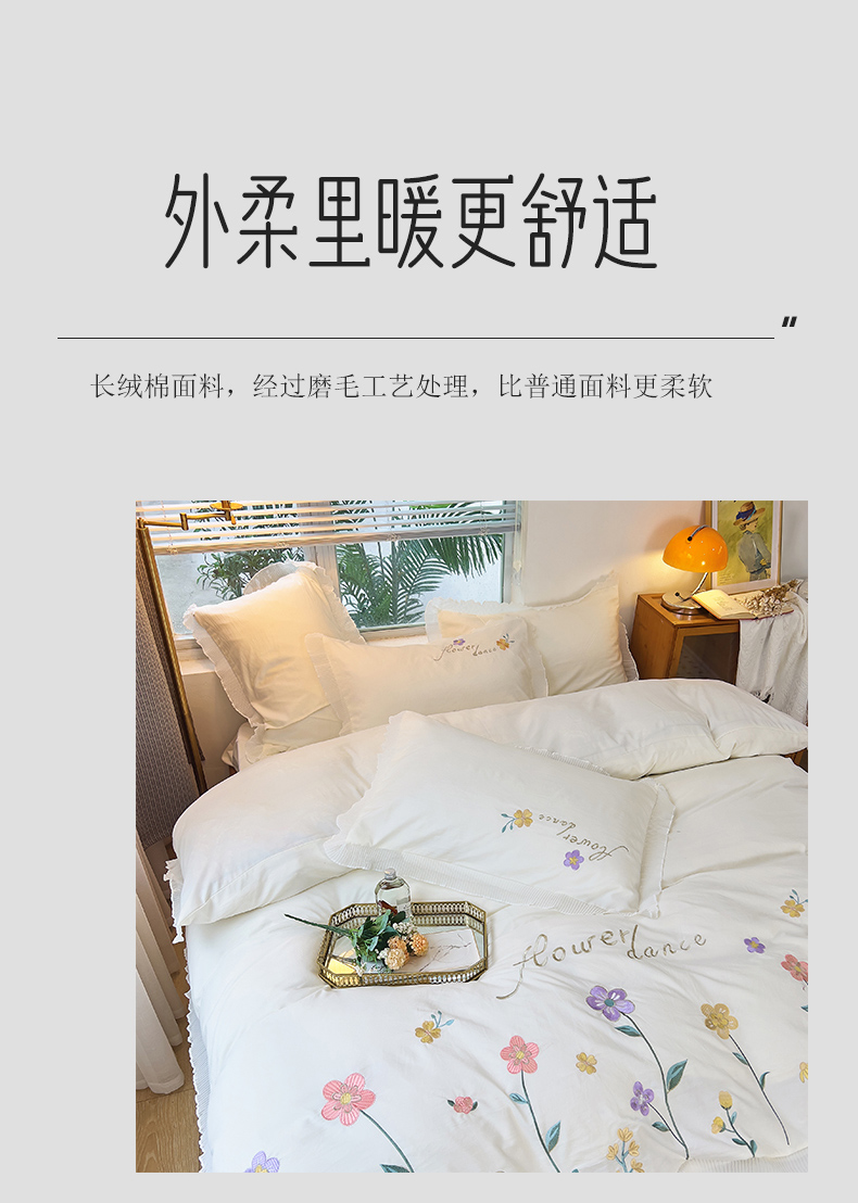 商品名称:青泽家纺 2025新款母婴级ins风韩版绣花荷叶边水洗棉磨毛四件套 缤纷花园白
