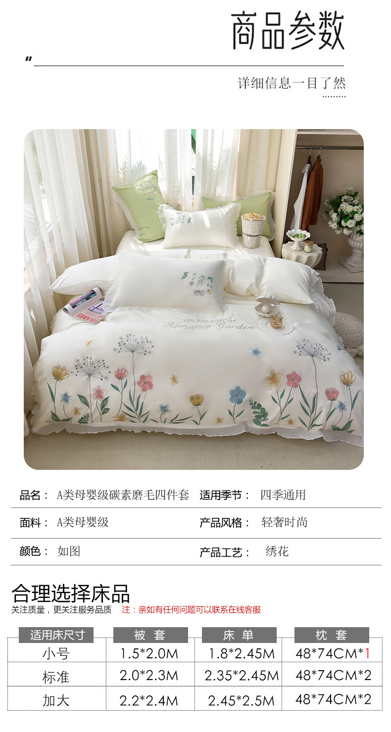 商品名称:青泽家纺 2025新款母婴级ins风韩版绣花荷叶边水洗棉磨毛四件套 花恋 白