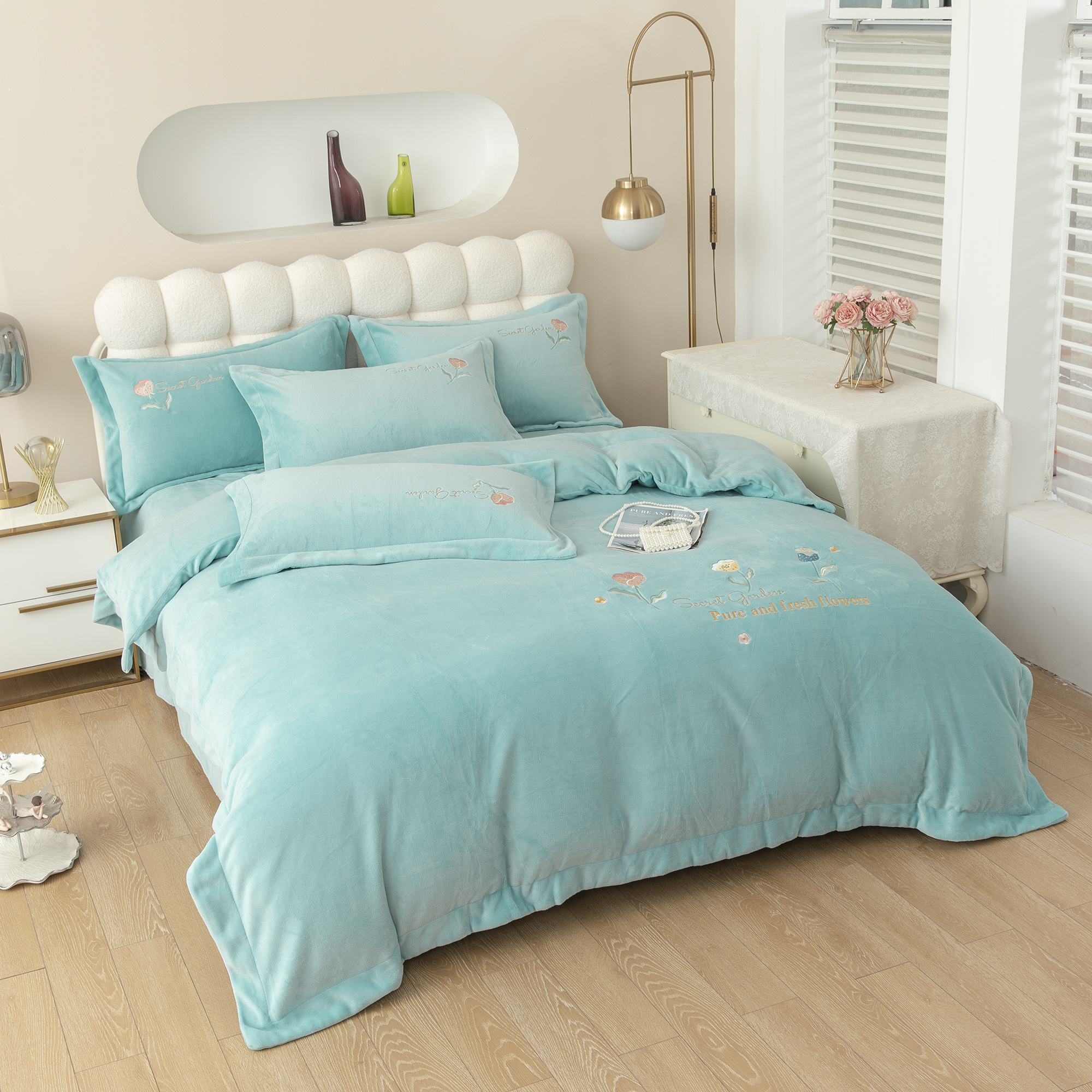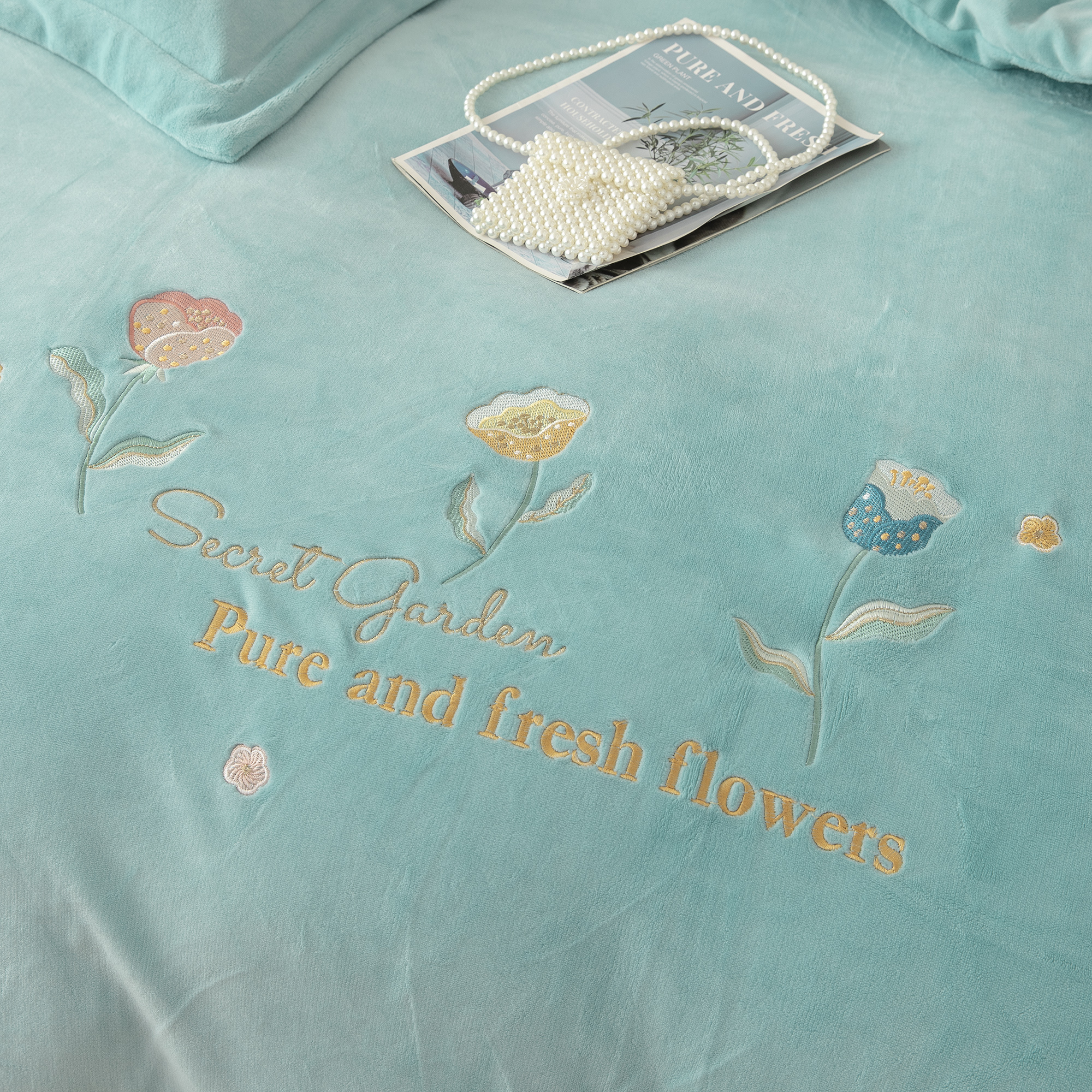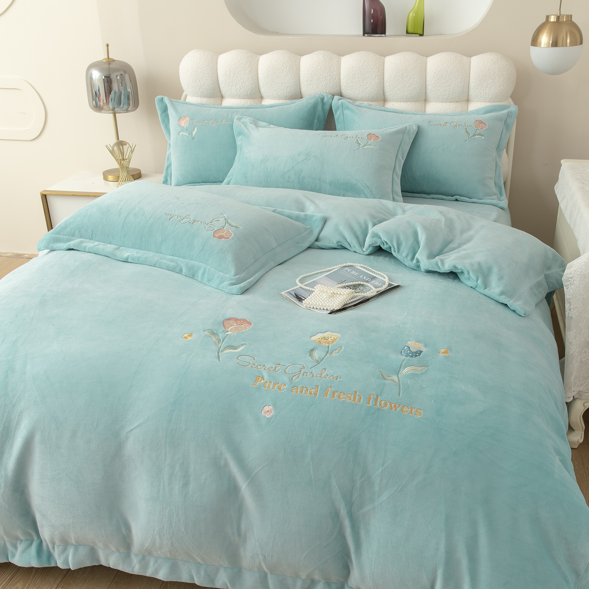 贝尔 2025新款纯色高克重牛奶绒刺绣四件套-羽魅 羽魅-浅绿,羽魅-浅绿