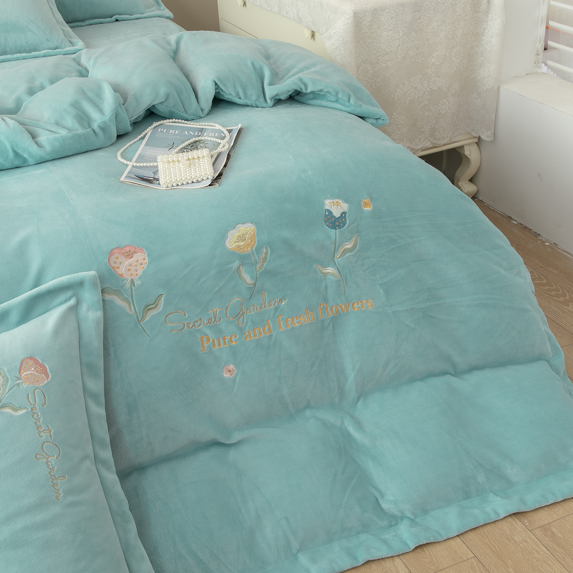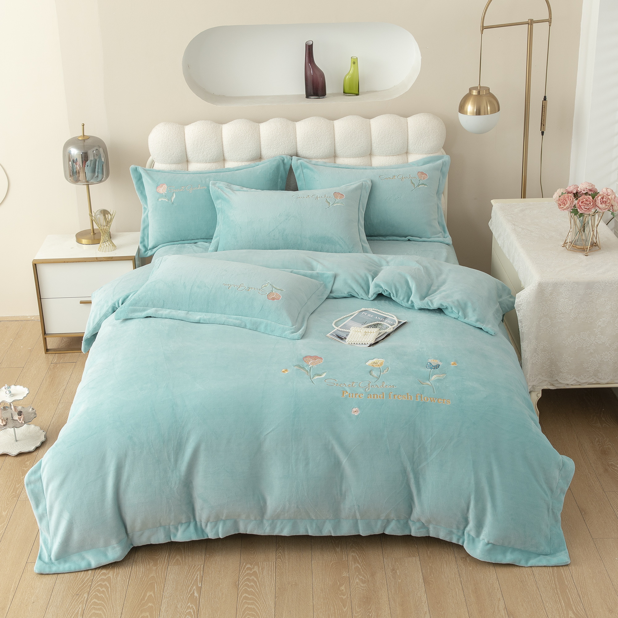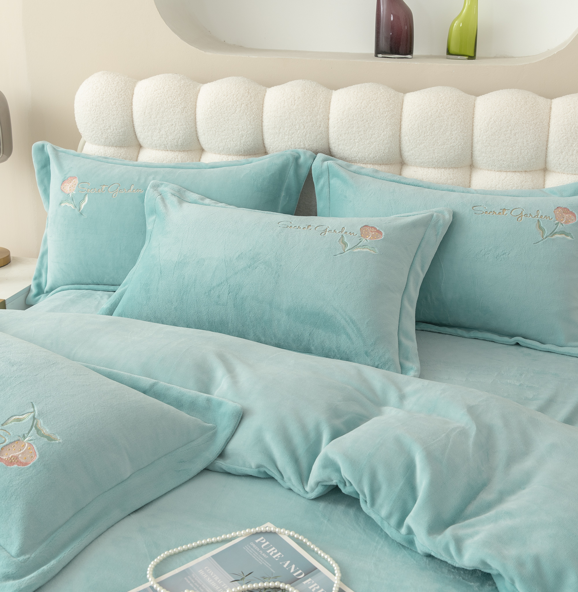 贝尔 2025新款纯色高克重牛奶绒刺绣四件套-羽魅 羽魅-浅绿,羽魅-浅绿