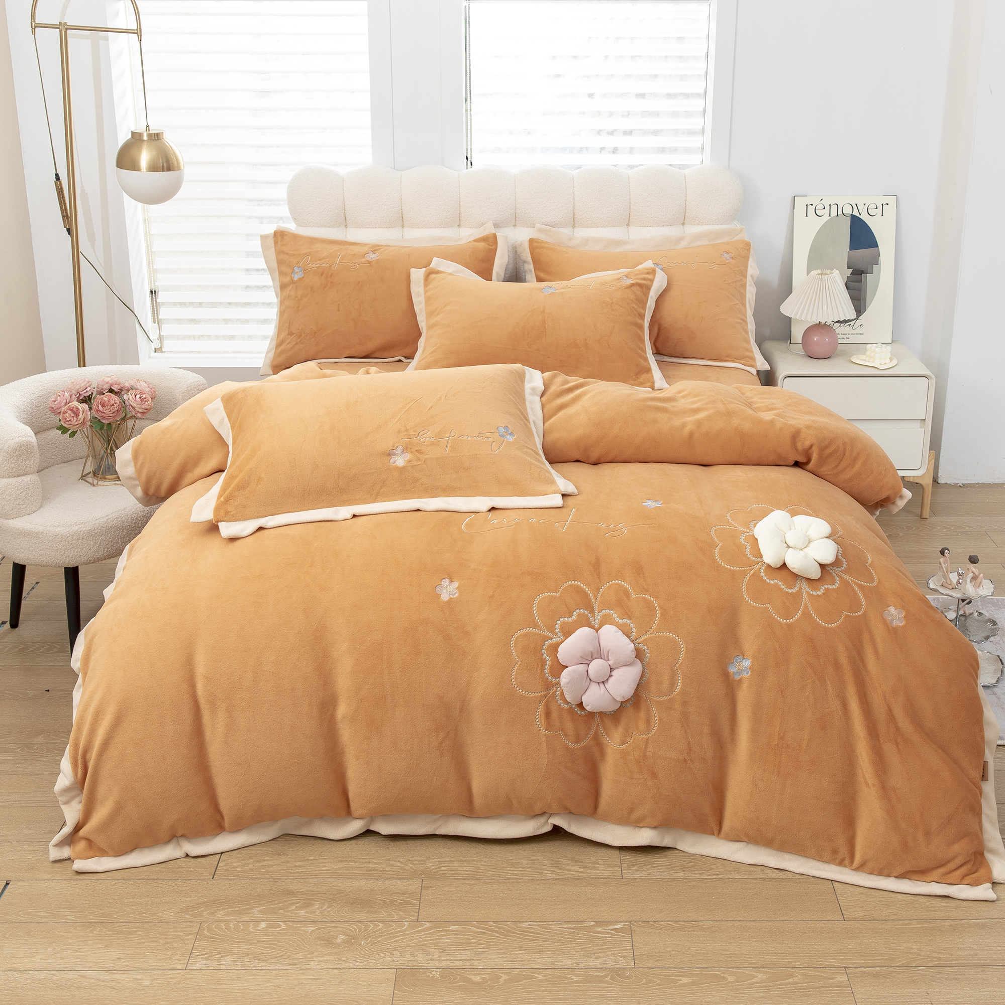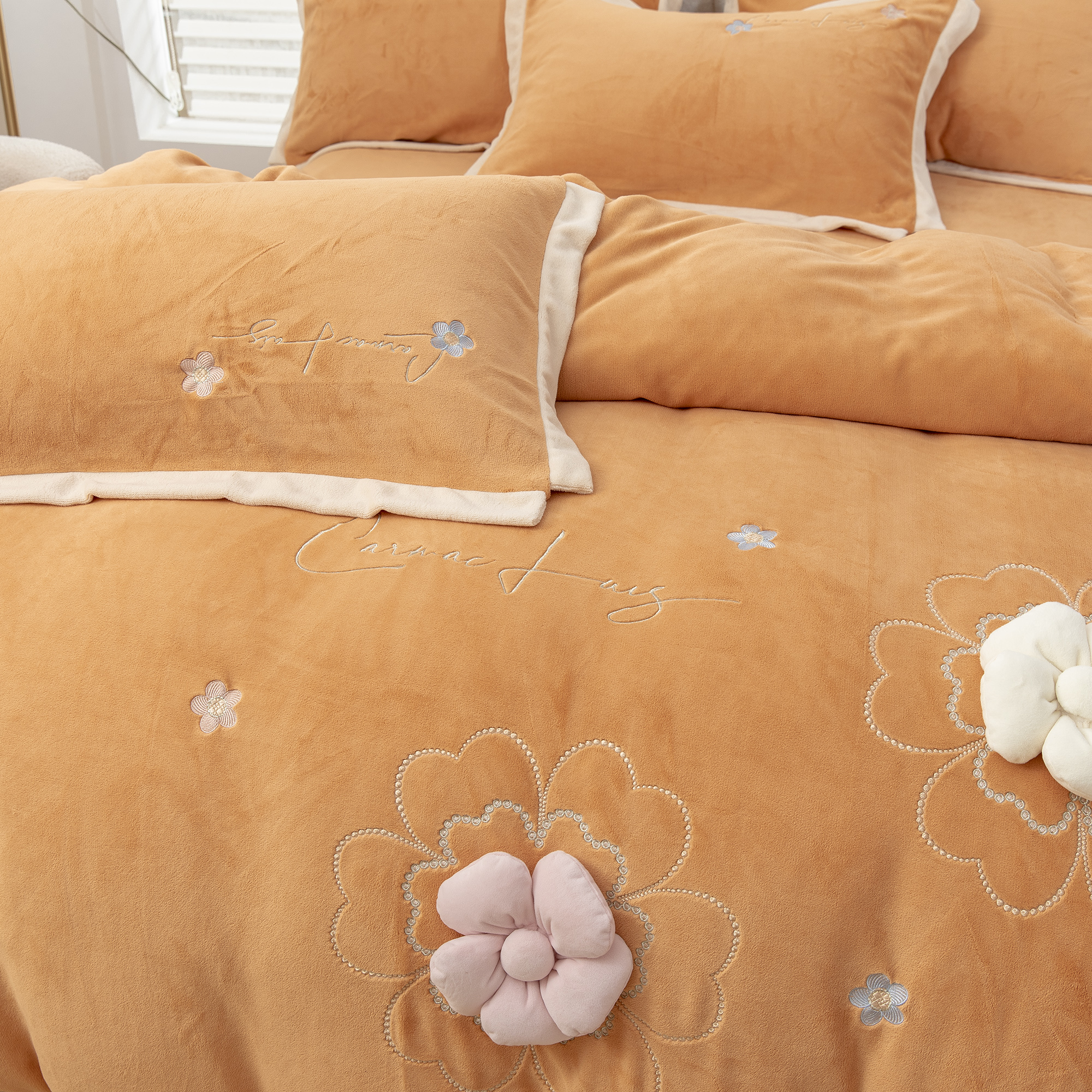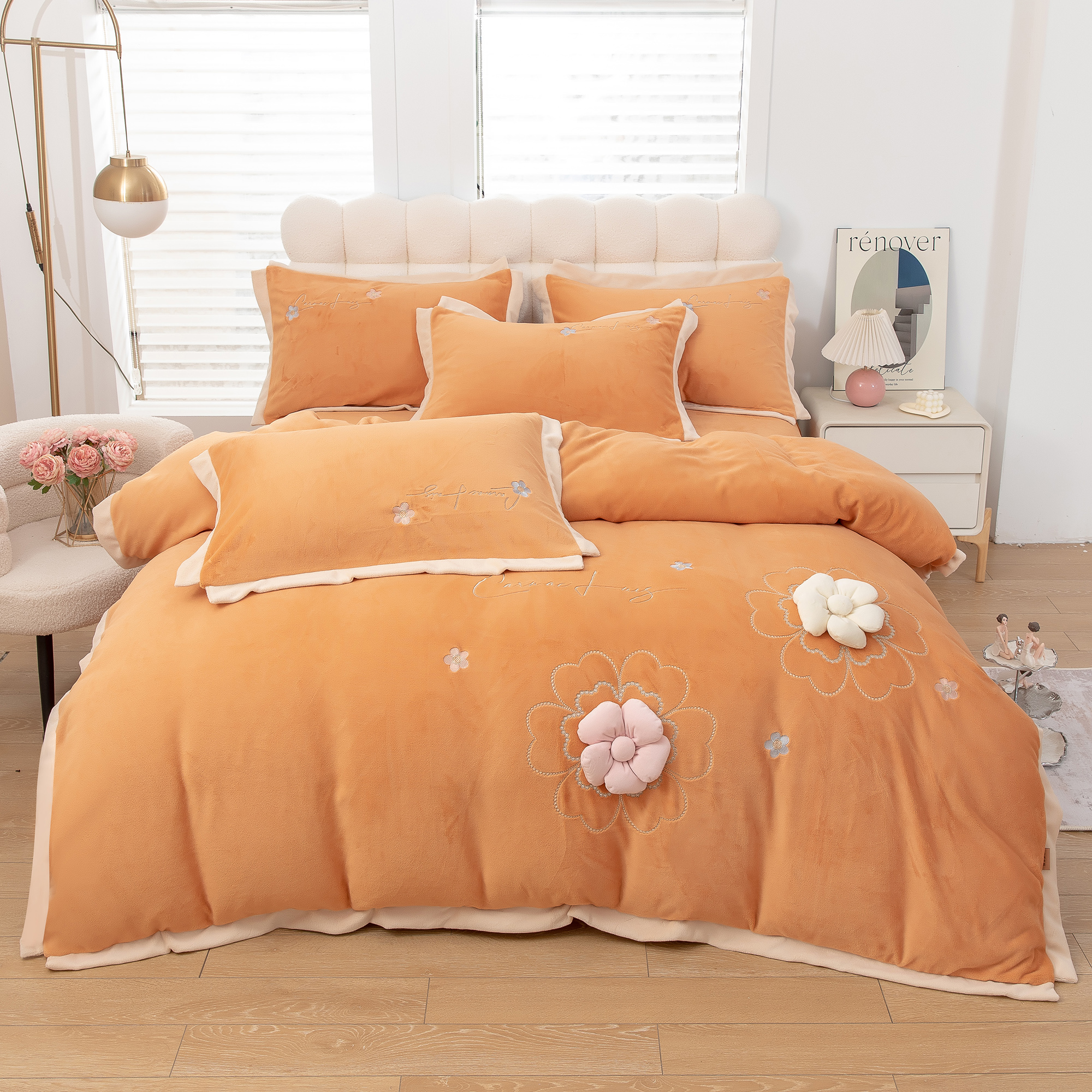 商品名称:贝尔 2025新款花之语-纯色高克重全消光蚕丝绒(赠送拎袋)-段角刺绣四件套 桔色
