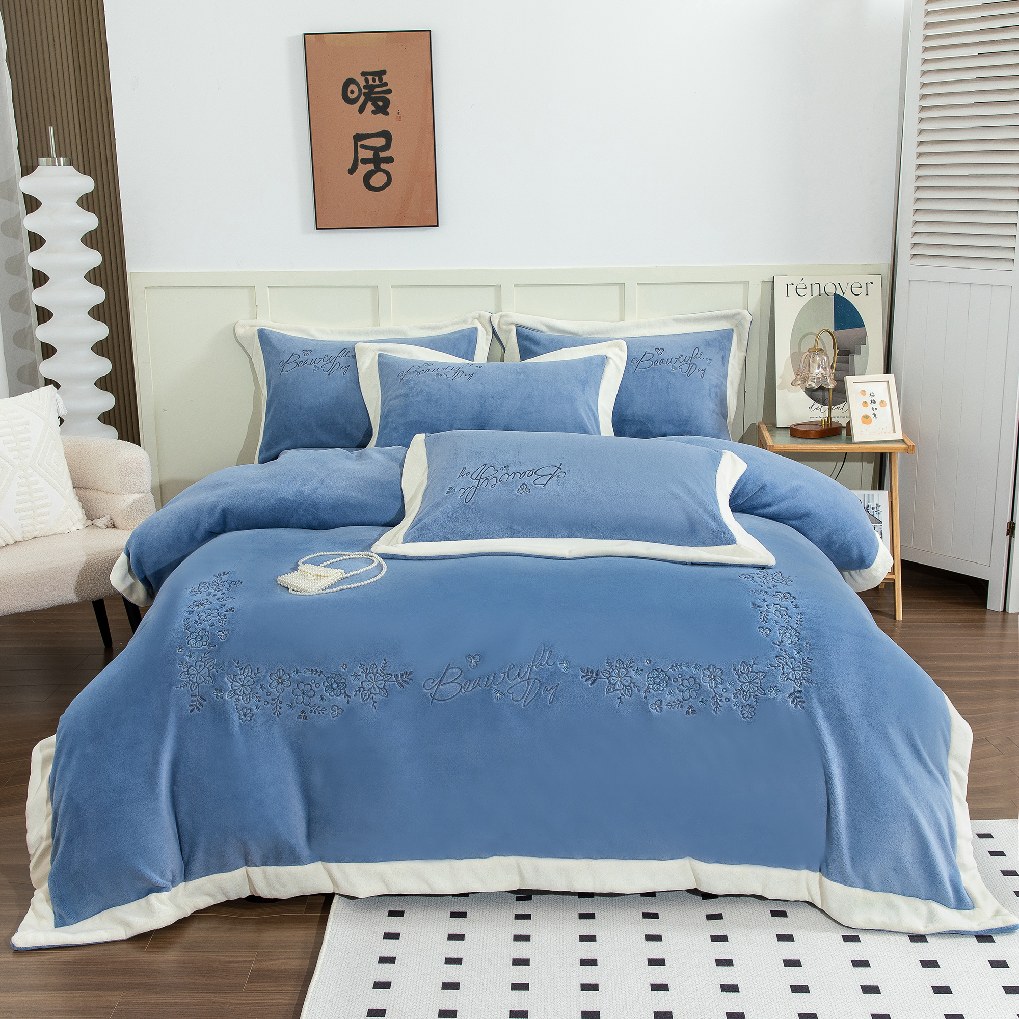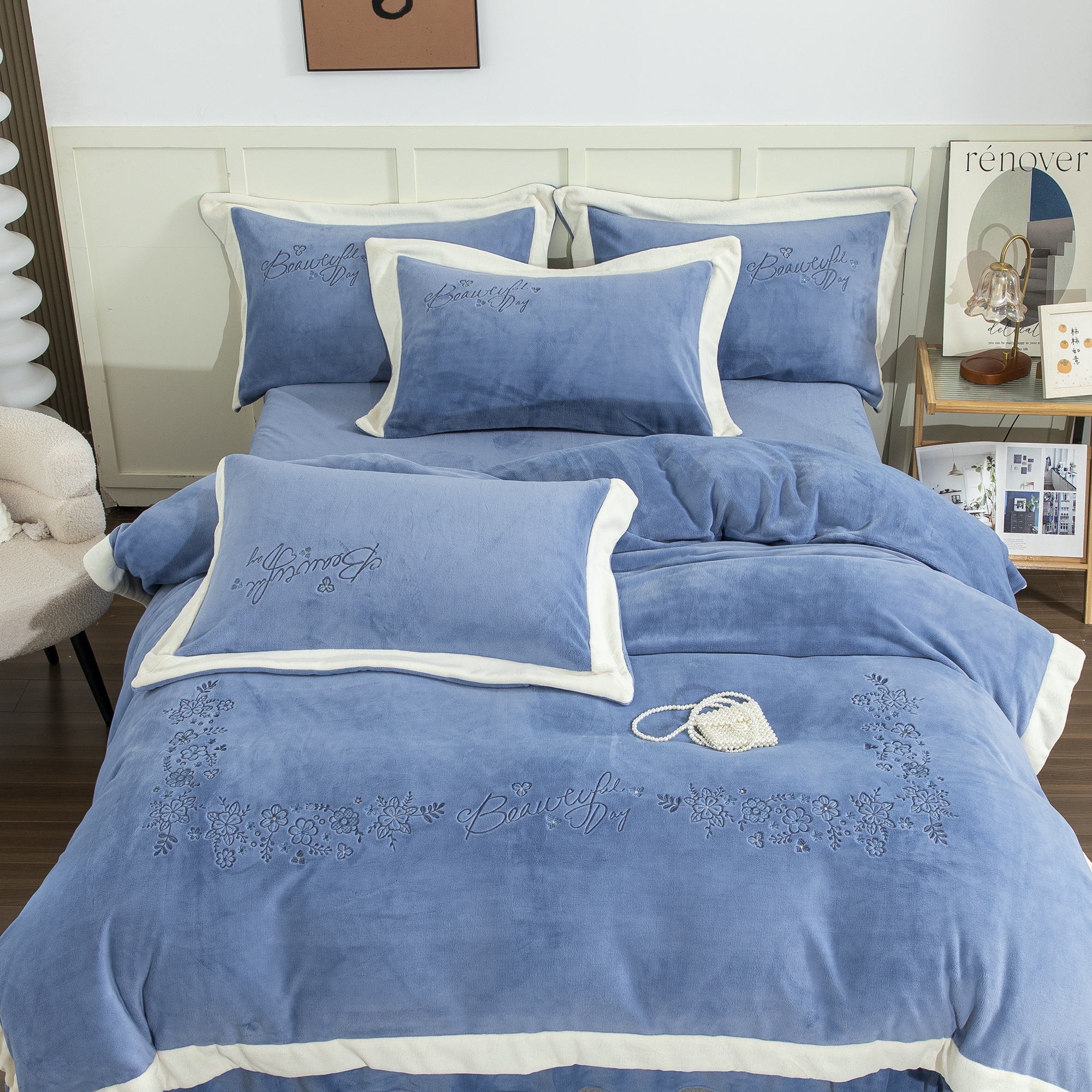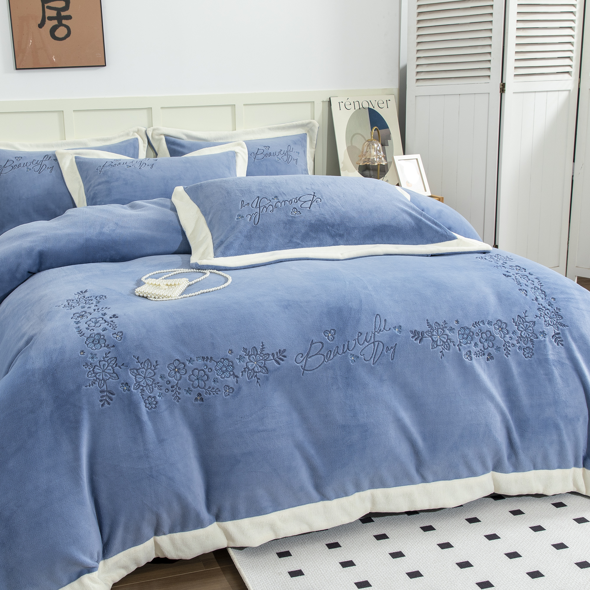 贝尔 2025新款纯色高克重牛奶绒刺绣四件套-羽魅 羽魅-蓝色,羽魅-蓝色
