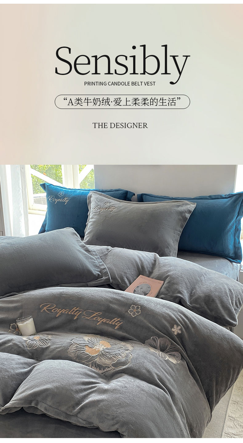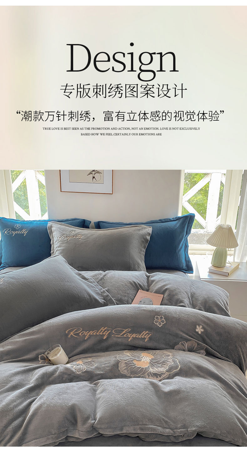 商品名称:悦织湾家纺 2025新款绣花200克重牛奶绒四件套刺绣3.5万针7斤重高密加厚保暖跨境专供外贸出口电商热销款 花语-高级灰