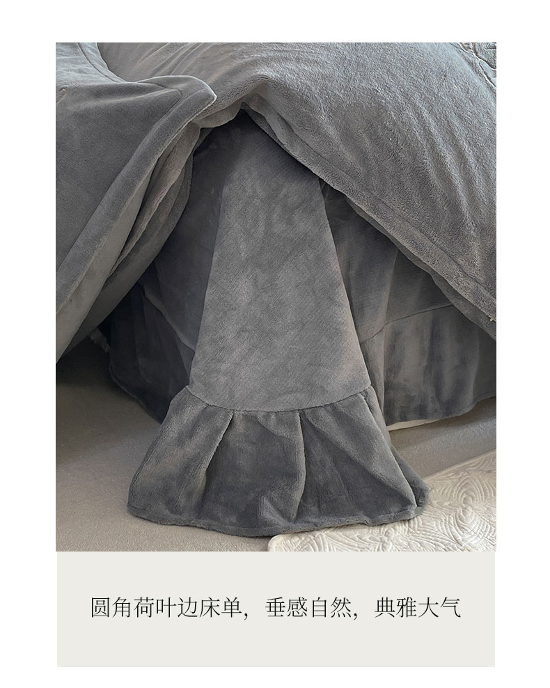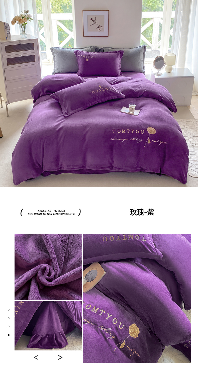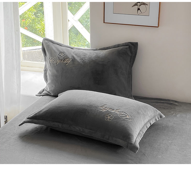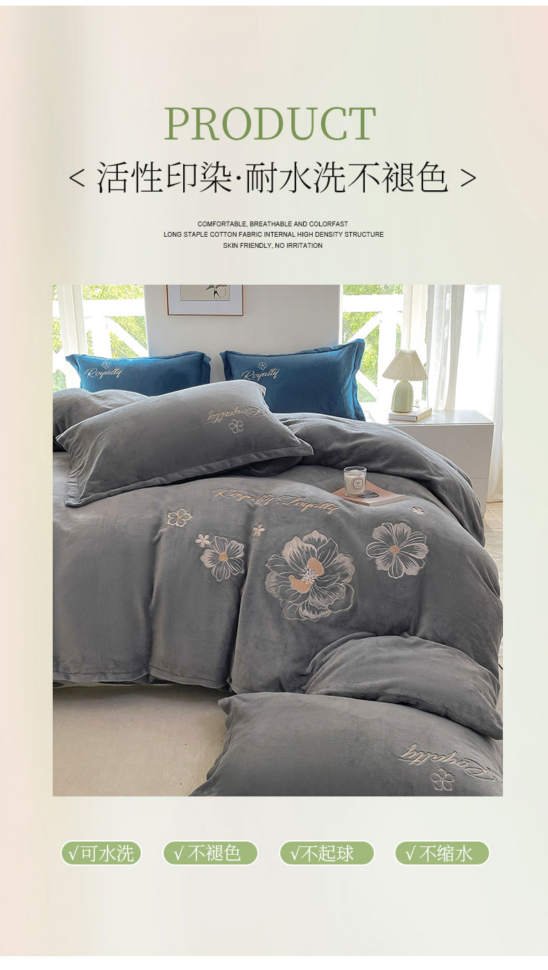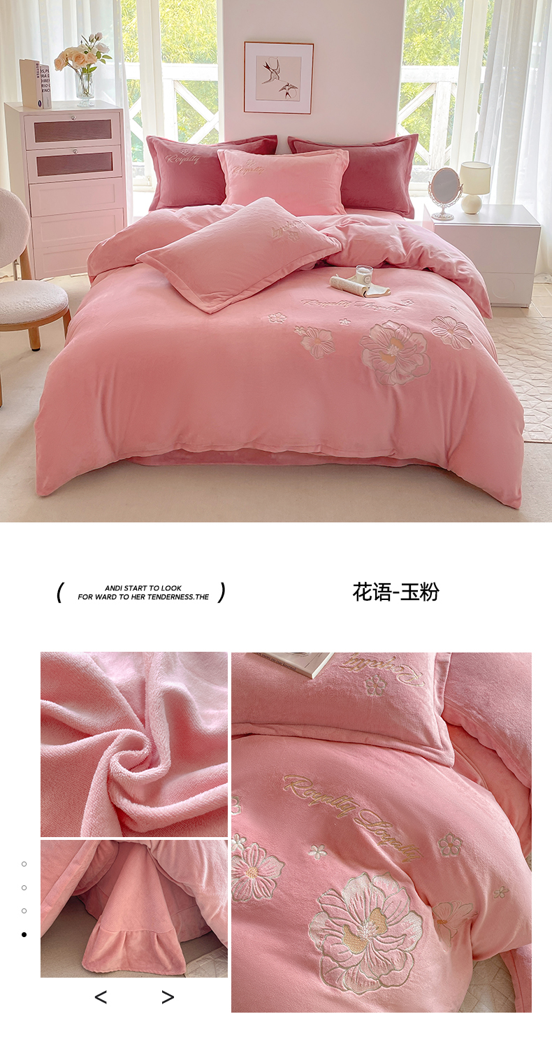 悦织湾家纺 2025新款绣花200克重牛奶绒四件套刺绣3.5万针7斤重高密加厚保暖跨境专供外贸出口电商热销款 花语-高级灰