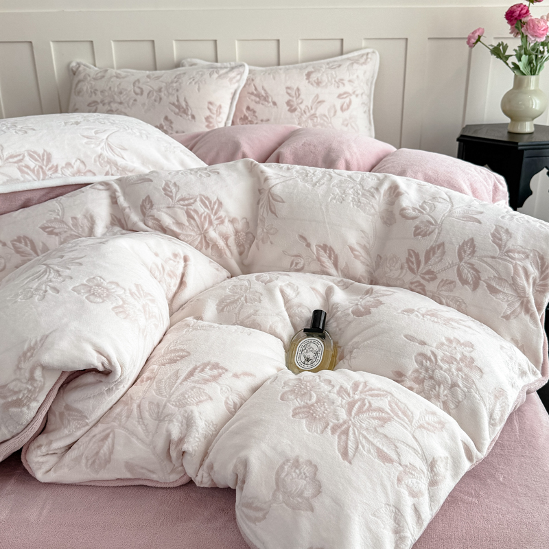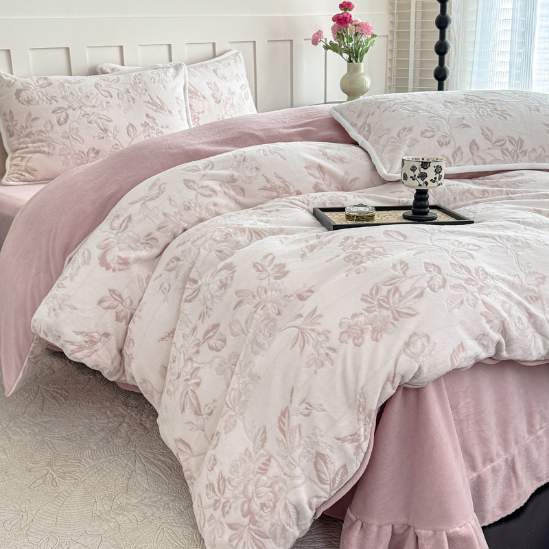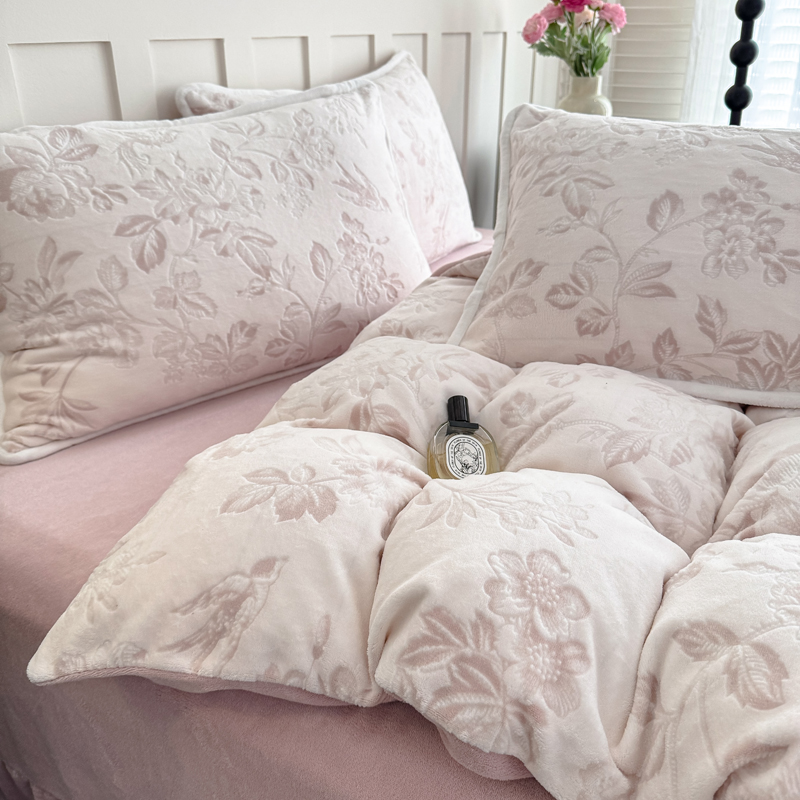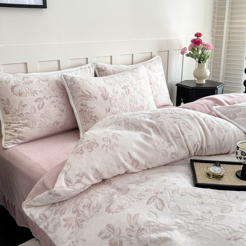 赛丽雅 2025新款包边雕花烂花牛奶绒四件套 花季-粉