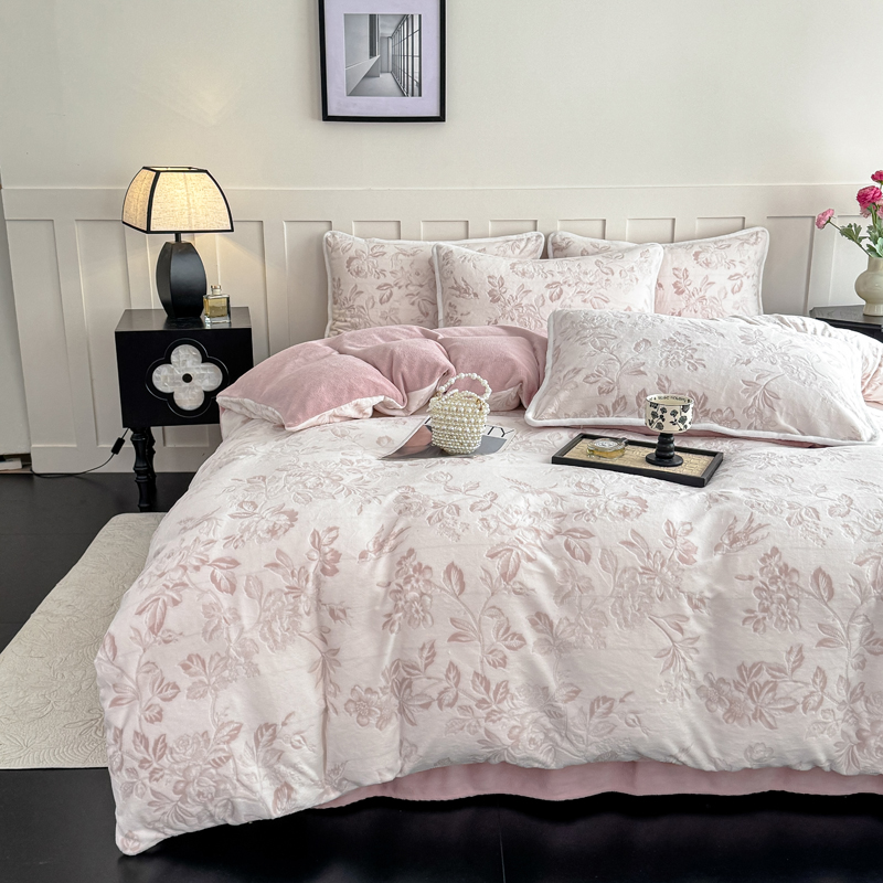 商品名称:赛丽雅 2025新款包边雕花烂花牛奶绒四件套 花季-粉