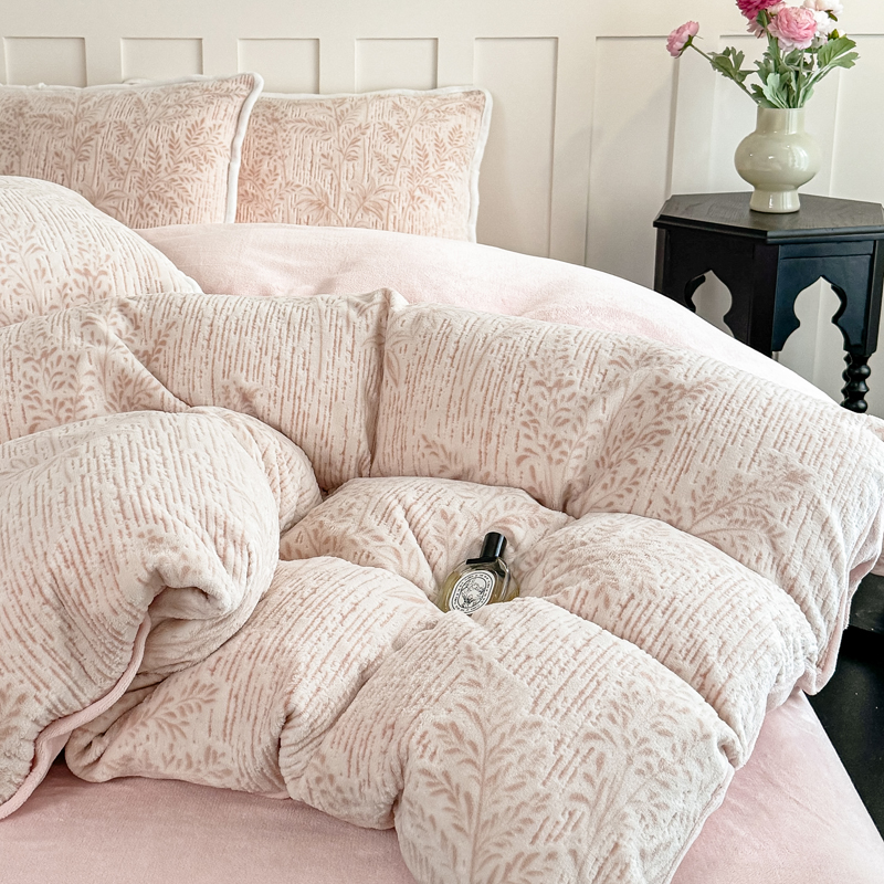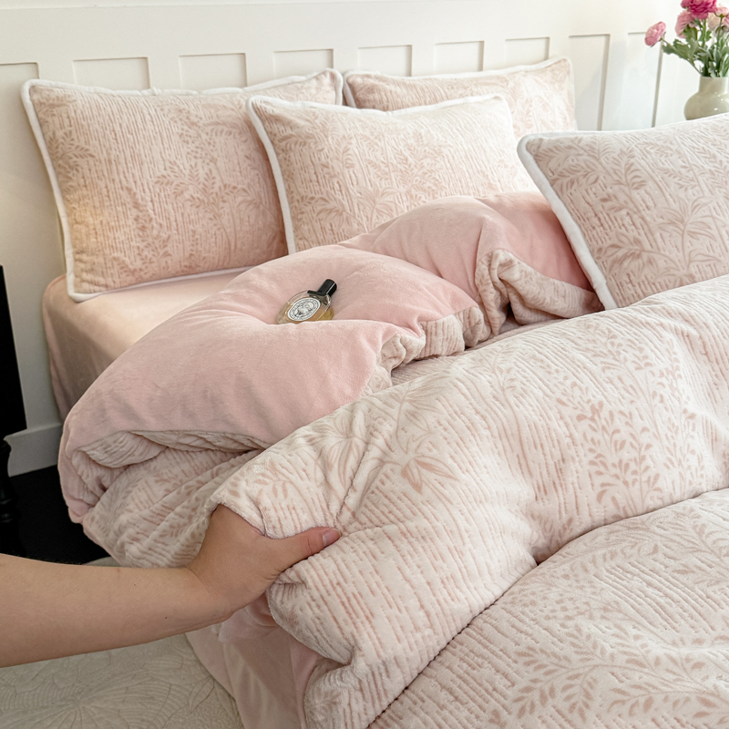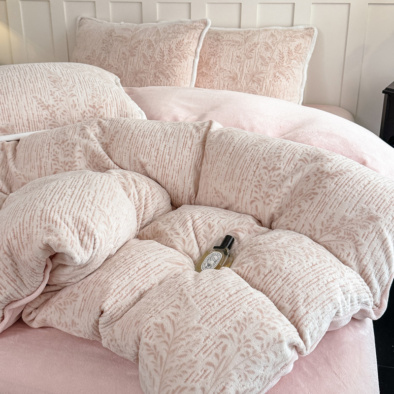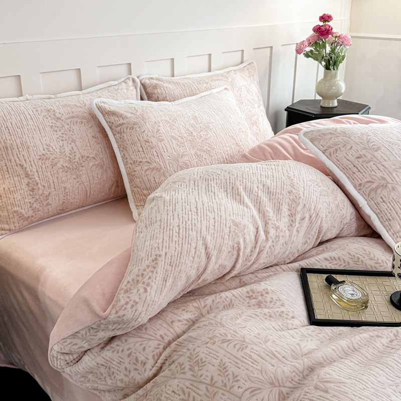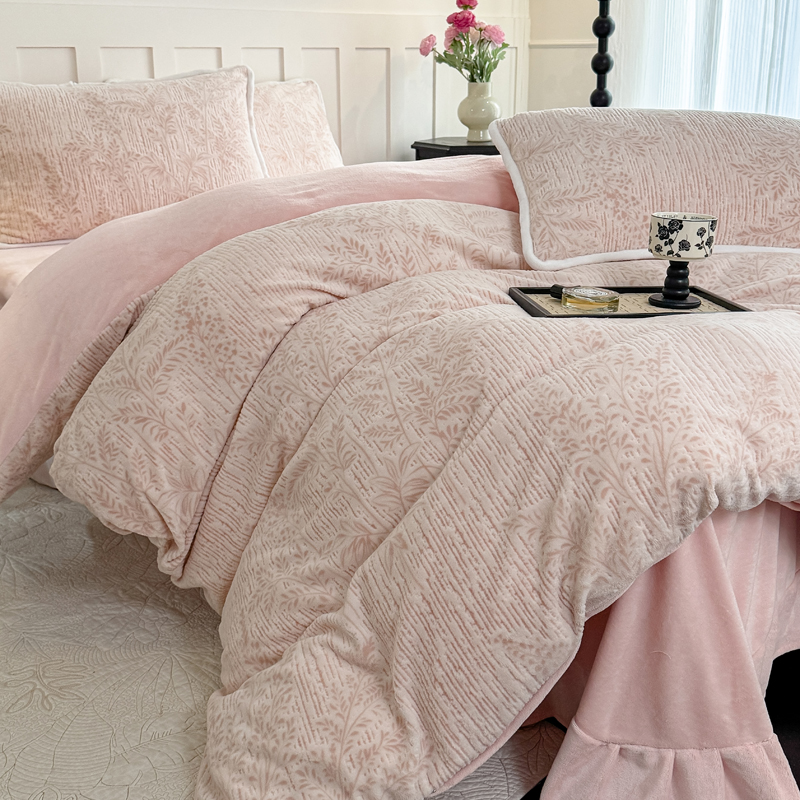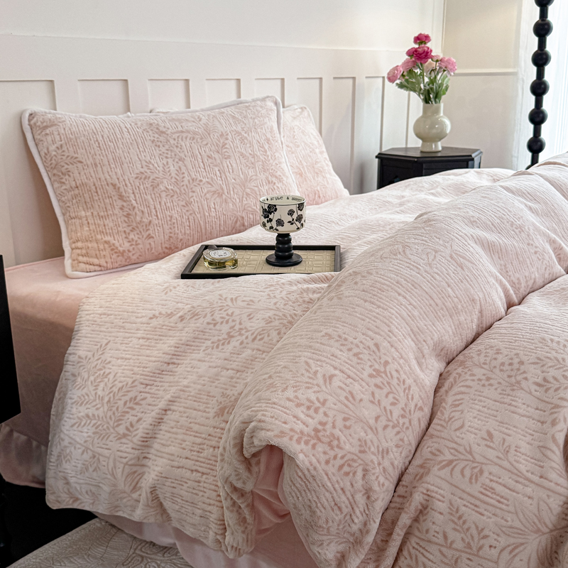 赛丽雅 2025新款包边雕花烂花牛奶绒四件套 长夏叶曼-浅桔